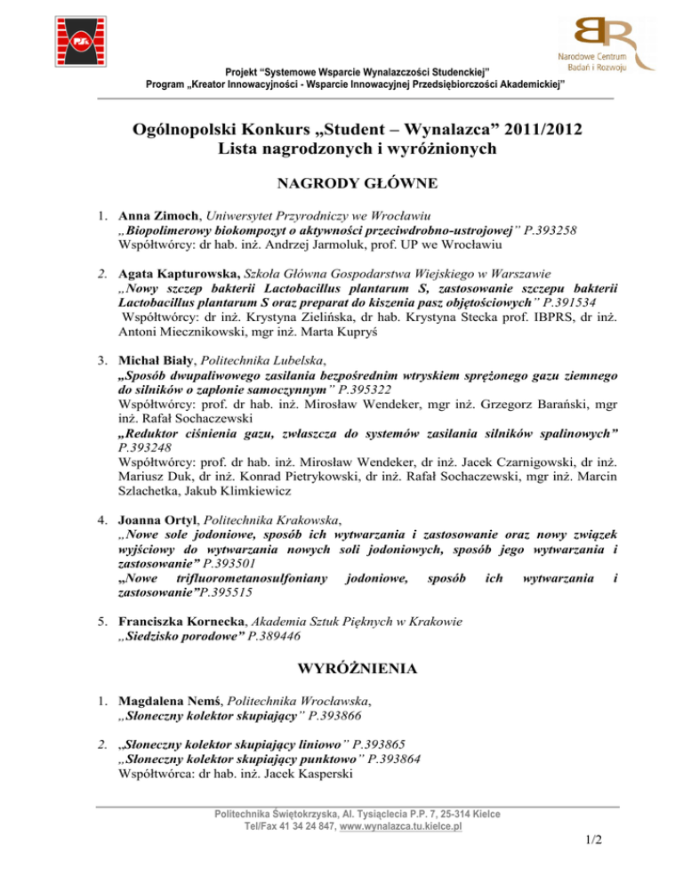 Projekt “Systemowe Wsparcie Wynalazczości Studenckiej” Program „Kreator Innowacyjności - Wsparcie Innowacyjnej Przedsiębiorczości Akademickiej” Ogólnopolski Konkurs „Student – Wynalazca” 2011/2012 Lista nagrodzonych i wyróżnionych NAGRODY GŁÓWNE 1. Anna Zimoch, Uniwersytet Przyrodniczy we Wrocławiu „Biopolimerowy biokompozyt o aktywności przeciwdrobno-ustrojowej” P.393258 Współtwórcy: dr hab. inż. Andrzej Jarmoluk, prof. UP we Wrocławiu 2. Agata Kapturowska, Szkoła Główna Gospodarstwa Wiejskiego w Warszawie „Nowy szczep bakterii Lactobacillus plantarum S, zastosowanie szczepu bakterii Lactobacillus plantarum S oraz preparat do kiszenia pasz objętościowych” P.391534 Współtwórcy: dr inż. Krystyna Zielińska, dr hab. Krystyna Stecka prof. IBPRS, dr inż. Antoni Miecznikowski, mgr inż. Marta Kupryś 3. Michał Biały, Politechnika Lubelska, „Sposób dwupaliwowego zasilania bezpośrednim wtryskiem sprężonego gazu ziemnego do silników o zapłonie samoczynnym” P.395322 Współtwórcy: prof. dr hab. inż. Mirosław Wendeker, mgr inż. Grzegorz Barański, mgr inż. Rafał Sochaczewski „Reduktor ciśnienia gazu, zwłaszcza do systemów zasilania silników spalinowych” P.393248 Współtwórcy: prof. dr hab. inż. Mirosław Wendeker, dr inż. Jacek Czarnigowski, dr inż. Mariusz Duk, dr inż. Konrad Pietrykowski, dr inż. Rafał Sochaczewski, mgr inż. Marcin Szlachetka, Jakub Klimkiewicz 4. Joanna Ortyl, Politechnika Krakowska, „Nowe sole jodoniowe, sposób ich wytwarzania i zastosowanie oraz nowy związek wyjściowy do wytwarzania nowych soli jodoniowych, sposób jego wytwarzania i zastosowanie” P.393501 „Nowe trifluorometanosulfoniany jodoniowe, sposób ich wytwarzania i zastosowanie”P.395515 5. Franciszka Kornecka, Akademia Sztuk Pięknych w Krakowie „Siedzisko porodowe” P.389446 WYRÓŻNIENIA 1. Magdalena Nemś, Politechnika Wrocławska, „Słoneczny kolektor skupiający” P.393866 2. „Słoneczny kolektor skupiający liniowo” P.393865 „Słoneczny kolektor skupiający punktowo” P.393864 Współtwórca: dr hab. inż. Jacek Kasperski Politechnika Świętokrzyska, Al. Tysiąclecia P.P. 7, 25-314 Kielce Tel/Fax 41 34 24 847, www.wynalazca.tu.kielce.pl 1/2[Wpisz tekst] Projekt “Systemowe Wsparcie Wynalazczości Studenckiej” Program „Kreator Innowacyjności - Wsparcie Innowacyjnej Przedsiębiorczości Akademickiej” 3. Tomasz Wdowik, Instytut Chemii Organicznej Polskiej Akademii Nauk/student Politechniki Warszawskiej „Kompleks rutenu lub osmu, sposób jego wytwarzania oraz zastosowanie” P.396439 Współtwórcy: Cezary Samojłowicz, Magdalena Jawiczuk, prof.dr hab. Karol Grela, 4. Piotr Kędzia, Piotr Szczepanik , Piotr Szulc, Paweł Malinowski, Politechnika Poznańska „Sposób wytwarzania podłużnego gradientu pól magnetycznych o dużej jednorodności w obrębie badanego obiektu oraz układ do jego realizacji” P.397916 prof. dr hab. Eugeniusz Szcześniak, prof. dr hab. Jan Jurga, prof. dr hab. Kazimierz Jurga, dr Tomasz Czechowski, dr Mikołaj Baranowski, 5. Błażej Tomiczek, Politechnika Śląska „Nanostrukturalny materiał kompozytowy o osnowie stopów aluminium do przeróbki plastycznej oraz sposób jego wytwarzania” P.394587 Współtwórcy: prof. dr hab. inż. Leszek A. Dobrzański dr h.c., dr inż. Marcin Adamiak, dr inż. Grzegorz Matula, dr inż. Józef Sołtys 6. Artur Gmerek, Politechnika Łódzka „Robot do rehabilitacji kończyny górnej”P.394910 Współtwórca: prof. dr hab. inż. Edward Jezierski 6. Tomasz Wdowik, , Politechnika Rzeszowska/student Politechniki Warszawskiej „Nowy związek, pochodna alkoholoaminy i jej optycznie enancjomery”PL207979 Współtwórca: dr hab. Groszek Grażyna czynne 7. Łukasz Piszczyk, Magdalena Danowska, Politechnika Gdańska „Ekologiczna sztywna pianka poliuretanowa” P.392064 Współtwórca: dr hab. inż. Józef Tadeusz Haponiuk, dr inż. Michał Strankowski „Ekologiczna sztywna pianka poliuretanowa” P.392065 Współtwórca: dr hab. inż. Józef Tadeusz Haponiuk, dr inż. Michał Strankowski 8. Wojciech Sadkowski, Politechnika Świętokrzyska „Silnik cieplny Stirlinga” P.397384 Współtwórca: dr inż. Krzysztof Ludwinek 9. Habdank Józef AGH w Krakowie, „Metoda produkcji samodiagnozujących elementów dla mikroelektromechanicznych systemów bazowanych na nanokompozytach Grafenowych”, zgłoszenie w Urzędzie Patentowym w Danii nr 0031 „Sposób wytwarzania mikronanoczujnika” P.381684 „Sposób wytwarzania nanokompozytu” P.388516 Współtwórca: dr inż. Tadeusz Habdank-Wojewódzki, Serdecznie gratulujemy wszystkim Twórcom! Politechnika Świętokrzyska, Al. Tysiąclecia P.P. 7, 25-314 Kielce Tel/Fax 41 34 24 847, www.wynalazca.tu.kielce.pl 2/2[Wpisz tekst]