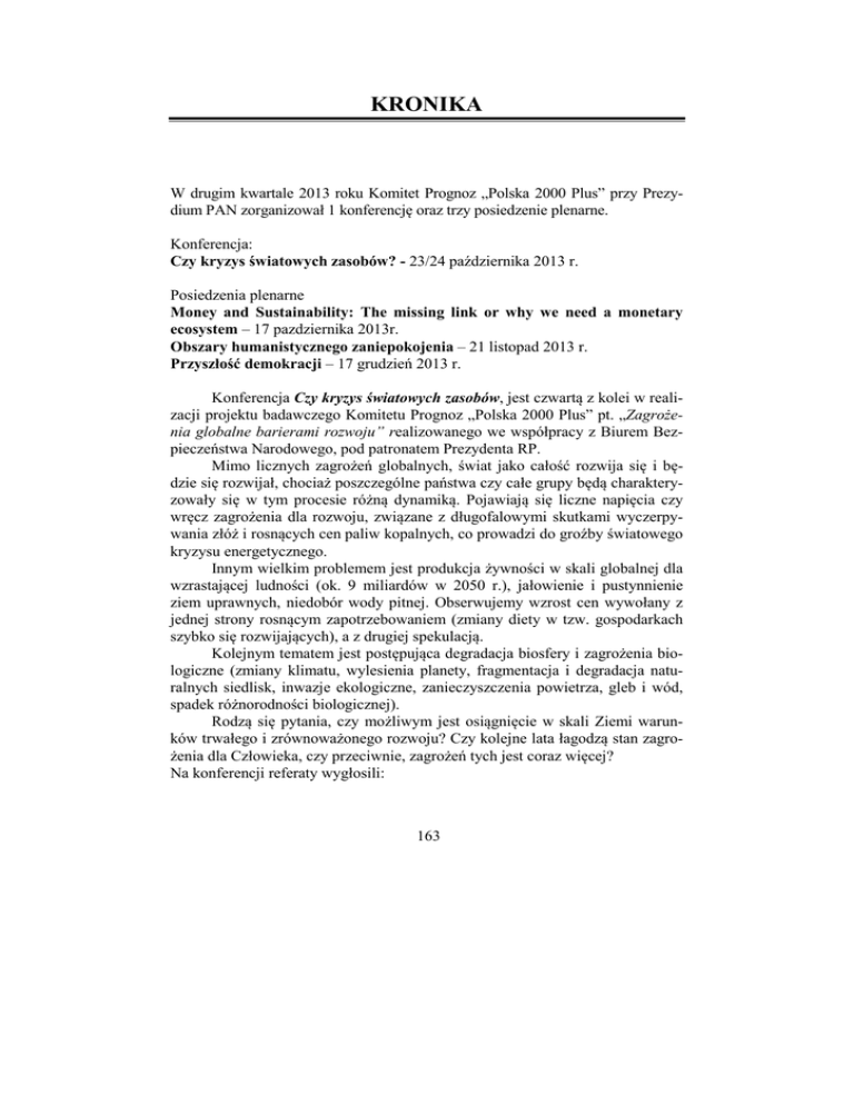 KRONIKA W drugim kwartale 2013 roku Komitet Prognoz „Polska 2000 Plus” przy Prezydium PAN zorganizował 1 konferencję oraz trzy posiedzenie plenarne. Konferencja: Czy kryzys światowych zasobów? - 23/24 października 2013 r. Posiedzenia plenarne Money and Sustainability: The missing link or why we need a monetary ecosystem – 17 pazdziernika 2013r. Obszary humanistycznego zaniepokojenia – 21 listopad 2013 r. Przyszłość demokracji – 17 grudzień 2013 r. Konferencja Czy kryzys światowych zasobów, jest czwartą z kolei w realizacji projektu badawczego Komitetu Prognoz „Polska 2000 Plus” pt. „Zagrożenia globalne barierami rozwoju” realizowanego we współpracy z Biurem Bezpieczeństwa Narodowego, pod patronatem Prezydenta RP. Mimo licznych zagrożeń globalnych, świat jako całość rozwija się i będzie się rozwijał, chociaż poszczególne państwa czy całe grupy będą charakteryzowały się w tym procesie różną dynamiką. Pojawiają się liczne napięcia czy wręcz zagrożenia dla rozwoju, związane z długofalowymi skutkami wyczerpywania złóż i rosnących cen paliw kopalnych, co prowadzi do groźby światowego kryzysu energetycznego. Innym wielkim problemem jest produkcja żywności w skali globalnej dla wzrastającej ludności (ok. 9 miliardów w 2050 r.), jałowienie i pustynnienie ziem uprawnych, niedobór wody pitnej. Obserwujemy wzrost cen wywołany z jednej strony rosnącym zapotrzebowaniem (zmiany diety w tzw. gospodarkach szybko się rozwijających), a z drugiej spekulacją. Kolejnym tematem jest postępująca degradacja biosfery i zagrożenia biologiczne (zmiany klimatu, wylesienia planety, fragmentacja i degradacja naturalnych siedlisk, inwazje ekologiczne, zanieczyszczenia powietrza, gleb i wód, spadek różnorodności biologicznej). Rodzą się pytania, czy możliwym jest osiągnięcie w skali Ziemi warunków trwałego i zrównoważonego rozwoju? Czy kolejne lata łagodzą stan zagrożenia dla Człowieka, czy przeciwnie, zagrożeń tych jest coraz więcej? Na konferencji referaty wygłosili: 163 KRONIKA Pozyskiwanie energii okiem technologa. Na co liczymy – Janusz Lewandowski, (Pol. Warszawska) Apetyt energetyczny cywilizacji a szanse jej przetrwania – Marek Bartosik, (Pol. Łódzka): Dlaczego węgiel będzie w Polsce głównym surowcem energetycznym do 2050? - Andrzej Sikora, (Inst. Strategii Energetycznych): Niskoemisyjna Polska 2050 - Maciej Bukowski, (Instytut Badań Strukturalnych): Bezpieczeństwo podaży surowców nieenergetycznych i ich znaczenie w rozwoju gospodarki Unii Europejskiej i Polski - J. Kulczycka (AGH), B. Radwanek-Bąk (PIG-PIB): Współczesna różnorodność biologiczna – jej znaczenie dla człowieka, zagrożenia i szanse ochrony - Ewa Symonides, (Uniw. Warszawski) Rolnictwo, produkcja żywności i perspektywy wyżywienia Świata - Franciszek Tomczak, (Inst. Ekonomiki Rolnictwa i Gospodarki Żywnościowej) Zasoby wodne dziś i jutro, a perspektywy wyżywienia Świata - Janusz Kindler, (Pol. Warszawska), GMO – szansa, czy zagrożenie – Piotr Węgleński, (Unii. Warszawski): Recepta na zachowanie zasobów – Andrzej Jagusiewicz, (Gł. Inspektor Ochrony Środowiska) Biosfera: historia i współczesność – Leszek Kuźnicki, (PAN), Perspektywy ograniczenia konsumpcji zasobów naturalnych do 2050 r. – Konrad Prandecki (Inst. Ekonomiki Rolnictwa i Gospodarki Żywnościowej). Transformacja gospodarki światowej. W poszukiwaniu nowej filozofii - Julian Auleytner (Wyższa Szkoła Pedagogiczna) Marnotrawstwo zasobów jako przejaw kryzysu systemowego – Jerzy Kleer, Komitet Prognoz „Polska 2000 Plus” Czy ochrona środowiska musi tyle kosztować? – Tomasz Żylicz (Uniw. Warszawski) Warunki trwałego i zrównoważonego rozwoju ludzkości - Lucjan Pawłowski, Artur Pawłowski (PAN): Realność trwałego i zrównoważonego rozwoju – perspektywa 2050 roku - Bohdan Wyżnikiewicz, (Instytut Badań nad Gospodarka Rynkową) Posiedzenia plenarne: Komitet Prognoz „Polska 2000 Plus” przy Prezydium PAN, Polskie Towarzystwo Ekonomiczne oraz Polskie Towarzystwo Współpracy z Klubem Rzymskim, zorganizowali plenarne posiedzenie w dniu 17 października 2013 r., na którym zaprezentował wykład Dr. Stefana Brunnhubera: Na temat: “Money and Sustainability: The missing link or why we need a monetary ecosystem”. 164 KRONIKA The lecture will present some of the underlying mechanisms inherent to financial crises and instability; describes the variables which make our current monetary system non-neutral with regards to human behavior; introduces a systems theory approach to elucidate the link between financial sustainability, resilience and efficiency; and proposes out of the box solutions for a common sustainable future. Stefan Brunnhuber, MD, PhD – is a psychiatrist and socio-economist focusing on the relation between international financial systems and regional social welfare. Member of the European Academy of Science and Arts (EASA), the Austrian Chapter of the Club of Rome (CoR). He most recently co-authored the book “Money and Sustainability: The missing link”. Currently Medical Director and CMO at the hospital for integral psychiatry in Saxonia (GER) and vice-chairman of the European Institute of Health (EiH). Posiedzenie plenarne „Obszary humanistycznegoio zaniepokojenia” poświęcone było uwydatnieniu ważnych obszarów edukacyjnej troski, które uzasadnione są powszechnie odczuwanym, wzmagającym się zagrożeniem podmiotowej tożsamości człowieka, samodzielności jego myślenia, wrażliwości i poczucia odpowiedzialności za podejmowane decyzje w świecie. Zaistniała potyrzeba wskazania na nieustającą potrzebę naprawy "skrzywionego drzewa edukacji”, w warunkach istniejącej „destrukcji i normatywności". Podstawą rozważań był tekst Ireny Wojnar pt. Pedagogika niepokoju. Program spotkania przewidywał indywidualne wypowiedzi rozszerzające problematykę tego tekstu, zgodnie z jego st