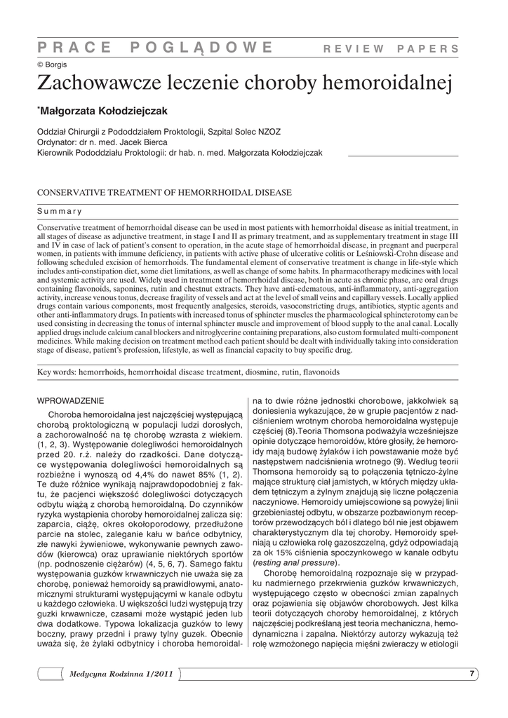 PRACE POGLĄDOWE REVIEW PAPERS © Borgis Zachowawcze leczenie choroby hemoroidalnej * Małgorzata Kołodziejczak Oddział Chirurgii z Pododdziałem Proktologii, Szpital Solec NZOZ Ordynator: dr n. med. Jacek Bierca Kierownik Pododdziału Proktologii: dr hab. n. med. Małgorzata Kołodziejczak Conservative treatment of hemorrhoidal disease Summary Conservative treatment of hemorrhoidal disease can be used in most patients with hemorrhoidal disease as initial treatment, in all stages of disease as adjunctive treatment, in stage I and II as primary treatment, and as supplementary treatment in stage III and IV in case of lack of patient’s consent to operation, in the acute stage of hemorrhoidal disease, in pregnant and puerperal women, in patients with immune deficiency, in patients with active phase of ulcerative colitis or Leśniowski-Crohn disease and following scheduled excision of hemorrhoids. The fundamental element of conservative treatment is change in life-style which includes anti-constipation diet, some diet limitations, as well as change of some habits. In pharmacotherapy medicines with local and systemic activity are used. Widely used in treatment of hemorrhoidal disease, both in acute as chronic phase, are oral drugs containing flavonoids, saponines, rutin and chestnut extracts. They have anti-edematous, anti-inflammatory, anti-aggregation activity, increase venous tonus, decrease fragility of vessels and act at the level of small veins and capillary vessels. Locally applied drugs contain various components, most frequently analgesics, steroids, vasoconstricting drugs, antibiotics, styptic agents and other anti-inflammatory drugs. In patients with increased tonus of sphincter muscles the pharmacological sphincterotomy can be used consisting in decreasing the tonus of internal sphincter muscle and improvement of blood supply to the anal canal. Locally applied drugs include calcium canal blockers and nitroglycerine containing preparations, also custom formulated multi-component medicines. While making decision on treatment method each patient should be dealt with individually taking into consideration stage of disease, patient’s profession, lifestyle, as well as financial capacity to buy specific drug. Key words: hemorrhoids, hemorrhoidal disease treatment, diosmine, rutin, flavonoids Wprowadzenie Choroba hemoroidalna jest najczęściej występującą chorobą proktologiczną w populacji ludzi dorosłych, a zachorowalność na tę chorobę wzrasta z wiekiem. (1, 2, 3). Występowanie dolegliwości hemoroidalnych przed 20. r.ż. należy do rzadkości. Dane dotyczące występowania dolegliwości hemoroidalnych są rozbieżne i wynoszą od 4,4% do nawet 85% (1, 2). Te duże różnice wynikają najprawdopodobniej z faktu, że pacjenci większość dolegliwości dotyczących odbytu wiążą z chorobą hemoroidalną. Do czynników ryzyka wystąpienia choroby hemoroidalnej zalicza się: zaparcia, ciążę, okres okołoporodowy, przedłużone parcie na stolec, zaleganie kału w bańce odbytnicy, złe nawyki żywieniowe, wykonywanie pewnych zawodów (kierowca) oraz uprawianie niektórych sportów (np. podnoszenie ciężarów) (4, 5, 6, 7). Samego faktu występowania guzków krwawniczych nie uważa się za chorobę, ponieważ hemoroidy są prawidłowymi, anatomicznymi strukturami występującymi w kanale odbytu u każdego człowieka. U większości ludzi występują trzy guzki krwawnicze, czasami może wystąpić jeden lub dwa dodatkowe. Typowa lokalizacja guzków to lewy boczny, prawy przedni i prawy tylny guzek. Obecnie uważa się, że żylaki odbytnicy i choroba hemoroidalMedycyna Rodzinna 1/2011 na to dwie różne jednostki chorobowe, jakkolwiek są doniesienia wykazujące, że w grupie pacjentów z nadciśnieniem wrotnym choroba hemoroidalna występuje częściej (8).Teoria Thomsona podważyła wcześniejsze opinie dotyczące hemoroidów, które głosiły, że hemoroidy mają budowę żylaków i ich powstawanie może być następstwem nadciśnienia wrotnego (9). Według teorii Thomsona hemoroidy są to połączenia tętniczo-żylne mające strukturę ciał jamistych, w których między układem tętniczym a żylnym znajdują się liczne połączenia naczyniowe. Hemoroidy umiejscowione są powyżej linii grzebieniastej odbytu, w obszarze pozbawionym receptorów przewodzących ból i dlatego ból nie jest objawem charakterystycznym dla tej choroby. Hemoroidy spełniają u człowieka rolę gazoszczelną, gdyż odpowiadają za ok 15% ciśnienia spoczynkowego w kanale odbytu (resting anal pressure). Chorobę hemoroidalną rozpoznaje się w przypadku nadmiernego przekrwienia guzków krwawniczych, występującego często w obecności zmian zapalnych oraz pojawienia się objawów chorobowych. Jest kilka teorii dotyczących choroby hemoroidalnej, z których najczęściej podkreślaną jest teoria mechaniczna, hemodynamiczna i zapalna. Niektórzy autorzy wykazują też rolę wzmożonego napięcia mięśni zwieraczy w etiologii 7 Zachowawcze leczenie choroby hemoroidalnej tej choroby (10), zaś inni uważają za główną przyczynę choroby wypadanie błony śluzowej odbytu (11). Do wystąpienia dolegliwości hemoroidalnych przyczyniają się przewlekłe zaparcia. Do innych czynników ryzyka zalicza się ciążę i poród, przewlekłe stosowanie środków przeczyszczających, biegunki oraz siedzący tryb życia. Czynnik genetyczny nie został ostatecznie potwierdzony. Głównymi objawami choroby hemoroidalnej są krwawienia i wypadanie guzków krwawniczych. Krwawienie świeżą krwią występuje w trakcie lub bezpośrednio po oddaniu stolca. Krwawienie może być niewielkie i mieć charakter brudzenia bielizny, ale też bywa obfite i częste i wtórnie może doprowadzić u pacjenta do niedokrwistości. Krwawienia z guzków krwawniczych są prawie zawsze niebolesne. Ból w przebiegu choroby hemoroidalnej pojawia się rzadko i występuje w przypadkach współistnienia innych chorób proktologi