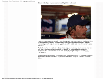 Francuskie.pl - Citroen Peugeot Renault - WRC: Rozpoczął się Rajd Akropolu Sebastien Loeb jak zwykle wzrokiem wodził gdzieś w zaświatach ;-) ...pewnie zupełnie poważnie myśli o czterdziestym pierwszym zwycięstwie. Nie będzie łatwo, bo przecież fińscy kierowcy Forda są bardzo mocni na luźnych nawierzchniach, ale Seb nieraz już pokazał, że jest w stanie wygrać w zasadzie każdy rajd - nawet niezdobyty przez innych ;-) Ale Loeb miał też inne zadania w Grecji. Korzystając z medialnego szumu promował system ESP (ESC - Electronic Stability Control), co wpisuje się w wielką kampanię na rzecz bezpieczeństwa w cywilnych samochodach. Szczegóły znajdziecie pod adresem www. chooseesc.eu. Sebastien Loeb na specjalnie wytyczonym torze (lotnisko wojskowe w Tatoi 20 km od Aten) zaprezentował zalety posiadania na pokładzie samochodu (w tej roli Citroën C2) systemu ESP... http://www.francuskie.pl/francuskie/modules.php?name=News&file=article&sid=3325 (7 of 15) [11/06/2008 15:10:43] Francuskie.pl - Citroen Peugeot Renault - WRC: Rozpoczął się Rajd Akropolu http://www.francuskie.pl/francuskie/modules.php?name=News&file=article&sid=3325 (8 of 15) [11/06/2008 15:10:43] Francuskie.pl - Citroen Peugeot Renault - WRC: Rozpoczął się Rajd Akropolu ...i opowiadał o bezpieczeństwie na konferencji prasowej... http://www.francuskie.pl/francuskie/modules.php?name=News&file=article&sid=3325 (9 of 15) [11/06/2008 15:10:43] Francuskie.pl - Citroen Peugeot Renault - WRC: Rozpoczął się Rajd Akropolu Po tych wszystkich pokazach i prezentacjach dziennikarze akredytowani przy Rajdzie Akropolu mieli okazję osobiście przekonać się o zaletach ESP. Jazdy testowe trwały dwie godziny, a do dyspozycji żurnalistów były oczywiście Citroëny C2. A teraz w kurzu i po dziurach walczą chłopaki na odcinkach specjalnych. Wkrótce zdamy Wam pierwszą relację z Rajdu Akropolu. KG Zdjęcia: oficjalna strona Rajdu Akropolu Komentarze Logowanie/Założenie konta | 0 komentarze http://www.francuskie.pl/francuskie/modules.php?name=News&file=article&sid=3325 (10 of 15) [11/06/2008 15:10:43]
