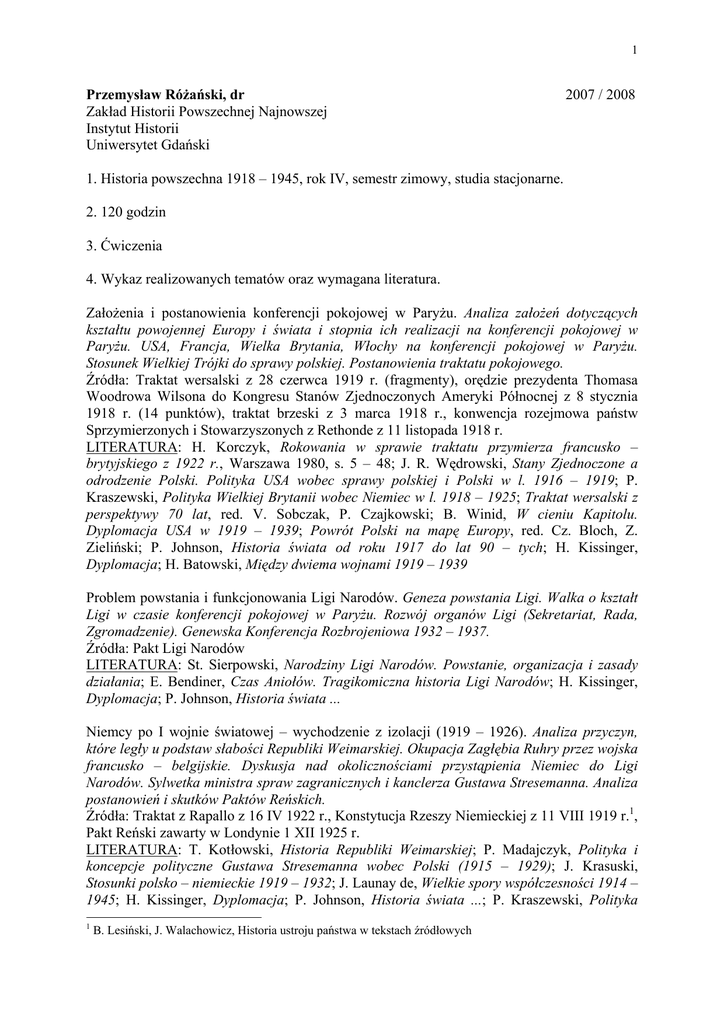 1 Przemysław Różański, dr Zakład Historii Powszechnej Najnowszej Instytut Historii Uniwersytet Gdański 2007 / 2008 1. Historia powszechna 1918 – 1945, rok IV, semestr zimowy, studia stacjonarne. 2. 120 godzin 3. Ćwiczenia 4. Wykaz realizowanych tematów oraz wymagana literatura. Założenia i postanowienia konferencji pokojowej w Paryżu. Analiza założeń dotyczących kształtu powojennej Europy i świata i stopnia ich realizacji na konferencji pokojowej w Paryżu. USA, Francja, Wielka Brytania, Włochy na konferencji pokojowej w Paryżu. Stosunek Wielkiej Trójki do sprawy polskiej. Postanowienia traktatu pokojowego. Źródła: Traktat wersalski z 28 czerwca 1919 r. (fragmenty), orędzie prezydenta Thomasa Woodrowa Wilsona do Kongresu Stanów Zjednoczonych Ameryki Północnej z 8 stycznia 1918 r. (14 punktów), traktat brzeski z 3 marca 1918 r., konwencja rozejmowa państw Sprzymierzonych i Stowarzyszonych z Rethonde z 11 listopada 1918 r. LITERATURA: H. Korczyk, Rokowania w sprawie traktatu przymierza francusko – brytyjskiego z 1922 r., Warszawa 1980, s. 5 – 48; J. R. Wędrowski, Stany Zjednoczone a odrodzenie Polski. Polityka USA wobec sprawy polskiej i Polski w l. 1916 – 1919; P. Kraszewski, Polityka Wielkiej Brytanii wobec Niemiec w l. 1918 – 1925; Traktat wersalski z perspektywy 70 lat, red. V. Sobczak, P. Czajkowski; B. Winid, W cieniu Kapitolu. Dyplomacja USA w 1919 – 1939; Powrót Polski na mapę Europy, red. Cz. Bloch, Z. Zieliński; P. Johnson, Historia świata od roku 1917 do lat 90 – tych; H. Kissinger, Dyplomacja; H. Batowski, Między dwiema wojnami 1919 – 1939 Problem powstania i funkcjonowania Ligi Narodów. Geneza powstania Ligi. Walka o kształt Ligi w czasie konferencji pokojowej w Paryżu. Rozwój organów Ligi (Sekretariat, Rada, Zgromadzenie). Genewska Konferencja Rozbrojeniowa 1932 – 1937. Źródła: Pakt Ligi Narodów LITERATURA: St. Sierpowski, Narodziny Ligi Narodów. Powstanie, organizacja i zasady działania; E. Bendiner, Czas Aniołów. Tragikomiczna historia Ligi Narodów; H. Kissinger, Dyplomacja; P. Johnson, Historia świata ... Niemcy po I wojnie światowej – wychodzenie z izolacji (1919 – 1926). Analiza przyczyn, które legły u podstaw słabości Republiki Weimarskiej. Okupacja Zagłębia Ruhry przez wojska francusko – belgijskie. Dyskusja nad okolicznościami przystąpienia Niemiec do Ligi Narodów. Sylwetka ministra spraw zagranicznych i kanclerza Gustawa Stresemanna. Analiza postanowień i skutków Paktów Reńskich. Źródła: Traktat z Rapallo z 16 IV 1922 r., Konstytucja Rzeszy Niemieckiej z 11 VIII 1919 r.1, Pakt Reński zawarty w Londynie 1 XII 1925 r. LITERATURA: T. Kotłowski, Historia Republiki Weimarskiej; P. Madajczyk, Polityka i koncepcje polityczne Gustawa Stresemanna wobec Polski (1915 – 1929); J. Krasuski, Stosunki polsko – niemieckie 1919 – 1932; J. Launay de, Wielkie spory współczesności 1914 – 1945; H. Kissinger, Dyplomacja; P. Johnson, Historia świata ...; P. Kraszewski, Polityka 1 B. Lesiński, J. Walachowicz, Historia ustroju państwa w tekstach źródłowych 2 Wielkiej Brytanii wobec Niemiec w latach 1918 – 1925; M. Andrzejewski, Od Bismarcka do Schrödera. Portrety niemieckich kanclerzy Problem powstania i funkcjonowania Wolnego Miasta Gdańska. W jakich okolicznościach i dlaczego doszło do powstania tak specyficznego organizmu politycznego jakim było Wolne Miasto. Jak Wolne Miasto Gdańsk funkcjonowało w polityce międzynarodowej. Źródło: Traktat wersalski z 28 czerwca 1919 r. (fragmenty dotyczące utworzenia Wolnego Miasta). LITERATURA: S. Mikos, Wolne Miasto Gdańsk a Liga Narodów 1920 – 1939; L. Wędrowski, Stany Zjednoczone a odrodzenie Polski. Polityka USA wobec sprawy polskiej i Polski 1916 – 1919; M. Serejski, Jak ważyły się losy Gdańska przed ostatnią decyzją zwycięskich mocarstw, „Dzieje Najnowsze”, 1970 / 01. Stany Zjednoczone wobec kwestii żydowskiej w Polsce 1918 – 1921. Temat obejmuje następującą problematykę: USA wobec wystąpień antysemickich w Lwowie 22 listopada 1918 r. i w Wilnie 19 – 21 kwietnia 1919 r., jak i w ogóle wobec kwestii żydowskiej na ziemiach polskich (spojrzenie na problem żydowski prezydenta Wilsona, Henry’ego Morgenthaua, Hugha Gibsona oraz Louisa Marshalla). Wpływ dyplomacji USA na ustanowienie i kształt tzw. traktatu mniejszościowego. Źródło: Traktat miedzy Głównymi Mocarstwami Sprzymierzonymi i Stowarzyszonymi a Polską (tzw. Mały Traktat Wersalski)2. Fragmenty dotyczące ochrony mniejszości narodowych i religijnych. LITERATURA: T. Schramm, Geneza i powstanie traktatu o ochronie mniejszości narodowych [w:] Powrót Polski na mapę Europy, red. Cz. Blocha i Z. Zielińskiego; P. Różański, Hugh Gibson wobec kwestii żydowskiej w Polsce w 1919 roku, „Przegląd Historyczny”, 2004 / 02; idem, Pogrom lwowski 22 listopada 1918 roku w świetle zeznań Organizacji Syjonistycznej złożonych przed komisją Morgenthaua, „Kwartalnik Historii Żydów”, 2004 / 03; idem, Wilno, 19 – 21 IV 1919, „Kwartalnik Historii Żydów”, 2006 / 01; idem, Stany Zjednoczone wobec kwestii żydowskiej w Polsce 1918 – 1921, Gdańsk 2007. Faszyzm we Włoszech 1919 – 1945. Początki ruchu faszystowskiego, jego geneza (wpływ działalności Gabriela d’Annunzia i Filippo Tomasso Marinetiego na kształt i formę wczesnego faszyzmu); okoliczności i przyczyny zdobycia władzy przez Benito Mussoliniego; charakterystyka systemu faszystowskiego; sylwetka B. Mussoliniego, jego koncepcje polityczne. Źródło: Przemówienie Benito Mussoliniego wygłoszone w Izbie Deputowanych 16 listopada 1922 r. LITERATURA: St. Sierpowski, Faszyzm we Włoszech 1919 – 1926; Cz. Madajczyk, Kultura europejska a faszyzm. Szkice; J. W. Borejsza, Szkoły nienawiści. Historia faszyzmów europejskich; tenże, Mussolini był pierwszy…; D. M. Smith, Mussolini; P. Monelli, Mussolini. Polityka międzynarodowa faszystowskich Włoch. LITERATURA