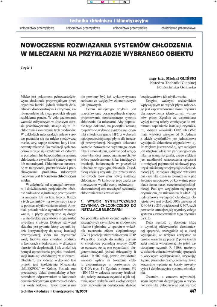 chłodnictwo przemysłowe chłodnictwo przemysłowe chłodnictwo przemysłowe chłodnictwo przemysłowe NOWOCZESNE ROZWIĄZANIA SYSTEMÓW CHŁODZENIA W MLECZARNI NA PRZYKŁADZIE WYBRANEGO OBIEKTU Część 1 mgr inż. Michał GLIŃSKI Katedra Techniki Cieplnej Politechnika Gdańska Mleko jest pokarmem pełnowartościowym, doskonale przyswajalnym przez organizm ludzki, jednak wskutek działalności drobnoustrojów i enzymów, zarówno mleko jak i jego produkty ulegają szybkiemu psuciu. W celu zachowania wartości odżywczych w dłuższym okresie przechowywania, stosuje się m. in. chłodzenie i zamrażanie tych produktów. W zakładach mleczarskich mleko surowe przerabia się na mleko spożywcze, masło, sery, napoje mleczne, lody i koncentraty mleczne. Do realizacji tych procesów stosuje się urządzenia chłodnicze w pośrednim lub bezpośrednim systemie chłodzenia z czynnikami syntetycznymi lub naturalnymi. Chłodnictwo stosowane w transporcie, przetwórstwie i przechowywaniu produktów mlecznych nazywane jest łańcuchem chłodniczym mleka. W zależności od wymagań inwestora i doświadczenia projektantów, obecnie budowane są instalacje przemysłowe na amoniak lub na tzw. freony. Każdy z tych czynników ma swoje wady i zalety podczas użytkowania instalacji. Amoniak posiada wiele ograniczeń w stosowaniu, a płyny syntetyczne są drogie i w niedalekiej przyszłości mogą zostać wycofane z użycia. Dlatego też wciąż aktualne jest pytanie, który czynnik będzie korzystniejszy do nowej instalacji przemysłowej, która ma wytwarzać wodę lodową oraz chłodzić produkty w komorach chłodniczych, w dłuższym okresie ich eksploatacji. I tak zrodził się pomysł opracowania projektu modernizacji instalacji chłodniczej w mleczarni. Obiektem, dla którego wykonano taki projekt jest Spółdzielnia Mleczarska „MLEKPOL” w Kolnie. Posiada ona przestarzały układ amoniakalny z bezpośrednim odparowaniem w komorach oraz nieefektywnym systemem chłodzenia wody lodowej. Takie rozwiązania nie powinny być już wykorzystywane zarówno ze względów ekonomicznych jak i prawnych. Celem niniejszego artykułu jest przedstawienie poszczególnych etapów projektowania nowoczesnego systemu chłodzenia dla mleczarni. Aby poprawnie tego dokonać, na początku zostaną rozpatrzone wybrane syntetyczne czynniki chłodnicze grupy HFC z wyborem najodpowiedniejszego płynu dla instalacji przemysłowej. Następnie dokonane zostanie porównanie wybranego czynnika z amoniakiem, głównie pod względem własności termodynamicznych. Pokrótce przedstawiono kilka istniejących instalacji, budowanych w przeszłości i obecnie w tego typu obiektach. Zasadniczą częścią artykułu jest przedstawienie dwóch rozwiązań nowej instalacji chłodniczej. W końcowej jego części zamieszczono wyniki oceny techniczno – ekonomicznej obu rozwiązań systemów chłodzenia wraz z wnioskami. 1. WYBÓR SYNTETYCZNEGO CZYNNIKA CHŁODNICZEGO DO INSTALACJI MLECZARNI Na początku należy ocenić wpływ poszczególnych czynników na środowisko lokalne i globalne w oparciu o wskaźnik tworzenia efektu cieplarnianego GWP i potencjał niszczenia ozonu ODP. Wszystkie przyjęte do analizy czynniki chłodnicze posiadają zerowy ODP, co oznacza, że są one czynnikami długoterminowymi, jednak mieszaniny R 404A i R 507 mają prawie dwukrotnie większy wpływ na tworzenie efektu cieplarnianego w porównaniu do R 410A (rys. 1). Zgodnie z normą PN - EN 378 w zakresie ochrony środowiska, należy stosować czynniki o jak najmniejszych wskaźnikach ekologicznych przy zapewnieniu dostatecznie dużego technika chłodnicza i klimatyzacyjna 11/2007 bezpieczeństwa ich użytkowania. Drugim, ważnym wskaźnikiem wpływającym na wybór płynu roboczego jest zapotrzebowanie ilości czynnika dla zapewnienia identycznych warunków pracy. Zgodnie ze wspomnianą wyżej normą należy zmniejszyć do minimum napełnienie instalacji czynnikami, których wskaźniki ODP lub GWP mają wartości większe od 0. Jednym z takich wyróżników jest jednostkowa wydajność chłodnicza objętościowa qv. Im większa jest wartość qv, tym mniejsza jest objętość właściwa par danego czynnika na ssaniu sprężarki, czego efektem jest możliwość zastosowania sprężarki o mniejszej pojemności skokowej przy uzyskaniu identycznej wydajności chłodniczej [2]. Mniejsza objętość właściwa par czynnika oznacza również mniejsze średnice rurociągów, co korzystnie przekłada się na masę i cenę instalacji chłodniczej. Pod tym względem najlepszym czynnikiem jest mieszanina R 410A. Jej jednostkowa wydajność chłodnicza objętościowa jest o około 50% większa od R 404A i o 23% większa od R 507, czyli poważnie zmniejszą się wymiary całego systemu z zastosowaniem tego czynnika (rys. 2). Duża wartość qv decyduje także o wysokiej efektywności ekonomicznej sprężarki, szczególnie tej o dużej wydajności, co wpływa korzystnie na ogólne warunki jej pracy. Z powyższych zalet można wnioskować, że jeżeli zastosujemy czynnik R 410A, możemy w układzie zainstalować mniej sprężarek o większych wydajnościach, uzyskując żądane parametry pracy, co niewątpliwie korzystnie wpłynie na koszty inwestycyjne i eksploatacyjne systemu chłodzenia. Ostatnim, a zarazem najważniejszym kryterium decydującym o wyborze czynnika chłodniczego jest wartość 447 chłodnictwo przemysłowe chłodnictwo przemysłowe chłodnictwo przemysłowe chłodnictwo przemysłowe Rys. 1. Wartości wskaźnika tworzenia efektu cieplarnianego GWP dla analizowanych czynników w horyzoncie czasowym ITH = 100 lat Rys.4. Zależność sprężu pk/po od temperatury parowania (to) dla czynników R 717 i R 507 wg [3,4] Rys. 2. Wartości jednostkowej wydajności chłodniczej objętościowej qv [kJ/m3] wg [2] Rys. 5. Zależność temperatury końca sprężania (tr) od temperatury parowania (to), wg [3,4] Rys. 3. Wartości współczynnika wydajności chłodniczej COP wg 