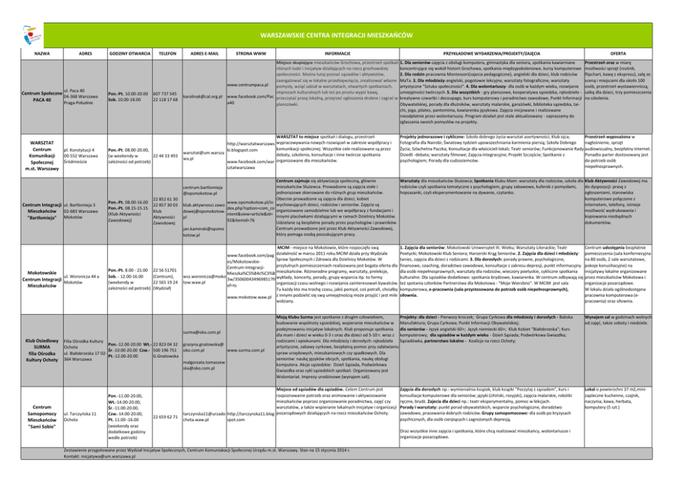 WARSZAWSKIE CENTRA INTEGRACJI MIESZKAŃCÓW NAZWA ADRES ul. Paca 40 Centrum Społeczne 04-368 Warszawa PACA 40 Praga-Południe WARSZTAT Centrum Komunikacji Społecznej m.st. Warszawy pl. Konstytucji 4 00-552 Warszawa Śródmieście GODZINY OTWARCIA Pon.-Pt. 10.00-20.00 Sob. 10.00-18.00 TELEFON 607 737 545 22 118 17 68 Pon.-Pt. 08.00-20.00, (w weekendy w 22 44 33 493 zależności od potrzeb) ADRES E-MAIL [email protected] STRONA WWW INFORMACJE Miejsce skupiające mieszkańców Grochowa, przestrzeń spotkań różnych ludzi i inicjatyw działających na rzecz grochowskiej społeczności. Można tutaj poznać sąsiadów i aktywistów, zaangażować się w lokalne przedsięwzięcia, zrealizować własne www.centrumpaca.pl pomysły, wziąć udział w warsztatach, otwartych spotkaniach, imprezach kulturalnych lub też po prostu wypić kawę, www.facebook.com/Pac przeczytać prasę lokalną, przejrzeć ogłoszenia drobne i zagrać w a40 planszówki. WARSZTAT to miejsce spotkań i dialogu, przestrzeń http://warsztatwarszaws wypracowywania nowych rozwiązań w zakresie współpracy i komunikacji społecznej. Wszystkie cele realizowane są przez ki.blogspot.com [email protected] debaty, szkolenia, konsultacje i inne twórcze spotkania wa.pl www.facebook.com/war organizowane dla mieszkańców. sztatwarszawa PRZYKŁADOWE WYDARZENIA/PROJEKTY/ZAJĘCIA OFERTA 1. Dla seniorów-zajęcia z obsługi komputera, gimnastyka dla seniora, spotkania kawiarniane koncentrujące się wokół historii Grochowa, spotkania międzypokoleniowe, kursy komputerowe 2. Dla rodzin-pracownia Montessori(zajecia pedagogiczne), angielski dla dzieci, klub rodziców MaTa. 3. Dla młodzieży-angielski, pogotowie lekcyjne, warsztaty fotograficzne, warsztaty artystyczne "Sztuka społeczności". 4. Dla wolontariuszy- dla osób w każdym wieku, rozwijanie umiejętności twórczych. 5. Dla wszystkich - gry planszowe, kooperatywa sąsiedzka, rękodzieło kreatywne czwartki i decoupage, kurs komputerowy i poradnictwo zawodowe, Punkt Informacji Obywatelskiej, porady dla dłużników, warsztaty malarskie, garażówki, biblioteka sąsiedzka, taichi, joga, pilates, pantomima, kawiarenka językowa. Zajęcia inicjowane i realizowane nieodpłatnie przez wolontariuszy. Program działań jest stale aktualizowany - zapraszamy do zgłaszania swoich pomysłów na projekty. Przestrzeń oraz w miarę możliwości sprzęt (rzutnik, flipchart, kawę z ekspresu), salę ze sceną i miejscami dla około 100 osób, przestrzeń wystawienniczą, salkę dla dzieci, trzy pomieszczenia na szkolenia. Przestrzeń wyposażona w Projekty jednorazowe i cykliczne: Szkoła dobrego życia-warsztat asertywności; Klub ojca; nagłośnienie, sprzęt Fotografia dla Nairobi; Światowy tydzień upowszechniania karmienia piersią; Szkoła Dobrego Życia; Szlachetna Paczka; Konsultacje dla właścicieli lokali; Teatr seniorów; Funkcjonowanie Rady audiowizualny, bezpłatny internet. Osiedli -debata; warsztaty filmowe; Zajęcia integracyjne; Projekt Szczęście; Spotkanie z Ponadto parter dostosowany jest psychologiem; Porady dla cudzoziemców. do potrzeb osób niepełnosprawnych. Centrum zajmuje się aktywizacja społeczną, głównie Warsztaty dla mieszkańców Służewca; Spotkania Klubu Mam: warsztaty dla rodziców, szkoła dla mieszkańców Służewca. Prowadzone są zajęcia stałe i rodziców czyli spotkania tematyczne z psychologiem, grupy zabawowe, kuferek z pomysłami, jednorazowe skierowane do różnych grup mieszkańców. hopsasanki, czyli eksperymentowanie na dywanie, czytanko. Obecnie prowadzone są zajęcia dla dzieci, kobiet www.opsmokotow.pl/in wychowujących dzieci, rodziców i seniorów. Zajęcia są klub.aktywnosci.zawo dex.php?option=com_co organizowane samodzielnie lub we współpracy z fundacjami i dowej@opsmokotow. ntent&view=article&id= innymi placówkami działającymi w ramach Dzielnicy Mokotów. pl 92&Itemid=76 Udzielane są bezpłatne porady przez psychologów i prawników. Centrum prowadzone jest przez Klub Aktywności Zawodowej, jan.kaminski@opsmo który pomaga osobą poszukującym pracy. kotow.pl centrum.bartlomieja @opsmokotow.pl Centrum Integracji ul. Bartłomieja 3 02-683 Warszawa Mieszkańców "Bartłomieja" Mokotów Pon.-Pt. 08.00-16.00 Pon.-Pt. 08.15-15.15 (Klub Aktywności Zawodowej) 22 852 61 30 22 857 30 03 Klub Aktywności Zawodowej MCIM - miejsce na Mokotowie, które rozpoczęło swą Mokotowskie ul. Woronicza 44 a Centrum Integracji Mokotów Mieszkańców Pon.-Pt. 8.00 - 21.00 Sob. - 12.00-16.00 (weekendy w zależności od potrzeb) 22 56 51701 (Centrum), 22 565 19 24 (Wydział) www.facebook.com/pag działalność w marcu 2011 roku.MCIM działa przy Wydziale Spraw Społecznych i Zdrowia dla Dzielnicy Mokotów. W es/Mokotowskieprzytulnych pomieszczeniach realizowana jest bogata oferta dla Centrum-IntegracjiMieszka%C5%84c%C3%B mieszkańców. Różnorodne programy, warsztaty, prelekcje, wsz.woronicza@moko 3w/350600434969851?fr wykłady, koncerty, porady, grupy wsparcia itp. to formy tow.waw.pl organizacji czasu wolnego i rozwijania zainteresowań bywalców. ef=ts Tu każdy kto ma trochę czasu, jakiś pomysł, coś potrafi, chciałby www.mokotow.waw.pl z innymi podzielić się swą umiejętnością może przyjść i jest mile widziany. [email protected] Klub Osiedlowy SURMA filia Ośrodka Kultury Ochoty Centrum Samopomocy Mieszkańców "Sami Sobie" Filia Ośrodka Kultury Pon.-12.00-20.00 Wt.- 22 823 04 32 grazyna.gnatowska@ Ochota Śr.-10.00-20.00 Czw.- 500 196 751 oko.com.pl www.surma.com.pl ul. Białobrzeska 17 02Pt.-12.00-20.00 G.Gnatowska 364 Warszawa malgorzata.tomaszew [email protected] ul. Tarczyńska 11 Ochota Pon.-11.00-20.00, Wt.-14.00-20.00, Śr.-11.00-20.00, Czw.-14.00-20.00, Pt. 11.00 -16.00 (weekendy oraz dodatkowe godziny wedle potrzeb) 22 659 62 71 1. Zajęcia dla seniorów: Mokotowski Uniwersytet III. Wieku; Warsztaty Literackie; Teatr Poetycki; Mokotowski Klub Seniora; Harcerski Krąg Seniorów. 2. Zajęcia dla dzieci i m