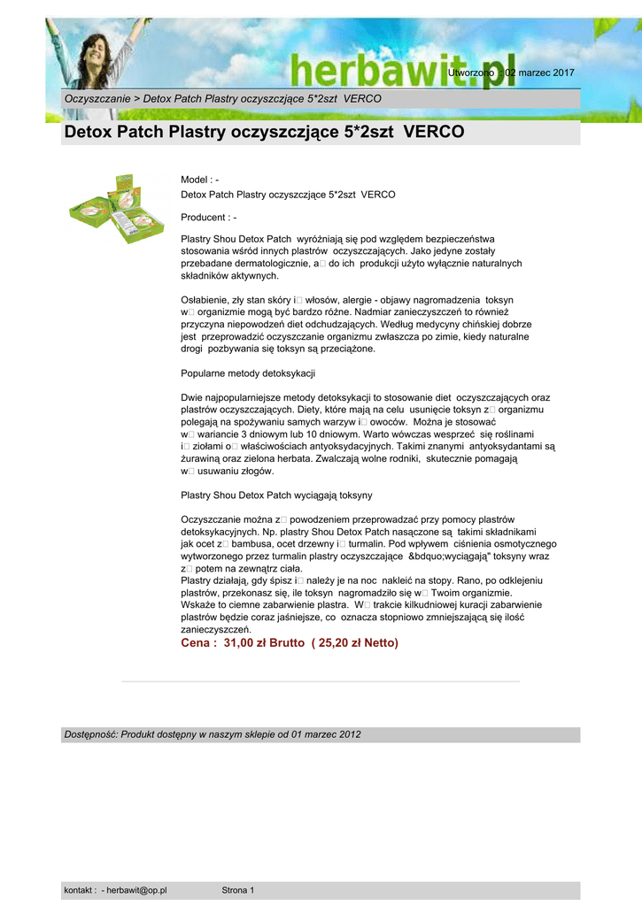 Utworzono : 02 marzec 2017 Oczyszczanie > Detox Patch Plastry oczyszczjące 5*2szt VERCO Detox Patch Plastry oczyszczjące 5*2szt VERCO Model : Detox Patch Plastry oczyszczjące 5*2szt VERCO Producent : Plastry Shou Detox Patch wyróżniają się pod względem bezpieczeństwa stosowania wśród innych plastrów oczyszczających. Jako jedyne zostały przebadane dermatologicznie, a�do ich produkcji użyto wyłącznie naturalnych składników aktywnych. Osłabienie, zły stan skóry i�włosów, alergie - objawy nagromadzenia toksyn w�organizmie mogą być bardzo różne. Nadmiar zanieczyszczeń to również przyczyna niepowodzeń diet odchudzających. Według medycyny chińskiej dobrze jest przeprowadzić oczyszczanie organizmu zwłaszcza po zimie, kiedy naturalne drogi pozbywania się toksyn są przeciążone. Popularne metody detoksykacji Dwie najpopularniejsze metody detoksykacji to stosowanie diet oczyszczających oraz plastrów oczyszczających. Diety, które mają na celu usunięcie toksyn z�organizmu polegają na spożywaniu samych warzyw i�owoców. Można je stosować w�wariancie 3 dniowym lub 10 dniowym. Warto wówczas wesprzeć się roślinami i�ziołami o�właściwościach antyoksydacyjnych. Takimi znanymi antyoksydantami są żurawiną oraz zielona herbata. Zwalczają wolne rodniki, skutecznie pomagają w�usuwaniu złogów. Plastry Shou Detox Patch wyciągają toksyny Oczyszczanie można z�powodzeniem przeprowadzać przy pomocy plastrów detoksykacyjnych. Np. plastry Shou Detox Patch nasączone są takimi składnikami jak ocet z�bambusa, ocet drzewny i�turmalin. Pod wpływem ciśnienia osmotycznego wytworzonego przez turmalin plastry oczyszczające „wyciągają" toksyny wraz z�potem na zewnątrz ciała. Plastry działają, gdy śpisz i�należy je na noc nakleić na stopy. Rano, po odklejeniu plastrów, przekonasz się, ile toksyn nagromadziło się w�Twoim organizmie. Wskaże to ciemne zabarwienie plastra. W�trakcie kilkudniowej kuracji zabarwienie plastrów będzie coraz jaśniejsze, co oznacza stopniowo zmniejszającą się ilość zanieczyszczeń. Cena : 31,00 zł Brutto ( 25,20 zł Netto) Dostępność: Produkt dostępny w naszym sklepie od 01 marzec 2012 kontakt : - [email protected] Strona 1