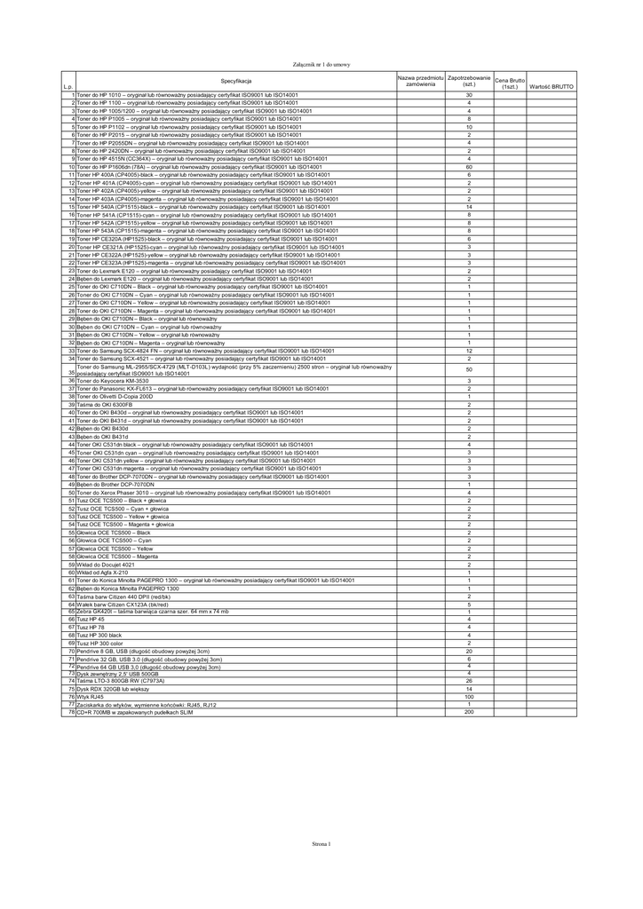 Załącznik nr 1 do umowy Specyfikacja L.p. 1 2 3 4 5 6 7 8 9 10 11 12 13 14 15 16 17 18 19 20 21 22 23 24 25 26 27 28 29 30 31 32 33 34 35 36 37 38 39 40 41 42 43 44 45 46 47 48 49 50 51 52 53 54 55 56 57 58 59 60 61 62 63 64 65 66 67 68 69 70 71 72 73 74 75 76 77 78 Toner do HP 1010 – oryginał lub równoważny posiadający certyfikat ISO9001 lub ISO14001 Toner do HP 1100 – oryginał lub równoważny posiadający certyfikat ISO9001 lub ISO14001 Toner do HP 1005/1200 – oryginał lub równoważny posiadający certyfikat ISO9001 lub ISO14001 Toner do HP P1005 – oryginał lub równoważny posiadający certyfikat ISO9001 lub ISO14001 Toner do HP P1102 – oryginał lub równoważny posiadający certyfikat ISO9001 lub ISO14001 Toner do HP P2015 – oryginał lub równoważny posiadający certyfikat ISO9001 lub ISO14001 Toner do HP P2055DN – oryginał lub równoważny posiadający certyfikat ISO9001 lub ISO14001 Toner do HP 2420DN – oryginał lub równoważny posiadający certyfikat ISO9001 lub ISO14001 Toner do HP 4515N (CC364X) – oryginał lub równoważny posiadający certyfikat ISO9001 lub ISO14001 Toner do HP P1606dn (78A) – oryginał lub równoważny posiadający certyfikat ISO9001 lub ISO14001 Toner HP 400A (CP4005)-black – oryginał lub równoważny posiadający certyfikat ISO9001 lub ISO14001 Toner HP 401A (CP4005)-cyan – oryginał lub równoważny posiadający certyfikat ISO9001 lub ISO14001 Toner HP 402A (CP4005)-yellow – oryginał lub równoważny posiadający certyfikat ISO9001 lub ISO14001 Toner HP 403A (CP4005)-magenta – oryginał lub równoważny posiadający certyfikat ISO9001 lub ISO14001 Toner HP 540A (CP1515)-black – oryginał lub równoważny posiadający certyfikat ISO9001 lub ISO14001 Toner HP 541A (CP1515)-cyan – oryginał lub równoważny posiadający certyfikat ISO9001 lub ISO14001 Toner HP 542A (CP1515)-yellow – oryginał lub równoważny posiadający certyfikat ISO9001 lub ISO14001 Toner HP 543A (CP1515)-magenta – oryginał lub równoważny posiadający certyfikat ISO9001 lub ISO14001 Toner HP CE320A (HP1525)-black – oryginał lub równoważny posiadający certyfikat ISO9001 lub ISO14001 Toner HP CE321A (HP1525)-cyan – oryginał lub równoważny posiadający certyfikat ISO9001 lub ISO14001 Toner HP CE322A (HP1525)-yellow – oryginał lub równoważny posiadający certyfikat ISO9001 lub ISO14001 Toner HP CE323A (HP1525)-magenta – oryginał lub równoważny posiadający certyfikat ISO9001 lub ISO14001 Toner do Lexmark E120 – oryginał lub równoważny posiadający certyfikat ISO9001 lub ISO14001 Bęben do Lexmark E120 – oryginał lub równoważny posiadający certyfikat ISO9001 lub ISO14001 Toner do OKI C710DN – Black – oryginał lub równoważny posiadający certyfikat ISO9001 lub ISO14001 Toner do OKI C710DN – Cyan – oryginał lub równoważny posiadający certyfikat ISO9001 lub ISO14001 Toner do OKI C710DN – Yellow – oryginał lub równoważny posiadający certyfikat ISO9001 lub ISO14001 Toner do OKI C710DN – Magenta – oryginał lub równoważny posiadający certyfikat ISO9001 lub ISO14001 Bęben do OKI C710DN – Black – oryginał lub równoważny Bęben do OKI C710DN – Cyan – oryginał lub równoważny Bęben do OKI C710DN – Yellow – oryginał lub równoważny Bęben do OKI C710DN – Magenta – oryginał lub równoważny Toner do Samsung SCX-4824 FN – oryginał lub równoważny posiadający certyfikat ISO9001 lub ISO14001 Toner do Samsung SCX-4521 – oryginał lub równoważny posiadający certyfikat ISO9001 lub ISO14001 Toner do Samsung ML-2955/SCX-4729 (MLT-D103L) wydajność (przy 5% zaczernieniu) 2500 stron – oryginał lub równoważny posiadający certyfikat ISO9001 lub ISO14001 Toner do Keyocera KM-3530 Toner do Panasonic KX-FL613 – oryginał lub równoważny posiadający certyfikat ISO9001 lub ISO14001 Toner do Olivetti D-Copia 200D Taśma do OKI 6300FB Toner do OKI B430d – oryginał lub równoważny posiadający certyfikat ISO9001 lub ISO14001 Toner do OKI B431d – oryginał lub równoważny posiadający certyfikat ISO9001 lub ISO14001 Bęben do OKI B430d Bęben do OKI B431d Toner OKI C531dn black – oryginał lub równoważny posiadający certyfikat ISO9001 lub ISO14001 Toner OKI C531dn cyan – oryginał lub równoważny posiadający certyfikat ISO9001 lub ISO14001 Toner OKI C531dn yellow – oryginał lub równoważny posiadający certyfikat ISO9001 lub ISO14001 Toner OKI C531dn magenta – oryginał lub równoważny posiadający certyfikat ISO9001 lub ISO14001 Toner do Brother DCP-7070DN – oryginał lub równoważny posiadający certyfikat ISO9001 lub ISO14001 Bęben do Brother DCP-7070DN Toner do Xerox Phaser 3010 – oryginał lub równoważny posiadający certyfikat ISO9001 lub ISO14001 Tusz OCE TCS500 – Black + głowica Tusz OCE TCS500 – Cyan + głowica Tusz OCE TCS500 – Yellow + głowica Tusz OCE TCS500 – Magenta + głowica Głowica OCE TCS500 – Black Głowica OCE TCS500 – Cyan Głowica OCE TCS500 – Yellow Głowica OCE TCS500 – Magenta W kład do Docujet 4021 Wkład od Agfa X-210 Toner do Konica Minolta PAGEPRO 1300 – oryginał lub równoważny posiadający certyfikat ISO9001 lub ISO14001 Bęben do Konica Minolta PAGEPRO 1300 Taśma barw Citizen 440 DPII (red/bk) W ałek barw Citizen CX123A (bk/red) Zebra GK420t – taśma barwiąca czarna szer. 64 mm x 74 mb Tusz HP 45 Tusz HP 78 Tusz HP 300 black Tusz HP 300 color Pendrive 8 GB, USB (długość obudowy powyżej 3cm) Pendrive 32 GB, USB 3.0 (długość obudowy powyżej 3cm) Pendrive 64 GB USB 3,0 (długość obudowy powyżej 3cm) Dysk zewnętrzny 2,5' USB 500GB Taśma LTO-3 800GB RW (C7973A) Dysk RDX 320GB lub większy Wtyk RJ45 Zaciskarka do wtyków, wymienne końcówki: RJ45, RJ12 CD+R 700MB w zapakowanych pudełkach SLIM Strona 1 Nazwa przedmiotu Zapotrzebowanie Cena Brutto zamówienia (szt.) (1szt.) Wartość BRUTTO 30 4 4 8 10 2 4 2 4 60 6 2 2 2 14 8 8 8 6 3 3 3 2 2 1 1 1 1 1 1 1 1 12 2 50