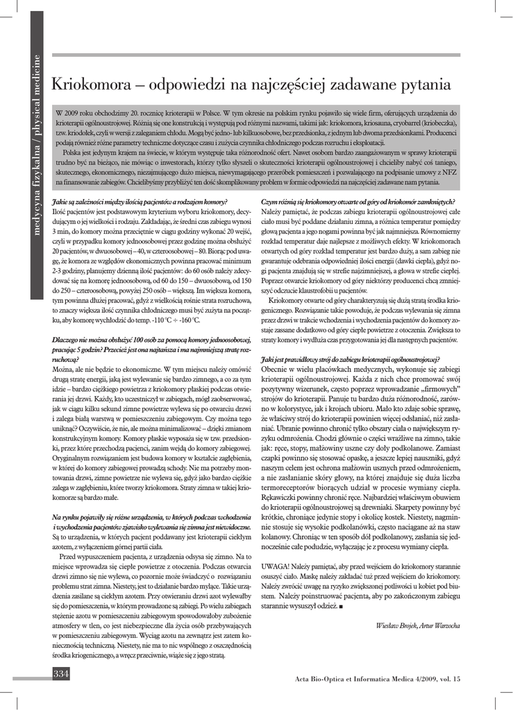 medycyna fizykalna / physical medicine Kriokomora – odpowiedzi na najczęściej zadawane pytania W 2009 roku obchodzimy 20. rocznicę krioterapii w Polsce. W tym okresie na polskim rynku pojawiło się wiele firm, oferujących urządzenia do krioterapii ogólnoustrojowej. Różnią się one konstrukcją i występują pod różnymi nazwami, takimi jak: kriokomora, kriosauna, cryobarrel (kriobeczka), tzw. kriodołek, czyli w wersji z zaleganiem chłodu. Mogą być jedno- lub kilkuosobowe, bez przedsionka, z jednym lub dwoma przedsionkami. Producenci podają również różne parametry techniczne dotyczące czasu i zużycia czynnika chłodniczego podczas rozruchu i eksploatacji. Polska jest jedynym krajem na świecie, w którym występuje taka różnorodność ofert. Nawet osobom bardzo zaangażowanym w sprawy krioterapii trudno być na bieżąco, nie mówiąc o inwestorach, którzy tylko słyszeli o skuteczności krioterapii ogólnoustrojowej i chcieliby nabyć coś taniego, skutecznego, ekonomicznego, niezajmującego dużo miejsca, niewymagającego przeróbek pomieszczeń i pozwalającego na podpisanie umowy z NFZ na finansowanie zabiegów. Chcielibyśmy przybliżyć ten dość skomplikowany problem w formie odpowiedzi na najczęściej zadawane nam pytania. Jakie są zależności między ilością pacjentów a rodzajem komory? Ilość pacjentów jest podstawowym kryterium wyboru kriokomory, decydującym o jej wielkości i rodzaju. Zakładając, że średni czas zabiegu wynosi 3 min, do komory można przeciętnie w ciągu godziny wykonać 20 wejść, czyli w przypadku komory jednoosobowej przez godzinę można obsłużyć 20 pacjentów, w dwuosobowej – 40, w czteroosobowej – 80. Biorąc pod uwagę, że komora ze względów ekonomicznych powinna pracować minimum 2-3 godziny, planujemy dzienną ilość pacjentów: do 60 osób należy zdecydować się na komorę jednoosobową, od 60 do 150 – dwuosobową, od 150 do 250 – czteroosobową, powyżej 250 osób – większą. Im większa komora, tym powinna dłużej pracować, gdyż z wielkością rośnie strata rozruchowa, to znaczy większa ilość czynnika chłodniczego musi być zużyta na początku, aby komorę wychłodzić do temp. -110 °C ÷ -160 °C. Dlaczego nie można obsłużyć 100 osób za pomocą komory jednoosobowej, pracując 5 godzin? Przecież jest ona najtańsza i ma najmniejszą stratę rozruchową? Można, ale nie będzie to ekonomiczne. W tym miejscu należy omówić drugą stratę energii, jaką jest wylewanie się bardzo zimnego, a co za tym idzie – bardzo ciężkiego powietrza z kriokomory płaskiej podczas otwierania jej drzwi. Każdy, kto uczestniczył w zabiegach, mógł zaobserwować, jak w ciągu kilku sekund zimne powietrze wylewa się po otwarciu drzwi i zalega białą warstwą w pomieszczeniu zabiegowym. Czy można tego uniknąć? Oczywiście, że nie, ale można minimalizować – dzięki zmianom konstrukcyjnym komory. Komory płaskie wyposaża się w tzw. przedsionki, przez które przechodzą pacjenci, zanim wejdą do komory zabiegowej. Oryginalnym rozwiązaniem jest budowa komory w kształcie zagłębienia, w której do komory zabiegowej prowadzą schody. Nie ma potrzeby montowania drzwi, zimne powietrze nie wylewa się, gdyż jako bardzo ciężkie zalega w zagłębieniu, które tworzy kriokomora. Straty zimna w takiej kriokomorze są bardzo małe. Na rynku pojawiły się różne urządzenia, w których podczas wchodzenia i wychodzenia pacjentów zjawisko wylewania się zimna jest niewidoczne. Są to urządzenia, w których pacjent poddawany jest krioterapii ciekłym azotem, z wyłączeniem górnej partii ciała. Przed wypuszczeniem pacjenta, z urządzenia odsysa się zimno. Na to miejsce wprowadza się ciepłe powietrze z otoczenia. Podczas otwarcia drzwi zimno się nie wylewa, co pozornie może świadczyć o rozwiązaniu problemu strat zimna. Niestety, jest to działanie bardzo mylące. Takie urządzenia zasilane są ciekłym azotem. Przy otwieraniu drzwi azot wylewałby się do pomieszczenia, w którym prowadzone są zabiegi. Po wielu zabiegach stężenie azotu w pomieszczeniu zabiegowym spowodowałoby zubożenie atmosfery w tlen, co jest niebezpieczne dla życia osób przebywających w pomieszczeniu zabiegowym. Wyciąg azotu na zewnątrz jest zatem koniecznością techniczną. Niestety, nie ma to nic wspólnego z oszczędnością środka kriogenicznego, a wręcz przeciwnie, wiąże się z jego stratą. 334 Czym różnią się kriokomory otwarte od góry od kriokomór zamkniętych? Należy pamiętać, że podczas zabiegu krioterapii ogólnoustrojowej całe ciało musi być poddane działaniu zimna, a różnica temperatur pomiędzy głową pacjenta a jego nogami powinna być jak najmniejsza. Równomierny rozkład temperatur daje najlepsze z możliwych efekty. W kriokomorach otwartych od góry rozkład temperatur jest bardzo duży, a sam zabieg nie gwarantuje odebrania odpowiedniej ilości energii (dawki ciepła), gdyż nogi pacjenta znajdują się w strefie najzimniejszej, a głowa w strefie ciepłej. Poprzez otwarcie kriokomory od góry niektórzy producenci chcą zmniejszyć odczucie klaustrofobii u pacjentów. Kriokomory otwarte od góry charakteryzują się dużą stratą środka kriogenicznego. Rozwiązanie takie powoduje, że podczas wylewania się zimna przez drzwi w trakcie wchodzenia i wychodzenia pacjentów do komory zostaje zassane dodatkowo od góry ciepłe powietrze z otoczenia. Zwiększa to straty komory i wydłuża czas przygotowania jej dla następnych pacjentów. Jaki jest prawidłowy strój do zabiegu krioterapii ogólnoustrojowej? Obecnie w wielu placówkach medycznych, wykonuje się zabiegi krioterapii ogólnoustrojowej. Każda z nich chce promować swój pozytywny wizerunek, często poprzez wprowadzanie „firmowych” strojów do krioterapii. Panuje tu bardzo duża różnorodność, zarówno w kolorystyce, jak i krojach ubioru. Mało kto zdaje sobie sprawę, że właściwy str