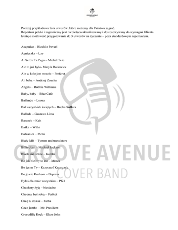 Poniżej przykładowa lista utworów, które możemy dla Państwa zagrać. Repertuar polski i zagraniczny jest na bieżąco aktualizowany i dostosowywany do wymagań Klienta. Istnieje możliwość przygotowania do 5 utworów na życzenie – poza standardowym repertuarem. Acapulco – Ricchi e Poveri Agnieszka – Łzy Ai Se Eu Te Pego – Michel Telo Ale to już było- Maryla Rodowicz Ale w koło jest wesoło – Perferct Ali baba – Andrzej Zaucha Angels – Robbie Williams Baby, baby – Blue Cafe Bailando – Loona Bal wszystkich świętych – Budka Suflera Ballada – Gustawo Lima Baranek – Kult Baśka – Wilki Bałkanica – Piersi Biały Miś – Tymon and transistors Billie Jean – Michael Jackson Black and white – Kombi Bo jak nie my to kto – Mrozu Bo jestes Ty – Krzysztof Krawczyk Bo jo cie Kochom – Depress Byłaś dla mnie wszystkim – PK3 Chachary żyją – biesiadne Chcemy być sobą – Perfect Chcę tu zostać – Farba Coco jambo – Mr. President Crocodille Rock – Elton John Cry, cry – Oceana Cudownych rodziców mam – Urszula Sipińska Czuję i wiem – Stachursky Daj mi tę noc – Bolter Dla Ciebie – Myslovitz Do kołyski – Dżem Do nieba, do piekła – Blue cafe Dream a little dream of me – The mamas and the papas Dziś prawdziwych cyganów już nie ma – Maryla Rodowicz Dzień Dobry Kocham Cię – Strachy na Lachy Dżaga – Doda Every breathe you take – the Police Facet to świnia – Big Cyc Felicita – Al Bano Carissi e Romina Power Fields of gold – Sting Gdy nie ma w domu dzieci – Kult Gdy zapłaczesz – Stachursky Harley mój – Dżem Hej bystra woda – biesiade Hej sokoły – biesiadne Hi-fi superstar – Banda i Wanda I feel good – James Brown I just call to say I love you – Stevie Wonder I Wonder why – Curtis Stigers If you don’t know me by now – Simply red Jak się masz kochanie – Happy End Jambalaya – Anna Jantar Jedzie pociąg z daleka – Ryszard Rynkowski Jej czarne oczy – Iwan i Delfin Jest już ciemno – Feel Jest taki dzień – Czerwone Gitary Jesteś szalona – Boys Jeśli tylko chcesz – Borysewicz, Kukiz Jolka, jolka – Budka Suflera Kawałek do Tańca – PK3 Kochać inaczej – De mono Kocham Cie kochanie moje – Maanam Konik na biegunach – Urszula Ktoś mnie pokochał – Skaldowie La bamba – Los Lobos Lambada – Caoma Lady In red – Chris de Burgh Lato – Formacja Nieżywych Schabuff Lato 2000 – Sami List do M.- Dżem Łatwopalni – Maryla Rodowicz Makumba – Big Cyc Małgośka – Maryla Rodowicz Mamma Maria – Ricchi e poveri Magiczne słowa – Brzozowski Maria, Maria – Carlos Santana Marina Marina – Francesco Napoli Mniej niż zero – lady pank Moja mała blondyneczko – Bayer full Moje jedyne marzenie –Anna Jantar Monika dziewczyna ratownika – Rudi Schuberth Mój przyjacielu – Krzysztof Krawczyk Mój jest ten kawałek podłogi – Mr Zoop Na językach – Kayah Nasze Randez-vous – Kombi Nah Neh nah – Vaya Con Dios Nie liczę godzin i lat – Andrzej Rybiński Nie płacz Ewka – Perfect Nie zadzieraj nosa – Czerwone Gitary Niebo z moich stron – Czerwone Gitary Nogi – Czarno Czarni O mnie się nie martw – Kasia Sobczyk Obla di obla da – The Beatles Ona tu jest i tańczy dla mnie – Weekend Piąty bieg – Budka Suflera Piękniejsza – K.A.S.A Pod papugami – Czesław Niemen Prawy do lewego – Kayah Prosta Piosenka – Poluzjanci Proud mary – Tina Turner Prywatki – Wojciech Gąssowski Przeżyj to sam – Lombard Pszczółka Maja – Akcent Purple rain – Prince Remedium – Maryla Rodowicz Rock around the clock – Bill Haley Rudy się żeni – Big cyc Serduszko puka – Maria Koterbska She’s the one – Robbie Wiliams Simply the best – Tina Turner Skrzydlate ręce – Enej Something got me started – Simply Red Stars – Simply Red Szalona Ruda Szparka Sekretarka – Maryla Rodowicz Takie ładne oczy – Czerwone Gitary Testosteron – Kayah Thinking Out Loud – Ed Sheeran Truly, madly deeply – Savage garden Tutti frutti – Elvis Presley To co chciałbym ci dać – Pectus Tyle słońca w całym mieście – Anna Jantar Uciekaj moje serce – Seweryn Krajewski Uh lalala – Alexia We are family – Sister Sledge Wehikuł czasu – Dżem Wicked game – Chris Isaac Wielka miłość – Seweryn Krajewski With Or without you – U2 Waterloo – ABBA Valerie – Amy Winehouse Venus – Bananarama Walking on sunshine YMCA – Village People Zabiorę Cie właśnie tam – Kancelaria Zawsze tam gdzie ty – Lady Pank Zostańmy razem – Stachursky Żono moja – Masters