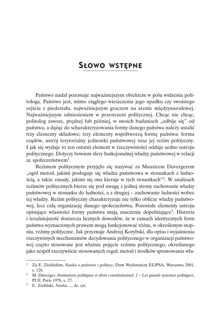 S łowo wstępne Państwo nadal pozostaje najważniejszym obiektem w polu widzenia politologa. Państwo jest, mimo ciągłego wieszczenia jego upadku czy swoistego zejścia z piedestału, najważniejszym graczem na arenie międzynarodowej. Najważniejszym odniesieniem w przestrzeni politycznej. Chcąc nie chcąc, politolog zawsze, prędzej lub później, w swoich badaniach „odbije się” od państwa, a dążąc do scharakteryzowania formy danego państwa należy ustalić trzy elementy składowe; trzy elementy współtworzą formę państwa: forma rządów, ustrój terytorialny jednostki państwowej oraz jej reżim polityczny. I jak się wydaje to ten ostatni element w rzeczywistości oddaje sedno ustroju politycznego. Dotyczy bowiem sfery funkcjonalnej władzy państwowej w relacji ze społeczeństwem1. Reżimem politycznym przyjęło się nazywać za Mauricem Duvergerem „ogół metod, jakimi posługuje się władza państwowa w stosunkach z ludnością, a także zasady, jakimi się ona kieruje w tych stosunkach”2. W analizach reżimów politycznych bierze się pod uwagę z jednej strony zachowanie władzy państwowej w stosunku do ludności, a z drugiej – zachowanie ludności wobec tej władzy. Reżim polityczny charakteryzuje nie tylko oblicze władzy państwowej, lecz całą organizację danego społeczeństwa. Pozostałe elementy ustroju opisujące własności formy państwa mają znaczenie dopełniające3. Historia i teraźniejszość dostarcza licznych dowodów, że w ramach identycznych form państwa wyznaczonych prawem mogą funkcjonować różne, w określonym stopniu, reżimy polityczne. Jak przyznaje Andrzej Korybski, dla opisu i wyjaśnienia rzeczywistych mechanizmów decydowania politycznego w organizacji państwowej często stosowane jest właśnie pojęcie reżimu politycznego, określanego jako zespół rzeczywiście stosowanych reguł, metod i środków sprawowania wła1 Za E. Zielińskim, Nauka o państwie i polityce, Dom Wydawniczy ELIPSA, Warszawa 2001, s. 126. 2 M. Duverger, Institutions politigues et droit constitutionnel. 1 – Les grands systemes politigues, PUF, Paris 1978, s. 27. 3 E. Zieliński, Nauka…, dz. cyt. 10 S ło w o w s t ę p n e dzy państwowej4. Reżim polityczny rozumieć zatem należy jako styl rządzenia, metody i środki urzeczywistnienia władzy publicznej. Termin reżim jest odpowiednikiem francuskiego określenia le régime – le régime politigue, który znaczy tyle, co system, porządek, ład, rządy. W języku politologa, tak samo zresztą jak i prawnika, pojęcie to ma znaczenie aksjologicznie neutralne, co warto zaznaczyć w opozycji do słowa „reżim”, które pojawia się w użyciu potocznym w języku polskim znacznie częściej i akcentuje jego inne, pejoratywne znaczenie – dla określenia praktyk politycznych o charakterze niedemokratycznym, które narzucają obywatelowi surowy rygor, gdzie ograniczone są prawa człowieka5. Pojęcie reżimu politycznego nie zawiera w sobie żadnego elementu wartościowania i jest stosowane dla opisu pewnego aspektu systemu politycznego bądź czasami jest wręcz z systemem utożsamiane. Andrzej Antoszewski6 twierdzi, iż system polityczny obejmuje dwa podsystemy, jednym z tych podsystemów jest reżim polityczny7. Obejmuje on wartości i zasady ustrojowe oraz strukturę autorytetów, formalne i nieformalne „reguły gry politycznej” oraz wynikające z nich zachowania i relacje między podmiotami polityki8. Reasumując, reżim polityczny oznacza faktyczny sposób rządzenia państwem. Jest to ogół metod, środków formalnych – wynikających z przepisów prawa oraz nieformalnych – jak przykładowo tradycja czy kultura. Gdy poruszamy problem reżimu politycznego chodzi nam o zagadnienia wzajemnych stosunków organów państwa i obywateli oraz organizacji politycznych i społecznych9. Adam Łopatka zaznacza, że do reżimu politycznego zalicza się też metody działania partii politycznych w ich stosunkach z aparatem państwowym i ludnością, jak również zasady funkcjonowania innych ważnych organizacji społecznych. „W istocie rzeczy, mówiąc o reżimie politycznym, bierzemy pod uwagę to, jaki jest stopień realnego udziału ludności w formowaniu polityki państwa i kierowaniu życiem kraju. Z tych względów w globalnej charakterystyce państwa zajmuje on miejsce decydujące”10. Właśnie 4 5 6 7 8 9 10 L. Dubel, A. Korybski, Z. Markwart, Wprowadzenie do nauki o państwie i polityce, Kantor Wydawniczy Zakamycze, Zakamycze 2002, s. 144. P. Winczorek, Wstęp do nauki o państwie, LIBER, Warszawa 1997, s. 140. Zob. szerzej: A. Antoszewski, Reżim polityczny, [w:] A.W. Jabłoński, L. Sobkowiak (red.), Studia z teorii polityki, tom I, Wydawnictwo Uniwersytetu Wrocławskiego, Wrocław 1999, s. 89–92. W politologii pojęcie reżimu politycznego traktowane jest szerzej niż w nauce prawa. A. Antoszewski, R. Herbut (red.), Demokracje zachodnioeuropejskie. Analiza porównawcza, Wydawnictwo Uniwersytetu Wrocławskiego, Wrocław 1997, s. 16. D. Easton, The Analysis of Political Structure, Routledge, New York 1990, s. 12, 64. J. Kowalski, Państwo a system polityczny, [w:] K. Opałek (red.), Z zagadnień teorii polityki, Państwowe Wydawnictwo Naukowe, Warszawa 1978, s. 52. A. Łopatka, Wstęp do prawoznawstwa, Państwowe Wydawnictwo Naukowe, Warszawa 1975, s. 79. Justyna Grażyna Otto 11 dlatego analiza problemu reżimu politycznego jest dla politologa tak niesłychanie ważna oraz atrakcyjna poznawczo i z uwagi na to w Instytucie Nauk Politycznych Uniwersytetu Warszawskiego prowadzone są szeroko zakrojone badania w tej materii, skupiające wielu badaczy. Wynik ich pracy stanowi publikacja oddawana teraz w Państwa ręce. Mam nadzieję, iż prace będą kontynuowane równie owocnie i będą skupiać wokół instytutowego projektu badawczego jeszcze większe grono politologów, nie tylko zresztą z rodzimego ośrodka. Zajmiemy się analizą problemu reżimu politycznego w k