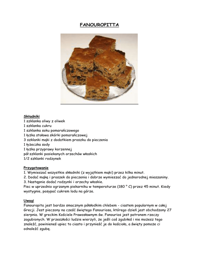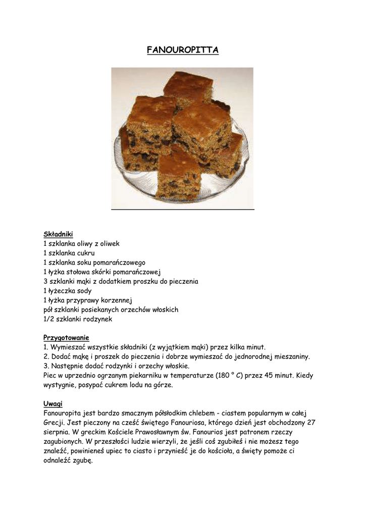 FANOUROPITTA Składniki 1 szklanka oliwy z oliwek 1 szklanka cukru 1 szklanka soku pomarańczowego 1 łyżka stołowa skórki pomarańczowej 3 szklanki mąki z dodatkiem proszku do pieczenia 1 łyżeczka sody 1 łyżka przyprawy korzennej pół szklanki posiekanych orzechów włoskich 1/2 szklanki rodzynek Przygotowanie 1. Wymieszać wszystkie składniki (z wyjątkiem mąki) przez kilka minut. 2. Dodać mąkę i proszek do pieczenia i dobrze wymieszać do jednorodnej mieszaniny. 3. Następnie dodać rodzynki i orzechy włoskie. Piec w uprzednio ogrzanym piekarniku w temperaturze (180 ° C) przez 45 minut. Kiedy wystygnie, posypać cukrem lodu na górze. Uwagi Fanouropita jest bardzo smacznym półsłodkim chlebem - ciastem popularnym w całej Grecji. Jest pieczony na cześć świętego Fanouriosa, którego dzień jest obchodzony 27 sierpnia. W greckim Kościele Prawosławnym św. Fanourios jest patronem rzeczy zagubionych. W przeszłości ludzie wierzyli, że jeśli coś zgubiłeś i nie możesz tego znaleźć, powinieneś upiec to ciasto i przynieść je do kościoła, a święty pomoże ci odnaleźć zgubę. W przeszłości również ludzie wierzyli, że jeśli panna upiecze to ciasto, może zobaczyć swojego przyszłego męża we śnie. Z dawnych tradycji do dzisiaj pozostał zwyczaj, przynoszenia przez wiernych upieczonego ciasta do kościoła 27 sierpnia, w dniu św. Fanouriusa.