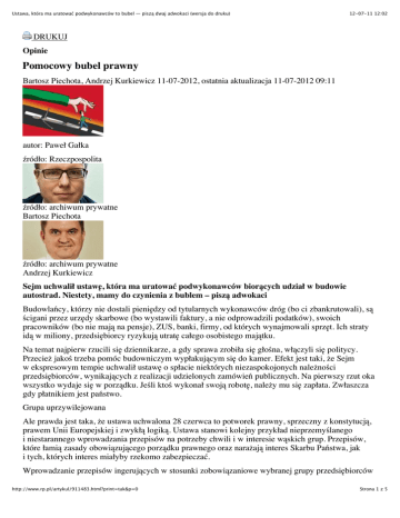 Ustawa, która ma uratować podwykonawców to bubel — piszą dwaj adwokaci (wersja do druku) 12-07-11 12:02 DRUKUJ Opinie Pomocowy bubel prawny Bartosz Piechota, Andrzej Kurkiewicz 11-07-2012, ostatnia aktualizacja 11-07-2012 09:11 autor: Pawe! Ga!ka "ród!o: Rzeczpospolita "ród!o: archiwum prywatne Bartosz Piechota "ród!o: archiwum prywatne Andrzej Kurkiewicz Sejm uchwali! ustaw", która ma uratowa# podwykonawców bior$cych udzia! w budowie autostrad. Niestety, mamy do czynienia z bublem – pisz$ adwokaci Budowla#cy, którzy nie dostali pieni$dzy od tytularnych wykonawców dróg (bo ci zbankrutowali), s% &cigani przez urz$dy skarbowe (bo wystawili faktury, a nie odprowadzili podatków), swoich pracowników (bo nie maj% na pensje), ZUS, banki, firmy, od których wynajmowali sprz$t. Ich straty id% w miliony, przedsi$biorcy ryzykuj% utrat$ ca!ego osobistego maj%tku. Na temat najpierw rzucili si$ dziennikarze, a gdy sprawa zrobi!a si$ g!o&na, w!%czyli si$ politycy. Przecie' jako& trzeba pomóc budowniczym wyp!akuj%cym si$ do kamer. Efekt jest taki, 'e Sejm w ekspresowym tempie uchwali! ustaw$ o sp!acie niektórych niezaspokojonych nale'no&ci przedsi$biorców, wynikaj%cych z realizacji udzielonych zamówie# publicznych. Na pierwszy rzut oka wszystko wydaje si$ w porz%dku. Je&li kto& wykona! swoj% robot$, nale'y mu si$ zap!ata. Zw!aszcza gdy p!atnikiem jest pa#stwo. Grupa uprzywilejowana Ale prawda jest taka, 'e ustawa uchwalona 28 czerwca to potworek prawny, sprzeczny z konstytucj%, prawem Unii Europejskiej i zwyk!% logik%. Ustawa stanowi kolejny przyk!ad nieprzemy&lanego i niestarannego wprowadzania przepisów na potrzeby chwili i w interesie w%skich grup. Przepisów, które !ami% zasady obowi%zuj%cego porz%dku prawnego oraz nara'aj% interes Skarbu Pa#stwa, jak i tych, których interes mia!yby rzekomo zabezpiecza(. Wprowadzanie przepisów ingeruj%cych w stosunki zobowi%zaniowe wybranej grupy przedsi$biorców http://www.rp.pl/artykul/911483.html?print=tak&p=0 Strona 1 z 5 Ustawa, która ma uratować podwykonawców to bubel — piszą dwaj adwokaci (wersja do druku) 12-07-11 12:02 i zdejmowanie z nich ryzyka zwi%zanego z prowadzeniem dzia!alno&ci gospodarczej narusza konstytucyjn% zasad$ równo&ci, a tak'e mo'e stanowi( niedopuszczaln% pomoc publiczn%. Uprzywilejowanie, wyra"nie na potrzeby chwili, jednej grupy nie znajduje 'adnego uzasadnienia w porz%dku prawnym. Problemy wykonawców nie powinny by( rozwi%zywane poprzez uchwalanie specjalnej ustawy. Umowy o roboty budowlane b%d" umowy na dostaw$ materia!ów zwi%zane z budow% autostrad nie tworz% stosunku zobowi%zaniowego, który swoim stopniem skomplikowania znacz%co przewy'sza!by inne umowy wyst$puj%ce w powszechnym obrocie gospodarczym. Tak jak w przypadku wi$kszo&ci umów na etapie ich zawierania istnieje mo'liwo&( uregulowania praw i obowi%zków stron w taki sposób, aby nale'ycie zabezpieczy( si$ na wypadek niewyp!acalno&ci partnera. Problem w tym, 'e spora cz$&( umów (do których b$dzie mia!a zastosowanie nowa ustawa) nie zawiera dostatecznie precyzyjnego opisu praw i obowi%zków stron. Problemy podwykonawców wynikaj% z og!oszenia upad!o&ci lidera konsorcjum buduj%cego autostrady. A przecie' wystarczaj%ce dla zabezpieczenia ich interesów by!oby zawarcie umowy ze wszystkimi cz!onkami konsorcjum. Taki zapis stworzy!by podstawy do solidarnej odpowiedzialno&ci wszystkich udzia!owców konsorcjum i mo'liwo&ci dochodzenia roszczenia nie tylko od podmiotu upad!ego. Co zrobi Bruksela? Inn% wad% nowej ustawy jest fakt, 'e rz%d, przygotowuj%c jej projekt, w ca!o&ci pomin%! przepisy dotycz%ce zasad udzielania pomocy publicznej. A te s% jasne i precyzyjne. Zgodnie z art. 108 ust. 3 traktatu o funkcjonowaniu Unii Europejskiej (w skrócie TfUE) o wszelkich planach przyznania pomocy publicznej rz%d krajowy zobowi%zany jest poinformowa( Komisj$ Europejsk% w celu umo'liwienia jej przedstawienia uwag. W przypadku, gdy plan nie jest zgodny z „rynkiem wewn$trznym" w rozumieniu artyku!u 107 TfUE (czyli z zasadami udzielania pomocy publicznej wypracowanymi przez m.in. Trybuna! Sprawiedliwo&ci i Komisj$ Europejsk%), Komisja Europejska wszczyna procedur$ sprawdzaj%c%, a do czasu wydania decyzji ko#cowej pa#stwo cz!onkowskie nie mo'e wprowadza( w 'ycie projektowanych przepisów. Projekt nie zosta! poddany tej procedurze, co wynika wprost z opinii ministra spraw zagranicznych za!%czonej do projektu ustawy. Jakie to rodzi skutki? Brak opinii Komisji Europejskiej przed uchwaleniem projektu stanowi naruszenie art. 108 ust. 3 TfUE. W konsekwencji KE mo'e uzna(, 'e mamy do czynienia z zakazan% pomoc% publiczn% dla przedsi$biorców. Dlatego przedsi$biorcy, którzy od Skarbu Pa#stwa uzyskaj% zap!at$ na podstawie przepisów ustawy, musz% si$ liczy( z ewentualnym obowi%zkiem zwrotu uzyskanych &wiadcze#. Nietrudno przewidzie(, jaki chaos wywo!a!aby taka sytuacja. Po!o'enie przedsi$biorców budowlanych by!oby jeszcze gorsze, ni' ma to miejsce w tej chwili. Co wi$cej, orzeczony za jaki& czas obowi%zek zwrotu do Skarbu Pa#stwa uzyskanej pomocy nie spowoduje automatycznego przeniesienia wierzytelno&ci w stosunku do generalnego wykonawcy z powrotem na podwykonawc$. W mi$dzyczasie Skarb Pa#stwa, który wraz z udzieleniem pomocy podwykonawcom z mocy prawa przejmie ich wierzytelno&(, mo'e doprowadzi( do ich wyga&ni$cia (np. bilansuj%c j% z wierzytelno&ciami generalnego wykonawcy w stosunku do Skarbu Pa#stwa). W takim przypadku wierzytelno&(, która pierwotnie przys!ugiwa!a podwykonawcy, przestanie istnie( i ju' nigdy nie b$dzie mog!a by( zwrócona. Spalone gwarancje To prawda, 'e nie pierwszy raz Sejm uchwali! ustaw$ o pomocy publicznej bez opinii KE. Tak by!o z ustaw% z 1 lipca 2009 r. o !agodzeniu skutków kryzysu ekonomicznego dla pracowników i przedsi$biorców. Z tym 'e wtedy ustawodawca wyra"nie stwierdzi!, i' „ustaw$ stosuje si$ od dnia og!oszenia pozytywnej decyzji Komisji Europejskiej o zgodno&ci pomocy publicznej przewidzianej w tych przepisach ze wspólnym 