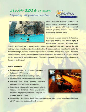 Jesień 2016 (4-11.09) Odpocznij nad polskim morzem! Jeżeli szukacie Państwo miejsca, w którym można wypocząć , zrelaksować się, jak i spędzić aktywnie jarzębin jesienny tydzień wśród na pewno skorzystacie z naszej oferty. Na terenie naszego ośrodka do Państwa dyspozycji znajduje się basen kryty z wodospadem, biczami wodnymi oraz ścianką wspinaczkową , sauna fińska, boisko do siatkówki plażowej, boisko do piłki nożnej, boisko wielofunkcyjne typu „Orlik”, Beach soccer, sala do koszykówki, salka do tenisa stołowego, mobilna ścianka wspinaczkowa. siłownia , rowery oraz kajaki. Jesienne wędkowanie na morzu jeziorze pewno dostarczy wrażeń. Nazbierane w naszych lasach grzyby ususzycie w piecu chlebowym. Wieczorem możecie Państwo spędzić miło czas w Karczmie Myśliwskiej Oferta obejmuje: Zakwaterowanie w pokojach/domkach z łazienkami (TV, Internet ), Śniadania w formie szwedzkiego stołu, Obiadokolacja + bufet kawowy z ciastem, Biesiadę pod wiatą grillową, pieczenie kiełbasek oraz wędzenie ryb,karaoke Korzystanie z basenu krytego, sauny, salki do kosza , salki do tenisa stołowego, rowerów, kajaków turystycznych,siłowni wejście na ściankę wspinaczkową, Korzystanie z kompleksu boisk (pełnowymiarowe do piłki nożnej, wielofunkcyjne typu „Orlik”, siatkówka plażowa, Beach soccer). W najbliższej okolicy warto odwiedzić: (Oferujemy pomoc przy organizacji wycieczek) ▪ Słowiński Park Narodowy, ruchome wydmy ▪ Park Dinozaurów (www.lebapark.pl) ▪ Fokarium (www.seapark.pl) ▪ Skansen Słowińców w Klukach (w dniach ▪ Latarnia Morska w Stilo ▪ Stadniny koni, jezioro Sarbsko(200m) Kontakt Wszelkie informacje oraz rezerwacje Koszt pobytu +48 696 423 562 lub [email protected] Osoba dorosła - 120 zł za dobę dzieci do lat 3 - bezpłatnie Dane do przelewu: dzieci od 3 lat do 7 lat - 50% ceny P.U.H „JK” dzieci od 8 lat do 17 lat - 80% ceny Nowęcin ul. Łebska 13 84-360 Łeba 83 2490 0005 0000 4500 1578 2724 Więcej informacji oraz galeria zdjęć na stronach: www.leba-janina.pl www.facebook.com/lebajanina