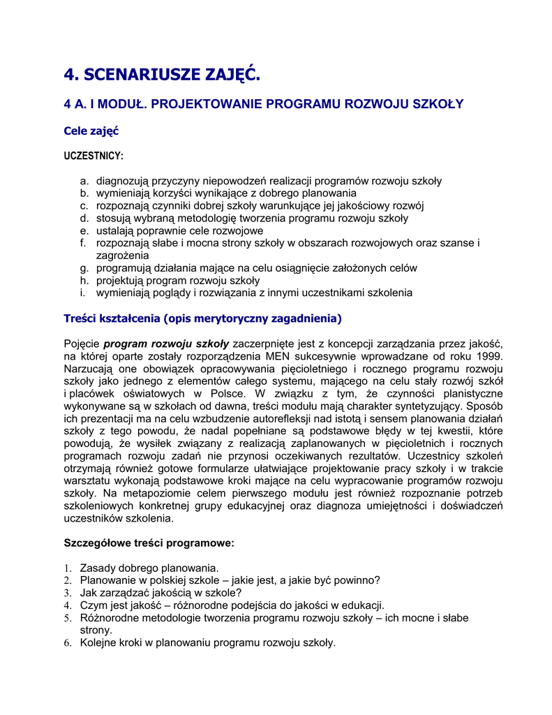 4. SCENARIUSZE ZAJĘĆ. 4 A. I MODUŁ. PROJEKTOWANIE PROGRAMU ROZWOJU SZKOŁY Cele zajęć UCZESTNICY: diagnozują przyczyny niepowodzeń realizacji programów rozwoju szkoły wymieniają korzyści wynikające z dobrego planowania rozpoznają czynniki dobrej szkoły warunkujące jej jakościowy rozwój stosują wybraną metodologię tworzenia programu rozwoju szkoły ustalają poprawnie cele rozwojowe rozpoznają słabe i mocna strony szkoły w obszarach rozwojowych oraz szanse i zagrożenia g. programują działania mające na celu osiągnięcie założonych celów h. projektują program rozwoju szkoły i. wymieniają poglądy i rozwiązania z innymi uczestnikami szkolenia a. b. c. d. e. f. Treści kształcenia (opis merytoryczny zagadnienia) Pojęcie program rozwoju szkoły zaczerpnięte jest z koncepcji zarządzania przez jakość, na której oparte zostały rozporządzenia MEN sukcesywnie wprowadzane od roku 1999. Narzucają one obowiązek opracowywania pięcioletniego i rocznego programu rozwoju szkoły jako jednego z elementów całego systemu, mającego na celu stały rozwój szkół i placówek oświatowych w Polsce. W związku z tym, że czynności planistyczne wykonywane są w szkołach od dawna, treści modułu mają charakter syntetyzujący. Sposób ich prezentacji ma na celu wzbudzenie autorefleksji nad istotą i sensem planowania działań szkoły z tego powodu, że nadal popełniane są podstawowe błędy w tej kwestii, które powodują, że wysiłek związany z realizacją zaplanowanych w pięcioletnich i rocznych programach rozwoju zadań nie przynosi oczekiwanych rezultatów. Uczestnicy szkoleń otrzymają również gotowe formularze ułatwiające projektowanie pracy szkoły i w trakcie warsztatu wykonają podstawowe kroki mające na celu wypracowanie programów rozwoju szkoły. Na metapoziomie celem pierwszego modułu jest również rozpoznanie potrzeb szkoleniowych konkretnej grupy edukacyjnej oraz diagnoza umiejętności i doświadczeń uczestników szkolenia. Szczegółowe treści programowe: Zasady dobrego planowania. Planowanie w polskiej szkole – jakie jest, a jakie być powinno? Jak zarządzać jakością w szkole? Czym jest jakość – różnorodne podejścia do jakości w edukacji. Różnorodne metodologie tworzenia programu rozwoju szkoły – ich mocne i słabe strony. 6. Kolejne kroki w planowaniu programu rozwoju szkoły. 1. 2. 3. 4. 5. 7. Czynniki dobrej szkoły warunkujące jej jakościowy rozwój. 8. Wizja i misja szkoły podstawowym źródłem planowania. 9. Formułowanie celów rozwojowych. 10. Rozpoznanie sytuacji szkoły – analiza SWOT. 11. Projektowanie działań służących osiągnięciu założonych celów rozwojowych. 12. Przykłady dobrej praktyki. 13. Prezentacja opracowanych programów i wymiana doświadczeń. Metody i techniki: ćwiczenia integrujące grupę metaplan dyskusja analiza SWOT praca w grupie mini-wykłady z wykorzystaniem prezentacji multimedialnej gwiazda pytań Środki dydaktyczne: projektor multimedialny tablica flip-chart pisaki blue-tag materiały pomocnicze Proponowane ćwiczenia: 1. Runda - prezentacje prowadzących, uczestników szkolenia na temat: Twoje doświadczenia i umiejętności związane z tworzeniem programów rozwoju szkoły oraz planowaniem i realizacją projektów z wykorzystaniem różnorodnych funduszy. 2. Ćwiczenie integrujące, mające na celu zapamiętanie imion uczestników szkolenia: To jest np. długopis, który dostałam od… 3. Prezentacja celów szkolenia. 4. Analiza oczekiwań uczestników wobec szkolenia: uczestnicy na kartkach samoprzylepnych zamieszczają na plakacie swoje oczekiwania wobec szkolenia. Prowadzący grupuje je i ustosunkowuje się do oczekiwań zespołu. 5. Przedstawienie zasad uczestnictwa w szkoleniu: zasady wynikające z organizacji szkolenia oraz zasady dotyczące uzyskiwania certyfikatu. 6. Zawarcie kontraktu grupowego – zasady obowiązujące w naszej grupie podczas zajęć. 7. Diagnoza sytuacji edukacyjnej: Metodą metaplanu zaprezentuj planowanie w Twojej szkole, jakie jest, jakie być powinno, dlaczego nie jest takie, jakie być powinno, wnioski – praca w czterech – pięciu grupach. Prowadzący wyjaśnia zasady obowiązujące w pracy metodą metaplanu, dzieli zespół na grupy. 8. Prezentacja plakatów. 9. Dyskusja, wnioski: na co zostanie położony nacisk w tej grupie z uwagi na jej specyfikę. 10. Mini-wykład prowadzącego z wykorzystaniem slajdów: Różne podejścia do jakości, Czy konsekwentnie liczymy do czterech, system zapewniania jakości, dwa modele planowania. 11. Ćwiczenie – praca w grupach: Słabe i mocne strony planowania ekstrapolacyjnego i antycypacyjnego. 12. Prezentacja plakatów. 13. Dyskusja i wnioski. 14. Mini-wykład: Program rozwoju szkoły – krok po kroku. 15. Mini-wykład: Krok pierwszy - wizja szkoły, cechy dobrej wizji. 16. Praca w grupach: Wykorzystując Materiał pomocniczy nr 1. Różnorodne wizje, grupy opisują słabe i mocne strony konkretnych wizji szkół. 17. Prezentacja wniosków na forum grupy. 18. Mini-wykład: Czynniki dobrej szkoły, na co warto zwrócić uwagę, projektując wizję własnej szkoły? (prezentacja wyników badań) 19. Praca w grupach – projektowanie wizji własnej szkoły (Wykorzystaj własne doświadczenia, doświadczenia innych szkół oraz wiedzę wyniesioną z tej części szkolenia, zaprojektuj wizję swojej szkoły na najbliższe trzy lata).. 20. Prezentacje wizji. 21. Dyskusja: słabe o mocne strony naszych wizji. 22. Mini-wykład: Krok drugi - misja szkoły głównym celem działań społeczności szkolnej. 23. Praca w grupach: Analizując misje różnych szkół zaprezentowanych w materiale 2 wskaż ich słabe i mocje strony. (Materiał pomocniczy 2. Misja szkoły) 24. Praca grupowa – opracuj misję własnej szkoły, korzystając z załączonych pytań (Materiał pomocniczy 3. Misja szkoły – zestaw pytań) 25. Mini-wykład: Krok trzeci - formułowanie celów rozwojowych szkoły 