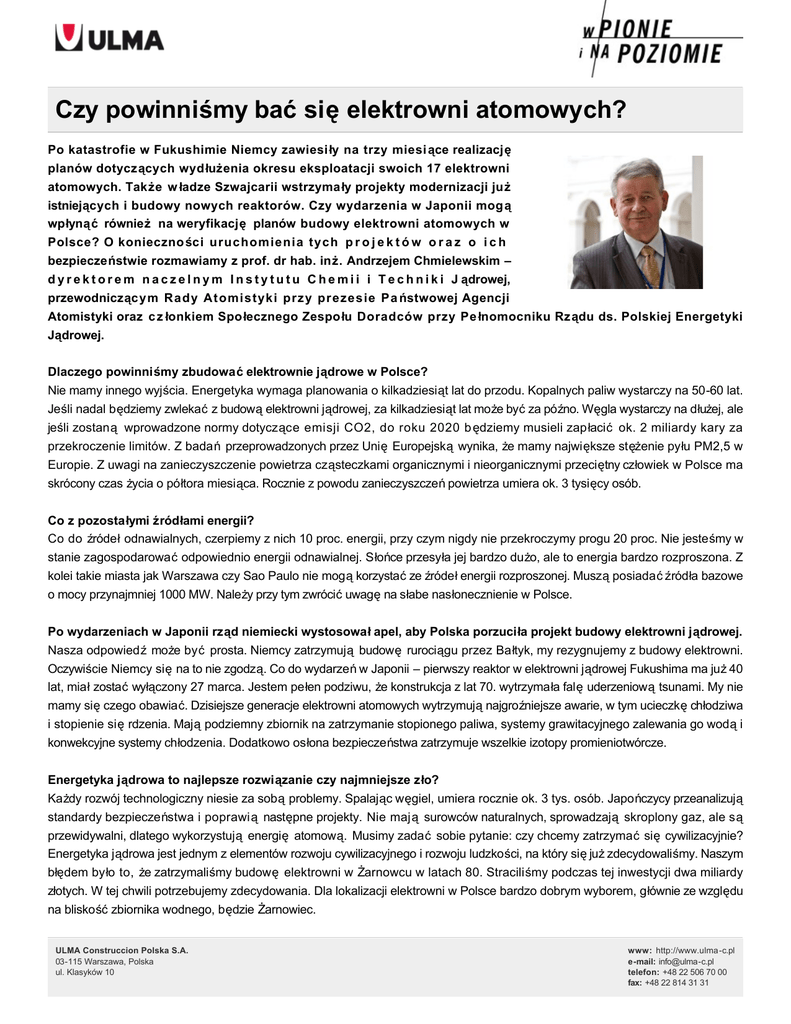 Czy powinniśmy bać się elektrowni atomowych? Po katastrofie w Fukushimie Niemcy zawiesiły na trzy miesi ące realizację planów dotyczących wyd łużenia okresu eksploatacji swoich 17 elektrowni atomowych. Także w ładze Szwajcarii wstrzymały projekty modernizacji już istniejących i budowy nowych reaktorów. Czy wydarzenia w Japonii mog ą wpłynąć również na weryfikację planów budowy elektrowni atomowych w Polsce? O konieczno ści uruchomienia tych p r o j e k t ó w o r a z o i c h bezpieczeństwie rozmawiamy z prof. dr hab. inż. Andrzejem Chmielewskim – d y r e k t o r e m n a c z e l n y m I n s t y t u t u C h e m i i i T e c h n i k i J ądrowej, przewodniczącym Rady Atomistyki przy prezesie Pa ństwowej Agencji Atomistyki oraz c z łonkiem Społecznego Zespołu Doradców przy Pe łnomocniku Rządu ds. Polskiej Energetyki Jądrowej. Dlaczego powinniśmy zbudować elektrownie jądrowe w Polsce? Nie mamy innego wyjścia. Energetyka wymaga planowania o kilkadziesiąt lat do przodu. Kopalnych paliw wystarczy na 50-60 lat. Jeśli nadal będziemy zwlekać z budową elektrowni jądrowej, za kilkadziesiąt lat może być za późno. Węgla wystarczy na dłużej, ale jeśli zostaną wprowadzone normy dotyczące emisji CO2, do roku 2020 b ędziemy musieli zapłacić ok. 2 miliardy kary za przekroczenie limitów. Z badań przeprowadzonych przez Unię Europejską wynika, że mamy największe stężenie pyłu PM2,5 w Europie. Z uwagi na zanieczyszczenie powietrza cząsteczkami organicznymi i nieorganicznymi przeciętny człowiek w Polsce ma skrócony czas życia o półtora miesiąca. Rocznie z powodu zanieczyszczeń powietrza umiera ok. 3 tysięcy osób. Co z pozostałymi źródłami energii? Co do źródeł odnawialnych, czerpiemy z nich 10 proc. energii, przy czym nigdy nie przekroczymy progu 20 proc. Nie jesteśmy w stanie zagospodarować odpowiednio energii odnawialnej. Słońce przesyła jej bardzo dużo, ale to energia bardzo rozproszona. Z kolei takie miasta jak Warszawa czy Sao Paulo nie mogą korzystać ze źródeł energii rozproszonej. Muszą posiadać źródła bazowe o mocy przynajmniej 1000 MW. Należy przy tym zwrócić uwagę na słabe nasłonecznienie w Polsce. Po wydarzeniach w Japonii rząd niemiecki wystosował apel, aby Polska porzuciła projekt budowy elektrowni jądrowej. Nasza odpowiedź może być prosta. Niemcy zatrzymują budowę rurociągu przez Bałtyk, my rezygnujemy z budowy elektrowni. Oczywiście Niemcy się na to nie zgodzą. Co do wydarzeń w Japonii – pierwszy reaktor w elektrowni jądrowej Fukushima ma już 40 lat, miał zostać wyłączony 27 marca. Jestem pełen podziwu, że konstrukcja z lat 70. wytrzymała falę uderzeniową tsunami. My nie mamy się czego obawiać. Dzisiejsze generacje elektrowni atomowych wytrzymują najgroźniejsze awarie, w tym ucieczkę chłodziwa i stopienie się rdzenia. Mają podziemny zbiornik na zatrzymanie stopionego paliwa, systemy grawitacyjnego zalewania go wodą i konwekcyjne systemy chłodzenia. Dodatkowo osłona bezpieczeństwa zatrzymuje wszelkie izotopy promieniotwórcze. Energetyka jądrowa to najlepsze rozwiązanie czy najmniejsze zło? Każdy rozwój technologiczny niesie za sobą problemy. Spalając węgiel, umiera rocznie ok. 3 tys. osób. Japończycy przeanalizują standardy bezpieczeństwa i poprawią następne projekty. Nie mają surowców naturalnych, sprowadzają skroplony gaz, ale są przewidywalni, dlatego wykorzystują energię atomową. Musimy zadać sobie pytanie: czy chcemy zatrzymać się cywilizacyjnie? Energetyka jądrowa jest jednym z elementów rozwoju cywilizacyjnego i rozwoju ludzkości, na który się już zdecydowaliśmy. Naszym błędem było to, że zatrzymaliśmy budowę elektrowni w Żarnowcu w latach 80. Straciliśmy podczas tej inwestycji dwa miliardy złotych. W tej chwili potrzebujemy zdecydowania. Dla lokalizacji elektrowni w Polsce bardzo dobrym wyborem, głównie ze względu na bliskość zbiornika wodnego, będzie Żarnowiec. ULMA Construccion Polska S.A. 03-115 Warszawa, Polska ul. Klasyków 10 www: http://www.ulma -c.pl e-mail: [email protected] telefon: +48 22 506 70 00 fax: +48 22 814 31 31