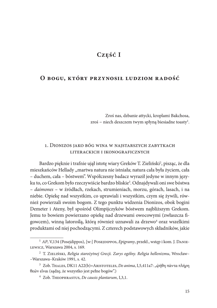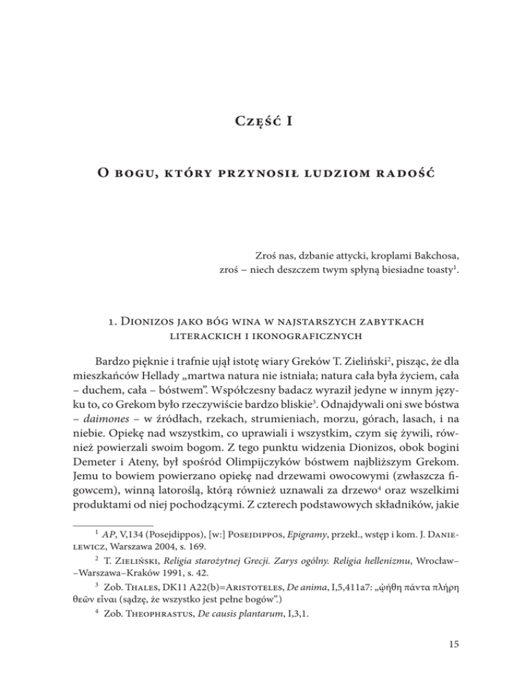 Część I: O bogu, który przynosił ludziom radość Zroś nas, dzbanie attycki, kroplami Bakchosa, zroś – niech deszczem twym spłyną biesiadne toasty1. 1. Dionizos jako bóg wina w najstarszych zabytkach literackich i ikonograficznych Bardzo pięknie i trafnie ujął istotę wiary Greków T. Zieliński2, pisząc, że dla mieszkańców Hellady „martwa natura nie istniała; natura cała była życiem, cała – duchem, cała – bóstwem”. Współczesny badacz wyraził jedyne w innym języku to, co Grekom było rzeczywiście bardzo bliskie3. Odnajdywali oni swe bóstwa – daimones – w źródłach, rzekach, strumieniach, morzu, górach, lasach, i na niebie. Opiekę nad wszystkim, co uprawiali i wszystkim, czym się żywili, również powierzali swoim bogom. Z tego punktu widzenia Dionizos, obok bogini Demeter i Ateny, był spośród Olimpijczyków bóstwem najbliższym Grekom. Jemu to bowiem powierzano opiekę nad drzewami owocowymi (zwłaszcza figowcem), winną latoroślą, którą również uznawali za drzewo4 oraz wszelkimi produktami od niej pochodzącymi. Z czterech podstawowych składników, jakie 1 AP, V,134 (Posejdippos), [w:] Posejdippos, Epigramy, przekł., wstęp i kom. J. Danielewicz, Warszawa 2004, s. 169. 2 T. Zieliński, Religia starożytnej Grecji. Zarys ogólny. Religia hellenizmu, Wrocław– –Warszawa–Kraków 1991, s. 42. 3 Zob. Thales, DK11 A22(b)=Aristoteles, De anima, I,5,411a7: „ᾠήθη πάντα πλήρη θεῶν εἶναι (sądzę, że wszystko jest pełne bogów”.) 4 Zob. Theophrastus, De causis plantarum, I,3,1. 15 Część I: O bogu, który przynosił ludziom radość najczęściej pojawiały się na stole Greka, aż nad dwoma z nich – właśnie figą i winem, pieczę sprawował syn Zeusa i Semele. Wino, bez którego trudno sobie wyobrazić Grecję starożytną, znane było na jej obszarze na długo przed Homerem; kosztowali go już z pewnością Minojczycy, choć trudno powiedzieć, czy było u nich w powszechnym użyciu; w okresie mykeńskim natomiast, sądząc chociażby po ilości zachowanych pitchosów do przechowywania wina, było trunkiem dość rozpowszechnionym. Pytanie o to, czy było ono już w tak wczesnym okresie utożsamiane z samym bogiem, to jedna z najbardziej kontrowersyjnych kwestii, jakie napotykamy w związku z kultem Dionizosa. Pośród odpowiedzi na tak sformułowane pytanie wyraźnie zarysowują się trzy skrajne stanowiska. Zwolennicy pierwszego z nich uważają, że wynalezienie winnej latorośli, jej uprawa i przetwarzanie łącznie z konsekracją wina zostały późno przypisane Dionizosowi. Koronnym argumentem, na którym opierano tę tezę, były poematy Homera, w których, jak podkreślano, chociaż często jesteśmy świadkami ofiar, składanych między innymi z wina, i uczt, na których pojawia się ten napój, to jednak poeta nigdy nie wymienia przy tej okazji Dionizosa. W postaci skrajnej stanowisko to doprowadziło niektórych uczonych do postawienia tezy, iż o Dionizosie – bogu wina możemy mówić dopiero w okresie późno archaicznym i klasycznym5. Zwolennicy drugiego stanowiska twierdzą z kolei, że wino występowało w kulcie boga nawet w bardzo wczesnych wiekach, ale było używane tylko i wyłącznie w celu wzmożenia ekstazy bakchicznej6. 5 Zob. K.O. Müller, Kleine deutsche Schriften über Religion, Kunst, Sprache und Literatur, Leben und Geschichte des Alterthums, t. II, Breslau 1847–1848, s. 28nn; U. Von Wilamowitz Moellendorff, Der Glaube der Hellenen, Berlin 1931–32, s. 60; E. Rhode, Psyche. The Cult of Souls and Belief in Immortality among Ancient Greeks, przekł. W.B. Hillis, London 2000, s. 285: „The primitive charakter of Dionysos the Lord of Spirits and of the Souls of the dead – a very different figure indeed from the tender and delicate Wine-God of later times”; (wyd. pol.: E. Rhode, Psyche. Kult duszy i wiara w nieśmiertelność u starożytnych Greków, przekł. J. Korpanty, Kęty 2006, s. 194; zob. także s. 256, 260); M.P. Nilsson, Geschichte der griechischen Religion I–II, München 1955–1961, s. 585: „Der Weinbau ist aber in Griechenland viel älter als Dionysos, und so ist Dionysos nachträglich in die mit dem Weinbau verbundenen Bräuche hineingekommen”; J.E. Harrison, Prolegomena, … s. 428: „He is god of all growing things, (...) and only later exclusively of the vine”; W.K.C. Guthrie, The Greeks and their Gods…, s. 164: „there are no direct references in Homer to Dionysos as god of wine, and the inference has been made that this was not a part of his original nature. Certainly Dionysos was very much more than the god of wine”; H. Jeanmaire, Dioniso. Religione e cultura in Grecia, przekł. G. Glaesser, Torino 1972, s. 20nn; D. Obbink, Dionysus Poured Out: Ancient and Modern Theories of Sacrifice and Cultural Formation, [w:] Masks of Dionysus…, s. 78: „Hand in hand with this process went the identification of Dionysus himself with wine, an indetification attested as early as the fifth century B. C.”. 6 Zob. M.P. Nilsson, Griechische Feste von religiöser Bedeutung, mit Ausschluss der attischen, Leipzig 1906, s. 278, 292; O. Kern, Die Religion der Griechen, Berlin 1926, s. 227. 16 1. Dionizos jako bóg wina w najstarszych zabytkach literackich i ikonograficznych Zwolennicy trzeciego stanowiska stawiają natomiast hipotezę, że wino było powiązane z bogiem Dionizosem na długo przed Homerem, być może nawet w II tysiącleciu p.n.e., ale najprawdopodobniej nie było czynnikiem, który wywoływał ekstazę bakchantów7. W Iliadzie (ks. XIV), na początku opisu miłego tête-à-tête Zeusa z Herą, Olimpijczyk wyznaje swej małżonce, że w tej chwili pożąda jej bardziej niż którejkolwiek ze swych kochanek, przy czym wymienia wszystkie, jakie do tej pory posiadł (w. 315–327). Wśród tego „katalogu kobiet”, który możemy nazwać również „katalogiem zdrad”, odnajdujemy także Semele, której związek z Olimpijczyk