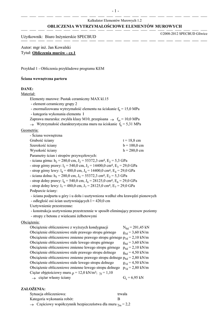 -1Kalkulator Elementów Murowych 1.2 OBLICZENIA WYTRZYMAŁOŚCIOWE ELEMENTÓW MUROWYCH Użytkownik: Biuro Inżynierskie SPECBUD Autor: mgr inż. Jan Kowalski Tytuł: Obliczenia murów - cz.1 Przykład 1 - Obliczenia przykładowe programu KEM Ściana wewnętrzna parteru DANE: Materiał: Elementy murowe: Pustak ceramiczny MAX kl.15 - element ceramiczny grupy 2 - znormalizowana wytrzymałość elementu na ściskanie fb = 15,0 MPa - kategoria wykonania elementu I Zaprawa murarska: zwykła klasy M10, przepisana → fm = 10,0 MPa → Wytrzymałość charakterystyczna muru na ściskanie fk = 5,31 MPa Geometria: - Ściana wewnętrzna Grubość ściany t = 18,8 cm Szerokość ściany b = 100,0 cm Wysokość ściany h = 280,0 cm Parametry ścian i stropów przywęzłowych: - ściana górna: h2 = 280,0 cm, J2 = 55372,3 cm4, E2 = 5,3 GPa - strop górny prawy: l3 = 540,0 cm, J3 = 14400,0 cm4, E3 = 29,0 GPa - strop górny lewy: l4 = 480,0 cm, J4 = 14400,0 cm4, E4 = 29,0 GPa - ściana dolna: h5 = 280,0 cm, J5 = 55372,3 cm4, E2 = 5,3 GPa - strop dolny prawy: l6 = 540,0 cm, J6 = 28125,0 cm4, E6 = 29,0 GPa - strop dolny lewy: l7 = 480,0 cm, J7 = 28125,0 cm4, E7 = 29,0 GPa Podparcie ściany: - ściana podparta u góry i u dołu i usztywniona wzdłuż obu krawędzi pionowych - odległość osi ścian usztywniających l = 420,0 cm Usztywnienie przestrzenne: - konstrukcja usztywniona przestrzennie w sposób eliminujący przesuw poziomy - stropy z betonu z wieńcami żelbetowymi Obciążenia: Obciążenie obliczeniowe z wyższych kondygnacji N0d = 201,45 kN Obciążenie obliczeniowe stałe prawego stropu górnego g3d = 3,60 kN/m Obciążenie obliczeniowe zmienne prawego stropu górnego p3d = 2,10 kN/m Obciążenie obliczeniowe stałe lewego stropu górnego g4d = 3,60 kN/m Obciążenie obliczeniowe zmienne lewego stropu górnego p4d = 2,10 kN/m Obciążenie obliczeniowe stałe prawego stropu dolnego g6d = 4,50 kN/m Obciążenie obliczeniowe zmienne prawego stropu dolnego p6d = 2,80 kN/m Obciążenie obliczeniowe stałe lewego stropu dolnego g7d = 4,50 kN/m Obciążenie obliczeniowe zmienne lewego stropu dolnego p7d = 2,80 kN/m Ciężar objętościowy muru ρ = 12,0 kN/m3; γf = 1,10 Gs = 6,95 kN → ciężar własny ściany ZAŁOŻENIA: Sytuacja obliczeniowa: trwała Kategoria wykonania robót: B → Częściowy współczynnik bezpieczeństwa dla muru γm = 2,2 ©2008-2012 SPECBUD Gliwice -2- 201,45 201,45 201,45 WYNIKI - ŚCIANA OBCIĄŻONA OSIOWO (model ciągły) (wg PN-B-03002:2007): h2 g4d= 3,60 p3d= 2,10 l4=480,0 g3d= 3,60 l3=540,0 18,8 280,0 p4d= 2,10 p6d= 2,80 g7d= 4,50 g6d= 4,50 l6=540,0 h5 l7=480,0 237,46 237,46 237,46 p7d= 2,80 Warunek nośności pod stropem: Φ1 = 0,816 A = 0,19 m2, fd = 1,89 MPa N1d = 225,48 kN < N1R,d = Φ1·A·fd = 289,94 kN (77,8%) Warunek nośności w strefie środkowej: Φm = 0,611 A = 0,19 m2, fd = 1,89 MPa Nmd = 228,95 kN > NmR,d = Φm·A·fd = 217,39 kN (105,3%) Warunek nośności nad stropem: Φ2 = 0,825 A = 0,19 m2, fd = 1,89 MPa N2d = 237,46 kN < N2R,d = Φ2·A·fd = 293,33 kN (81,0%) Ściana zewnętrzna na parcie wiatru DANE: Materiał: Elementy murowe: Pustak ceramiczny MAX kl.15 - element ceramiczny grupy 2 - znormalizowana wytrzymałość elementu na ściskanie fb = 15,0 MPa - kategoria wykonania elementu I Zaprawa murarska: zwykła klasy M10, przepisana → fm = 10,0 MPa → Wytrzymałość charakterystyczna muru na ściskanie fk = 5,31 MPa Geometria: Grubość ściany Szerokość ściany Wysokość ściany Schemat podpracia krawędzi ściany - krawędź górna - krawędź górna - krawędź pionowa lewa - krawędź pionowa prawa t = 18,8 cm b = 420,0 cm h = 280,0 cm płyta: podparta przegubowo podparta przegubowo podparta przegubowo podparta przegubowo Obciążenia: Obciążenie poziome od parcia wiatru wd = 0,567 kN/m2 ← !!! -3- ZAŁOŻENIA: Sytuacja obliczeniowa: trwała Kategoria wykonania robót: B → Częściowy współczynnik bezpieczeństwa dla muru γm = 2,2 280,0 WYNIKI - ŚCIANA OBCIĄŻONA POZIOMO (wg PN-B-03002:2007): wd= 0,567 kN/m2 420,0 Warunek nośności w płaszczyźnie prostopadłej do spoin wspornych: MSd = α·wd·L2 = 0,053·0,567 kN/m2 ·(1,05·4,20 m)2 = 0,59 kNm/mb MRd = fxd2·W = 0,182 MPa · 5890,67 cm2/mb = 1,07 kNm/mb MSd = 0,59 kNm/mb < MRd = 1,07 kNm/mb (54,9%) Warunek nośności w płaszczyźnie równoległej do spoin wspornych: MSd = µ· α·wd·H2 = 0,250·0,053·0,567 kN/m2 ·(1,05·2,80 m)2 = 0,07 kNm/mb MRd = fxd1·W = 0,045 MPa · 5890,67 cm2/mb = 0,27 kNm/mb MSd = 0,07 kNm/mb < MRd = 0,27 kNm/mb (24,4%) Ściana piwnic DANE: Materiał: Elementy murowe: Cegła ceramiczna pełna kl.15 - element ceramiczny grupy 1 - znormalizowana wytrzymałość elementu na ściskanie fb = 15,0 MPa - kategoria wykonania elementu I Zaprawa murarska: zwykła klasy M10, przepisana → fm = 10,0 MPa → Wytrzymałość charakterystyczna muru na ściskanie fk = 5,98 MPa Geometria: Grubość ściany t = 25,0 cm Wysokość ściany h = 225,0 cm Odległość między ścianami poprzecznymi lub inny elementami usztywniającymi be = 420,0 cm Obciążenia obliczeniowe: Obciążenie wierzchu ściany wynikające z obciążeń stałych N0d = 127,79 kN/mb Ciężar objętościowy muru ρ = 18,0 kN/m3; γf = 1,10 Gs = 11,14 kN/mb → ciężar własny ściany Wysokość zasypania ściany gruntem he = 190,0 cm Ciężar objętościowy gruntu ρe = 17,0 kN/m3 ZAŁOŻENIA: Sytuacja obliczeniowa: trwała -4Kategoria wykonania robót: B → Częściowy współczynnik bezpieczeństwa dla muru γm = 2,2 <= 1,5 m 127,79 127,79 127,79 WYNIKI - ŚCIANA PIWNIC (wg PN-B-03002:2007): 225,0 134,22 134,22 134,22 190,0 P<=15 kN pe <= 5 kN/m 2 25,0 Sprawdzenie wg Zał.A normy: Obliczeniowe obciążenie pionowe w połowie wysokości zasypania gruntem NSd = 134,22 kN/m NSd = 134,22 kN/m < t·fk /(3· γm) = 226,40 kN/m NSd = 134,22 kN/m > ρe·h·he2 /(22,67·t) = 24,36 kN/m Wniosek: nie jest wymagane obliczeniowe sprawdzenie ściany. koniec wydruku