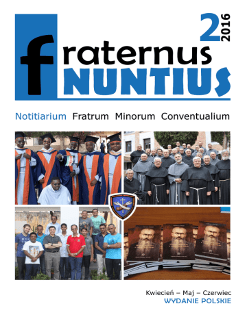 2016 f 2 raternus nuntius Notitiarium Fratrum Minorum Conventualium Kwiecień – Maj – Czerwiec WYDANIE POLSKIE KALENDARIUM MINISTRA GENERALNEGO ............................. 3 QQ AKTA DEFINITORIUM Sesja 04-08 kwietnia 2016 r. ........................................................... 3 Sesja 16-21 maja 2016 r. ................................................................. 5 QQ WYDARZENIA CIRC w Rzymie ..................................................................................... 7 Roberto Carboni OFMConv wyświęcony na biskupa ............ 7 Spotkanie zarządu Franciscans International........................... 8 Nowy biskup w Parramatta w Australii ...................................... 8 Seraphicum: celebracja Jubileuszu Miłosierdzia .....................9 Eucharystia pod przewodnictwem bpa Carboniego ............ 9 Seraphicum: Wyprawa do Cerveteri i Tarquinii ..................... 10 Seraphicum: rekolekcje w Cave .................................................. 11 Śladami Ojca Kolbego ................................................................... 11 QQ URZĘDY GENERALNE SGF Kurs dla wychowawców FAMC .................................................. 13 Działalność SGF w okresie kwiecień-czerwiec ..................... 14 SGAM Czuwanie modlitewne w klasztorze sióstr klarysek .......... 15 „Misja razem” (X edycja) ............................................................... 16 Animacja misyjna w nowicjacie FIMP i w „Franciscanum” ......................................................................... 16 Seminarium SEDOS ....................................................................... 17 Animacja misyjna w domach formacyjnych w Polsce ...... 18 GPSC Seminarium nt. rozwoju i pracy ................................................ 19 Spotkanie na temat przemocy seksualnej ............................ 19 EDI VIII Spotkanie „Pro Dialogo” dla OFMConv ............................ 20 POSTULACJA Dekret o heroiczności cnót Sługi Bożego Wenantego Katarzyńca ................................................................ 21 Dekret o heroiczności cnót Sługi Bożego Luigiego Lo Verde .......................................................................... 21 M. I. Nowa książka o św. Maksymilianie Kolbe .............................. 23 Kolbe wśród męczenników ........................................................ 23 Zgromadzenie narodowe MI w Hiszpanii .............................. 24 Zgromadzenie wyborcze MI w USA ........................................ 25 EKONOMAT Tablica solidarności ....................................................................... 26 QQ koNFERENcje/FEDERAcje AFCOF Spotkanie prowincjalne w Zambii ............................................ 27 Zakończenie roku akademickiego w Lusaka ......................... 28 CEO Nowe sanktuarium maryjne w Bułgarii ................................... 29 CEF „Juniorentreffen” w Wiedniu ....................................................... 30 Wizyta braterska w Belgii ............................................................. 30 Spotkanie z biskupem Danii ....................................................... 31 Spotkanie delegatury holenderskiej ........................................ 32 Spotkanie definitorium prowincji chorwackiej .................... 32 Definitorium kustodii austriacko-szwajcarskiej ................... 33 Definitoria Chorwacji i Słowenii razem ................................... 34 CFF Wizyta w Prowincji św. Bonawentury w USA ........................ 35 FALC Wizytacja kanoniczna w delegaturze w Chile ....................... 36 Kurs dla gwardianów w ramach UCOB .................................... 37 Spotkanie wychowawców w ramach UCOB .......................... 37 Dni Młodzieży Franciszkańskiej w Brazylii ............................. 38 Wizytacja generalna w domach formacyjnych w Meksyku ......................................................................................... 39 Wizyta braterska w postulacie w Kostaryce .......................... 40 Definitoria Ameryki Środkowej razem ..................................... 40 Chile: Spotkanie delegatury ........................................................ 41 Wizytacja kanoniczna Kustodii św. Bonawentury w Brazylii ............................................................................................ 42 Cyfrowe czasopismo MiReFALC ................................................. 43 FAMC Kurs dla gwardianów w Indonezji ............................................. 44 Uroczystości franciszkańskie na Filipinach ............................ 45 Wizytacja kanoniczna w Korei .................................................... 46 FIMP Spotkanie Definitorium generalnego z definitoriami Włoch południowych ....................................... 47 Spotkanie Definitorium generalne z wizytatorami jurysdykcji włoskich ......................................... 48 25 lat posługiwania Grupy misyjnej w Hiszpanii.................. 49 QQ kapituły Chorwacja: kapituła nadzwyczajna .......................................... 50 Wschód (Bliski) - Ziemia Święta: kapituła nadzwycz. ......... 51 Polska (Warszawa): Kapituła zwyczajna – część I ................. 51 Słowenia: Kapituła nadzwyczajna ............................................. 53 Polska (Gdańsk): Kapituła zwyczajna ....................................... 53 Czechy: Kapituła zwyczajna ........................................................ 55 Hiszpania: kapituła zwyczajna – część I .................................. 56 Polska (Kraków): Kapituła zwyczajna – część II ..................... 57 Niemcy: Kapituła nadzwyczajna ................................................ 58 Zambia: 5. Kapituła zwyczajna – część I .................................. 58 Włochy (Abruzja): Kapituła zwyczajna – część I ................... 60 Kenia: Kapituła zwyczajna – część I .....................