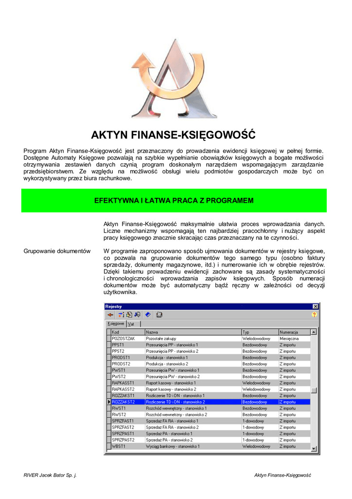AKTYN FINANSE-KSIĘGOWOŚĆ Program Aktyn Finanse-Księgowość jest przeznaczony do prowadzenia ewidencji księgowej w pełnej formie. Dostępne Automaty Księgowe pozwalają na szybkie wypełnianie obowiązków księgowych a bogate możliwości otrzymywania zestawień danych czynią program doskonałym narzędziem wspomagającym zarządzanie przedsiębiorstwem. Ze względu na możliwość obsługi wielu podmiotów gospodarczych może być on wykorzystywany przez biura rachunkowe. EFEKTYWNA I ŁATWA PRACA Z PROGRAMEM Aktyn Finanse-Księgowość maksymalnie ułatwia proces wprowadzania danych. Liczne mechanizmy wspomagają ten najbardziej pracochłonny i nużący aspekt pracy księgowego znacznie skracając czas przeznaczany na te czynności. Grupowanie dokumentów RIVER Jacek Bator Sp. j. W programie zaproponowano sposób ujmowania dokumentów w rejestry księgowe, co pozwala na grupowanie dokumentów tego samego typu (osobno faktury sprzedaży, dokumenty magazynowe, itd.) i numerowanie ich w obrębie rejestrów. Dzięki takiemu prowadzeniu ewidencji zachowane są zasady systematyczności i chronologiczności wprowadzania zapisów księgowych. Sposób numeracji dokumentów może być automatyczny bądź ręczny w zależności od decyzji użytkownika. Aktyn Finanse-Księgowość Klasyczny sposób wprowadzanie dokumentów Dokument do systemu możemy wprowadzić ręcznie podając konto i wpisując kwotę po stronie WN lub MA tego konta oraz opis księgowanej pozycji. Do dyspozycji mamy słownik z listą kont, za pomocą którego w łatwy sposób możemy odnaleźć właściwe konto. Konta możemy szukać po jego symbolu lub nazwie. Jeżeli konto związane jest z kontrahentem to wówczas możemy również przeszukiwać bazę kont po różnych danych opisujących kontrahenta np. po numerze NIP. Program wspomaga także wpisywanie opisów dekretów. Użytkownik może skorzystać ze słownika opisów wprowadzonych wcześniej do systemu, co znacznie przyspiesza pracę. Istnieje również możliwość automatycznego przepisywania opisu do następnego dekretu. Konta korespondujące Innym udogodnieniem w procesie wprowadzania dokumentów jest opcja Konta korespondujące, której zadaniem jest automatyczne tworzenie zapisów na kontach, które pozostają w stosunku do siebie w określonych relacjach. Program dysponuje mechanizmami minimalizującymi liczbę wykonywanych operacji takich jak kopiowanie pozycji dokumentu czy też bilansowanie dokumentu. Nie ma również konieczności ponownego wprowadzania informacji – program wykorzystuje odpowiednie informacje z zapisu księgowego (np. daty, numery, dane kontrahenta) do tworzenia faktury lub rozrachunku. System kontroluje poprawność wprowadzanych danych. Dokument rejestrowany do ksiąg rachunkowych musi być zbilansowany. Sprawdzana jest również zgodność zapisu na koncie z kwotą rozrachunku oraz kwotami na fakturze. Wzorce księgowań Alternatywnym sposobem pracy z programem jest wykorzystanie mechanizmów, które automatycznie rozksięgują dokument na podstawie zdefiniowanych wcześniej wzorców. Do dyspozycji mamy opcję Wzorce księgowań oraz opcję Wzorce dokumentów. Wzorce księgowań wykorzystują informacje wprowadzone do tabelki faktury do automatycznego rozksięgowania na kontach. Opcję możemy wykorzystać do wprowadzania danych na podstawie faktur VAT. Może więc służyć do rejestrowania operacji zakupu towarów, zakupów kosztowych oraz transakcji sprzedaży. Program na podstawie odpowiednich wzorców oraz operując na kwotach netto, brutto, VAT tworzy gotowy dekret księgowy, który można jeszcze modyfikować lub rozszerzać o kolejne zapisy. Wzorce dokumentów Opcja Wzorce dokumentów służy do wprowadzania pozostałych typów operacji gospodarczych. Za jej pomocą zautomatyzować można proces wprowadzania danych dotyczących m.in.: list płac, not amortyzacyjnych. Współpraca z programami z pakietu Aktyn Program współpracuje z innymi programami z pakietu Aktyn. Możliwy jest import dokumentów wystawianych w systemie sprzedaży Aktyn Pro, automatyczne rozksięgowanie listy płac tworzonej w programie Aktyn Płace-Kadry Pro oraz noty amortyzacyjnej generowanej przez program Aktyn Środki Trwałe. RIVER Jacek Bator Sp. j. Aktyn Finanse-Księgowość Status dokumentu Dokumenty wprowadzone do systemu mogą mieć różny status. Po pierwsze dokument może znajdować się w Notatniku. Wówczas taki dokument może być niezbilansowany. Traktuje się go jako wstępnie wprowadzony, przeznaczony do dalszej obróbki. Taki dokument nie jest ujmowany na wydrukach ksiąg rachunkowych. Po drugie dokument może być zarejestrowany. Wymagane jest zbilansowanie takiego dokumentu. Dokument zarejestrowany dostępny jest do dalszej edycji. Widoczny jest jednak na wydrukach ksiąg rachunkowych. Wreszcie dokument może mieć status dokumentu zaksięgowanego. Dalsza modyfikacja takiego dokumentu jest już niemożliwa. Praca z dokumentami Program posiada szerokie możliwości w zakresie pracy z dokumentami. Możliwe jest globalne rejestrowanie i księgowanie wybranych dokumentów, przenoszenie dokumentów pomiędzy rejestrami oraz okresami sprawozdawczymi. Liczne mechanizmy filtrujące dane pozwalają na szybkie odnalezienie poszukiwanego dokumentu. Zapewniony jest ślad rewizyjny pozwalający na zidentyfikowanie użytkownika, który wprowadził dany dokument, a także dotarcie do określonego dokumentu z różnych modułów programu np. z poziomu rozrachunku czy też faktury. W prosty sposób można zorientować się czy dany dokument został wprowadzony ręcznie bezpośrednio do systemu finansowo-księgowego czy też został zaimportowany z innych modułów. WSPARCIE W ZAKRESIE ZARZĄDZANIA ROZRACHUNKAMI Kontrola stanu rozrachunków Program posiada szerokie możliwości w zakresie zarządzania rozrachunkami. Zapewnia pełną kontrolę stanu należności i zobowiązań. W programie zapamiętywana jest pełna historia płatności za poszcze