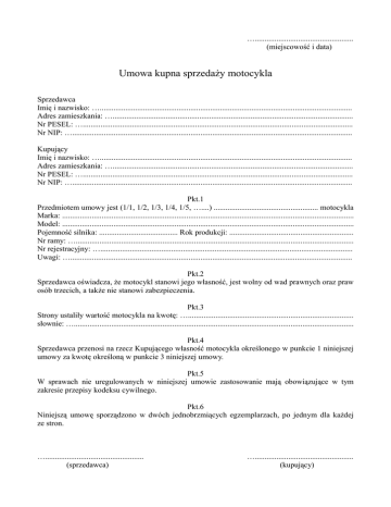 ….................................................. (miejscowość i data) Umowa kupna sprzedaży motocykla Sprzedawca Imię i nazwisko: …................................................................................................................................ Adres zamieszkania: ….......................................................................................................................... Nr PESEL: …......................................................................................................................................... Nr NIP: ….............................................................................................................................................. Kupujący Imię i nazwisko: …................................................................................................................................ Adres zamieszkania: ….......................................................................................................................... Nr PESEL: …......................................................................................................................................... Nr NIP: ….............................................................................................................................................. Pkt.1 Przedmiotem umowy jest (1/1, 1/2, 1/3, 1/4, 1/5, …....) ..................................................... motocykla Marka: .................................................................................................................................................... Model: .................................................................................................................................................... Pojemność silnika: ........................................ Rok produkcji: ............................................................... Nr ramy: …............................................................................................................................................. Nr rejestracyjny: …................................................................................................................................ Uwagi: …............................................................................................................................................... Pkt.2 Sprzedawca oświadcza, że motocykl stanowi jego własność, jest wolny od wad prawnych oraz praw osób trzecich, a także nie stanowi zabezpieczenia. Pkt.3 Strony ustaliły wartość motocykla na kwotę: ….................................................................................... słownie: ….............................................................................................................................................. Pkt.4 Sprzedawca przenosi na rzecz Kupującego własność motocykla określonego w punkcie 1 niniejszej umowy za kwotę określoną w punkcie 3 niniejszej umowy. Pkt.5 W sprawach nie uregulowanych w niniejszej umowie zastosowanie mają obowiązujące w tym zakresie przepisy kodeksu cywilnego. Pkt.6 Niniejszą umowę sporządzono w dwóch jednobrzmiących egzemplarzach, po jednym dla każdej ze stron. ….................................................. (sprzedawca) ….................................................. (kupujący)