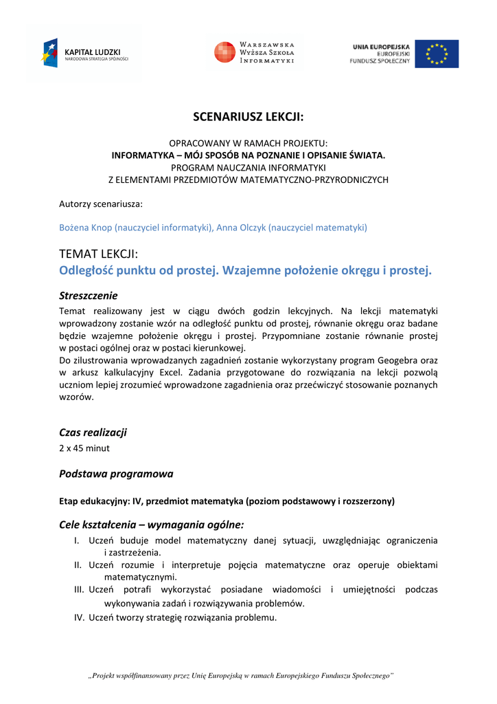 SCENARIUSZ LEKCJI: OPRACOWANY W RAMACH PROJEKTU: INFORMATYKA – MÓJ SPOSÓB NA POZNANIE I OPISANIE ŚWIATA. PROGRAM NAUCZANIA INFORMATYKI Z ELEMENTAMI PRZEDMIOTÓW MATEMATYCZNO-PRZYRODNICZYCH Autorzy scenariusza: Bożena Knop (nauczyciel informatyki), Anna Olczyk (nauczyciel matematyki) TEMAT LEKCJI: Odległość punktu od prostej. Wzajemne położenie okręgu i prostej. Streszczenie Temat realizowany jest w ciągu dwóch godzin lekcyjnych. Na lekcji matematyki wprowadzony zostanie wzór na odległość punktu od prostej, równanie okręgu oraz badane będzie wzajemne położenie okręgu i prostej. Przypomniane zostanie równanie prostej w postaci ogólnej oraz w postaci kierunkowej. Do zilustrowania wprowadzanych zagadnień zostanie wykorzystany program Geogebra oraz w arkusz kalkulacyjny Excel. Zadania przygotowane do rozwiązania na lekcji pozwolą uczniom lepiej zrozumieć wprowadzone zagadnienia oraz przećwiczyć stosowanie poznanych wzorów. Czas realizacji 2 x 45 minut Podstawa programowa Etap edukacyjny: IV, przedmiot matematyka (poziom podstawowy i rozszerzony) Cele kształcenia – wymagania ogólne: I. Uczeń buduje model matematyczny danej sytuacji, uwzględniając ograniczenia i zastrzeżenia. II. Uczeń rozumie i interpretuje pojęcia matematyczne oraz operuje obiektami matematycznymi. III. Uczeń potrafi wykorzystać posiadane wiadomości i umiejętności podczas wykonywania zadań i rozwiązywania problemów. IV. Uczeń tworzy strategię rozwiązania problemu. „Projekt współfinansowany przez Unię Europejską w ramach Europejskiego Funduszu Społecznego” Treści nauczania – wymagania szczegółowe: Uczeń: - wyznacza równanie prostej w postaci ogólnej i kierunkowej - oblicza odległość punktu od prostej; - posługuje się równaniem okręgu (x – a)² + (y – b)² = r² ; - bada wzajemne położenie okręgu i prostej - wyznacza punkty wspólne prostej i okręgu; Podstawa programowa Etap edukacyjny: IV, przedmiot: informatyka (poziom podstawowy ) Cele kształcenia – wymagania ogólne: I. Wyszukiwanie, gromadzenie i przetwarzanie informacji z różnych źródeł; opracowywanie za pomocą komputera: rysunków, tekstów, danych liczbowych, motywów, animacji, prezentacji multimedialnych. II. Rozwiązywanie problemów i podejmowanie decyzji z wykorzystaniem komputera, z zastosowaniem podejścia algorytmicznego. III. Wykorzystanie komputera oraz programów i gier edukacyjnych do poszerzania wiedzy i umiejętności z różnych dziedzin oraz do rozwijania zainteresowań. Treści nauczania – wymagania szczegółowe: Uczeń: • gromadzi w tabeli arkusza kalkulacyjnego dane pochodzące np. z Internetu, • stosuje zaawansowane formatowanie tabeli arkusza; • dobiera odpowiednie wykresy do zaprezentowania danych; • wykorzystuje oprogramowanie dydaktyczne i technologie informacyjnokomunikacyjne w pracy twórczej i przy rozwiązywaniu zadań Cel Wprowadzenie równania okręgu, wzoru na odległość punktu od prostej, zbadanie wzajemnego położenia okręgu i prostej. Wykorzystanie narzędzi informatycznych (Geogebra, arkusz kalkulacyjny) w rozwiązywaniu zadań z matematyki. Słowa kluczowe równanie prostej w postaci ogólnej oraz kierunkowej, równanie okręgu, odległość punktu od prostej, wzajemne położenie okręgu i prostej, styczna do okręgu, sieczna, rozłączna Materiały potrzebne do przeprowadzenia lekcji: - prezentacje stanowiące obudowę scenariusza - pliki Geogebry „Projekt współfinansowany przez Unię Europejską w ramach Europejskiego Funduszu Społecznego” - arkusz kalkulacyjny - zadania do rozwiązania na lekcji - zadania domowe sprawdzające poziom opanowania materiału Przebieg zajęć: Lekcja nr 1 – matematyka: 1. Wprowadzenie (10 minut) Prezentacja mająca na celu przypomnienie równania prostej w postaci ogólnej i kierunkowej. Wprowadzenie wzoru na odległość punktu od prostej. 2. 3. Interpretacja nowych zagadnień (20 minut) Plik Geogebry (Odleglosc_punktu_od_prostej),który pomoże uczniom zinterpretować problem odległości punktu od prostej. Arkusz kalkulacyjny Okrag_i_prosta (arkusz: Odległość punktu od prostej). Zadanie 1 -wykorzystanie wprowadzonego wzoru na odległość punktu od prostej(wykorzystanie arkusza kalkulacyjnego). Plik Geogebry (Okrąg), który przedstawia okrąg o środku S i promieniu r. Wprowadzenie równania okręgu. Zadanie 2 oraz scan rozwiązania jednego z podpunktów tego zadania jako ćwiczenie służące wykształceniu umiejętności wyznaczania środka i promienia okręgu. Pliki Geogebry (Prosta_i_okrag1; Prosta_i_okrag2; Prosta_i_okrag3 ), obrazujące możliwe położenia okręgu i prostej. Arkusz kalkulacyjny Okrag_i_prosta (arkusz: Okrąg i prosta). Dyskusja podsumowująca (15 min) Podsumowanie wiadomości – pokazanie trzech możliwych położeń okręgu i prostej oraz zapisanie odpowiednich warunków. Lekcja nr 2 – matematyka 1. Zadanie 3 do samodzielnego rozwiązania (15min) Zadanie polegające na zbadaniu wzajemnego położenia okręgu i prostej poprzez porównanie odległości d ( odległości środka okręgu od prostej) oraz promienia okręgu r (wykorzystanie arkusza kalkulacyjnego Okrąg i prosta.xls-zadania). 2. Przedstawienie i omówienie rozwiązania zadania 3 (15 min) 3. Podsumowanie lekcji i wystawienie ocen dla najbardziej aktywnych uczniów .(10 min) Podczas podsumowania lekcji nauczyciel nagradza najbardziej aktywnych uczniów oceną bardzo dobrą. „Projekt współfinansowany przez Unię Europejską w ramach Europejskiego Funduszu Społecznego” 4. Zadanie pracy domowej (5) Zadania do domu. 5. Ocenianie Ocena za aktywność w lekcji. Ocena za pracę domową. Dostępne pliki - prezentacja: Okrąg i prosta.ppt pliki Geogebry: Odleglosc_punktu_od_prostej; Okrąg; Prosta_i_okrag1; Prosta_i_okrag2; Prosta_i_okrag3; Wzajemne_polozenie_punktu_i_prostej arkusz kalkulacyjny: Okrąg_i_prosta.xls zadania do rozwiązania „Projekt współfinansowany przez Unię Europejską w 