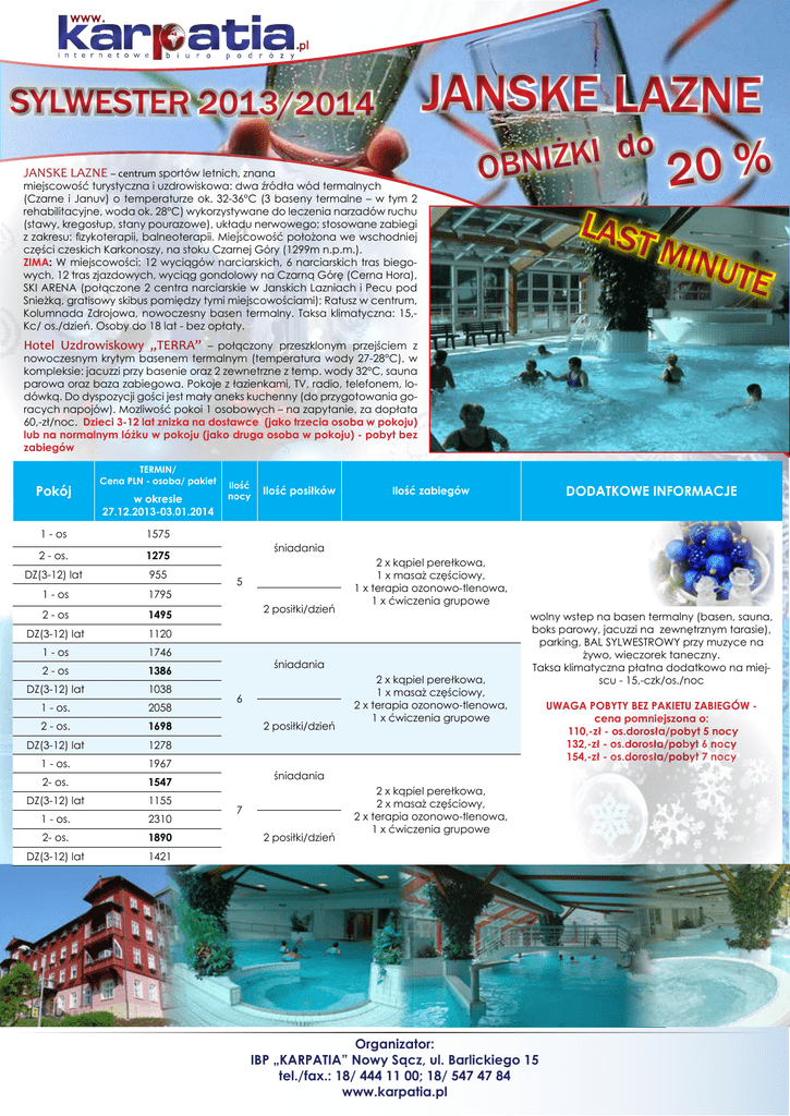 JANSKE LAZNE SYLWESTER 2013/2014 JANSKE LAZNE – centrum sportów letnich, znana miejscowość turystyczna i uzdrowiskowa: dwa źródła wód termalnych (Czarne i Januv) o temperaturze ok. 32-36°C (3 baseny termalne – w tym 2 rehabilitacyjne, woda ok. 28°C) wykorzystywane do leczenia narzadów ruchu (stawy, kregosłup, stany pourazowe), układu nerwowego; stosowane zabiegi z zakresu: fizykoterapii, balneoterapii. Miejscowość położona we wschodniej części czeskich Karkonoszy, na stoku Czarnej Góry (1299m n.p.m.). ZIMA: W miejscowości: 12 wyciągów narciarskich, 6 narciarskich tras biegowych, 12 tras zjazdowych, wyciąg gondolowy na Czarną Górę (Cerna Hora), SKI ARENA (połączone 2 centra narciarskie w Janskich Lazniach i Pecu pod Snieżką, gratisowy skibus pomiędzy tymi miejscowościami); Ratusz w centrum, Kolumnada Zdrojowa, nowoczesny basen termalny. Taksa klimatyczna: 15,Kc/ os./dzień. Osoby do 18 lat - bez opłaty. do I K Ż I N OB LAS 20 % T MI NUT E Hotel Uzdrowiskowy „TERRA” – połączony przeszklonym przejściem z nowoczesnym krytym basenem termalnym (temperatura wody 27-28°C), w kompleksie: jacuzzi przy basenie oraz 2 zewnetrzne z temp. wody 32°C, sauna parowa oraz baza zabiegowa. Pokoje z łazienkami, TV, radio, telefonem, lodówką. Do dyspozycji gości jest mały aneks kuchenny (do przygotowania goracych napojów). Mozliwość pokoi 1 osobowych – na zapytanie, za dopłata 60,-zł/noc. Dzieci 3-12 lat znizka na dostawce (jako trzecia osoba w pokoju) lub na normalnym lóżku w pokoju (jako druga osoba w pokoju) - pobyt bez zabiegów Pokój TERMIN/ Cena PLN - osoba/ pakiet w okresie 27.12.2013-03.01.2014 1 - os 1575 2 - os. 1275 DZ(3-12) lat 955 1 - os 1795 2 - os 1495 DZ(3-12) lat 1120 1 - os 1746 2 - os 1386 DZ(3-12) lat 1038 1 - os. 2058 2 - os. 1698 DZ(3-12) lat 1278 1 - os. 1967 2- os. 1547 DZ(3-12) lat 1155 1 - os. 2310 2- os. 1890 DZ(3-12) lat 1421 Ilość nocy Ilość posiłków DODATKOWE INFORMACJE Ilość zabiegów śniadania 5 2 posiłki/dzień 2 x kąpiel perełkowa, 1 x masaż częściowy, 1 x terapia ozonowo-tlenowa, 1 x ćwiczenia grupowe śniadania 6 2 posiłki/dzień 2 x kąpiel perełkowa, 1 x masaż częściowy, 2 x terapia ozonowo-tlenowa, 1 x ćwiczenia grupowe wolny wstep na basen termalny (basen, sauna, boks parowy, jacuzzi na zewnętrznym tarasie), parking, BAL SYLWESTROWY przy muzyce na żywo, wieczorek taneczny. Taksa klimatyczna płatna dodatkowo na miejscu - 15,-czk/os./noc śniadania 7 2 posiłki/dzień 2 x kąpiel perełkowa, 2 x masaż częściowy, 2 x terapia ozonowo-tlenowa, 1 x ćwiczenia grupowe Organizator: IBP „KARPATIA” Nowy Sącz, ul. Barlickiego 15 tel./fax.: 18/ 444 11 00; 18/ 547 47 84 www.karpatia.pl UWAGA POBYTY BEZ PAKIETU ZABIEGÓW cena pomniejszona o: 110,-zł - os.dorosła/pobyt 5 nocy 132,-zł - os.dorosła/pobyt 6 nocy 154,-zł - os.dorosła/pobyt 7 nocy