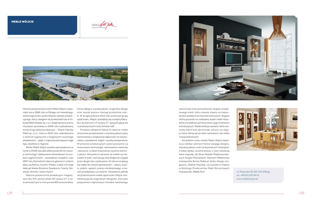 MEBLE WÓJCIK 84 Historia producentów marki Meble Wójcik rozpo- którzy dbają o wysoką jakość, oryginalny design wzornictwa oraz pomysłowości zespołu projek- częła się w 1986 roku w Elblągu od niewielkiego, oraz wysoki poziom obsługi produktów mar- towego marki, który zawsze stawia na indywi- założonego przez Leszka Wójcika zakładu produk- ki. W drugiej połowie 2014 roku potencjał grupy dualne podejście do klientów końcowych. Bogata cyjnego, który z biegiem lat przekształcił się w Fa- spod znaku „Wójcik” powiększy się o kolejną fabry- oferta pozwala na swobodny wybór mebli nieza- brykę Mebli Stolpłyt sp. z o.o. Dzięki dynamicznemu kę o powierzchni 17 tysięcy m², specjalizującą się leżnie od wielkości pomieszczenia i jego możliwości rozwojowi sprzedaży w 2006 roku wybudowany w produkcji kuchni oraz frontów mdf. aranżacyjnych. Każda kolekcja zawiera różne wa- został drugi zakład produkcyjny — Wójcik Fabryka Produkty elbląskich fabryk to obecnie meble rianty takich brył, jak komody, witryny czy rega- Mebli sp. z o.o., który w 2012 roku rozbudowano skrzyniowe produkowane z wysokiej jakości płyty ły, które różnią się nie tylko rozmiarami, lecz także o centrum logistyczne z magazynem wysokiego laminowanej o zwiększonej odporności na zaryso- funkcjonalnościami. składowania — jeden z najnowocześniejszych tego wania, uszkodzenia, wilgoć i wysoką temperaturę. Na polskim rynku marka Meble Wójcik zdoła- typu obiektów w regionie. W procesie produkcyjnym wykorzystywane są ła już zdobyć wiernych fanów swojego designu, Marka Meble Wójcik została wprowadzona na nowoczesne technologie, atestowane materiały wysokiej jakości oraz funkcjonalnych rozwiązań, rynek w 2008 roku jako efekt ponad 22 lat rozwo- i akcesoria, a także nowoczesne systemy kontro- a także zdobyć uznanie branży, o czym świadczą ju technologii i zdobywania doświadczeń na ryn- li jakości. Wszystko to sprawia, że meble są nie- takie nagrody. jak Złote Medale Międzynarodo- kach zagranicznych — początkowo rosyjskim, a po zwykle trwałe i zachowują swój elegancki wygląd wych Targów Poznańskich, Diament Meblarstwa 1997 roku Zachodnich (obecnie głównymi rynkami przez długie lata użytkowania. W ofercie znajdują miesięcznika Biznes Meble.pl, Dobry Design ma- zbytu są Niemcy, Austria i Polska, a obok nich kraje się meble do różnych pomieszczeń — salonu, kuch- gazynu „Dobrze Mieszkaj” czy wysokie 2 miejsce takie jak Wielka Brytania, Szwajcaria, Czechy, Sło- ni, jadalni, sypialni, pokoju młodzieżowego, a na- w Rankingu Producentów Mebli Skrzyniowych wacja, Ukraina i wiele innych). wet przedpokoju czy łazienki. Niezależnie jednak miesięcznika „Meble Plus”. ul. Mazurska 45, 82-300 Elbląg Obecnie powierzchnia produkcyjno-magazy- od przeznaczenia meble spod znaku Wójcik cha- tel. +48 55 235 94 01 owa obu firm wynosi blisko 60 tysięcy m², a za- rakteryzują się oryginalnym designem, który jest www.meblewojcik.pl trudnionych jest w nich ponad 800 pracowników, połączeniem najnowszych trendów światowego 85