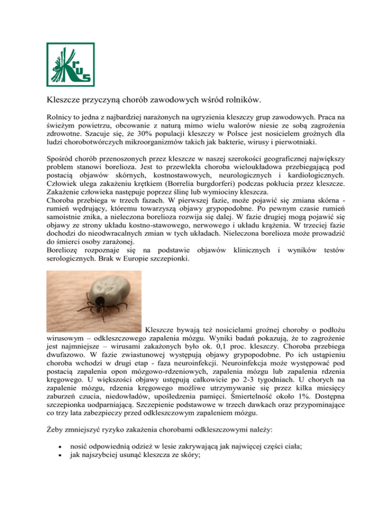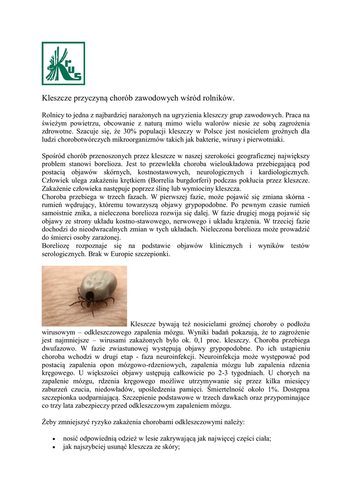 Kleszcze przyczyną chorób zawodowych wśród rolników. Rolnicy to jedna z najbardziej narażonych na ugryzienia kleszczy grup zawodowych. Praca na świeżym powietrzu, obcowanie z naturą mimo wielu walorów niesie ze sobą zagrożenia zdrowotne. Szacuje się, że 30% populacji kleszczy w Polsce jest nosicielem groźnych dla ludzi chorobotwórczych mikroorganizmów takich jak bakterie, wirusy i pierwotniaki. Spośród chorób przenoszonych przez kleszcze w naszej szerokości geograficznej największy problem stanowi borelioza. Jest to przewlekła choroba wieloukładowa przebiegającą pod postacią objawów skórnych, kostnostawowych, neurologicznych i kardiologicznych. Człowiek ulega zakażeniu krętkiem (Borrelia burgdorferi) podczas pokłucia przez kleszcze. Zakażenie człowieka następuje poprzez ślinę lub wymiociny kleszcza. Choroba przebiega w trzech fazach. W pierwszej fazie, może pojawić się zmiana skórna rumień wędrujący, któremu towarzyszą objawy grypopodobne. Po pewnym czasie rumień samoistnie znika, a nieleczona borelioza rozwija się dalej. W fazie drugiej mogą pojawić się objawy ze strony układu kostno-stawowego, nerwowego i układu krążenia. W trzeciej fazie dochodzi do nieodwracalnych zmian w tych układach. Nieleczona borelioza może prowadzić do śmierci osoby zarażonej. Boreliozę rozpoznaje się na podstawie objawów klinicznych i wyników testów serologicznych. Brak w Europie szczepionki. Kleszcze bywają też nosicielami groźnej choroby o podłożu wirusowym – odkleszczowego zapalenia mózgu. Wyniki badań pokazują, że to zagrożenie jest najmniejsze – wirusami zakażonych było ok. 0,1 proc. kleszczy. Choroba przebiega dwufazowo. W fazie zwiastunowej występują objawy grypopodobne. Po ich ustąpieniu choroba wchodzi w drugi etap - faza neuroinfekcji. Neuroinfekcja może występować pod postacią zapalenia opon mózgowo-rdzeniowych, zapalenia mózgu lub zapalenia rdzenia kręgowego. U większości objawy ustępują całkowicie po 2-3 tygodniach. U chorych na zapalenie mózgu, rdzenia kręgowego możliwe utrzymywanie się przez kilka miesięcy zaburzeń czucia, niedowładów, upośledzenia pamięci. Śmiertelność około 1%. Dostępna szczepionka uodparniającą. Szczepienie podstawowe w trzech dawkach oraz przypominające co trzy lata zabezpieczy przed odkleszczowym zapaleniem mózgu. Żeby zmniejszyć ryzyko zakażenia chorobami odkleszczowymi należy: nosić odpowiednią odzież w lesie zakrywającą jak najwięcej części ciała; jak najszybciej usunąć kleszcza ze skóry; stosować środki odstraszające kleszcze; gotować mleko pochodzące od krów, kóz i owiec; unikać pobytu w rejonach zakażonych kleszczy; po wizycie w lesie dokładnie obejrzeć całe ciało. Jeżeli zauważysz ukąszenie, natychmiast delikatnie usuń kleszcza - uchwyć pęsetą za główkę i pociągnij. Miejsce ukłucia zdezynfekuj. Rolnicy dbając o stan gospodarstwa rolnego, wykonując zabiegi takie jak wycinanie krzaków i zarośli, koszenie trawy na skraju lasu, usuwanie chwastów rosnących wokół ogrodzeń i zabudowań mieszkalnych ograniczają liczbę kleszczy. Co zrobić w sytuacji gdy lekarz stwierdzi chorobę odkleszczową u rolnika, która jest wynikiem pracy w gospodarstwie rolnym? Rolnik ubezpieczony w KRUS na podstawie - decyzji o stwierdzeniu choroby zawodowej wydanej przez Państwową Inspekcję Sanitarną składa wniosek o jednorazowe odszkodowanie z tytułu stałego lub długotrwałego uszczerbku na zdrowiu spowodowanego wypadkiem przy pracy rolniczej lub rolniczą chorobą zawodową. Może także złożyć wniosek o rentę z tytułu niezdolności do pracy. Na podstawie "Zagrożenia czynnikami biologicznymi w rolnictwie - dotychczasowe i nowe problemy" pod redakcją Nimfy Stojek i Leszka Soleckiego. Instytut Medycyny Wsi, Lublin 2011r. „W czasie wakacji uważaj na kleszcze” – wypowiedź prof. Krzysztofa Solarza (02.07.2013) PT KRUS Piaseczno Inspektor ds. prewencji mgr Katarzyna Gaca