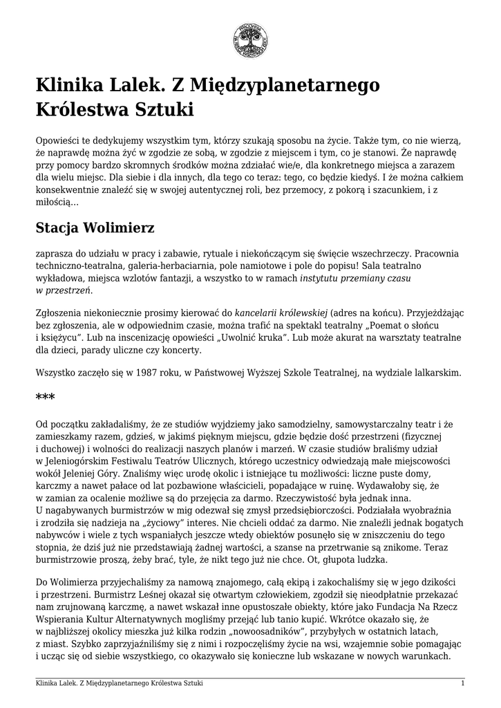 Klinika Lalek. Z Międzyplanetarnego Królestwa Sztuki Opowieści te dedykujemy wszystkim tym, którzy szukają sposobu na życie. Także tym, co nie wierzą, że naprawdę można żyć w zgodzie ze sobą, w zgodzie z miejscem i tym, co je stanowi. Że naprawdę przy pomocy bardzo skromnych środków można zdziałać wie/e, dla konkretnego miejsca a zarazem dla wielu miejsc. Dla siebie i dla innych, dla tego co teraz: tego, co będzie kiedyś. I że można całkiem konsekwentnie znaleźć się w swojej autentycznej roli, bez przemocy, z pokorą i szacunkiem, i z miłością… Stacja Wolimierz zaprasza do udziału w pracy i zabawie, rytuale i niekończącym się święcie wszechrzeczy. Pracownia techniczno-teatralna, galeria-herbaciarnia, pole namiotowe i pole do popisu! Sala teatralno wykładowa, miejsca wzlotów fantazji, a wszystko to w ramach instytutu przemiany czasu w przestrzeń. Zgłoszenia niekoniecznie prosimy kierować do kancelarii królewskiej (adres na końcu). Przyjeżdżając bez zgłoszenia, ale w odpowiednim czasie, można trafić na spektakl teatralny „Poemat o słońcu i księżycu”. Lub na inscenizację opowieści „Uwolnić kruka”. Lub może akurat na warsztaty teatralne dla dzieci, parady uliczne czy koncerty. Wszystko zaczęło się w 1987 roku, w Państwowej Wyższej Szkole Teatralnej, na wydziale lalkarskim. *** Od początku zakładaliśmy, że ze studiów wyjdziemy jako samodzielny, samowystarczalny teatr i że zamieszkamy razem, gdzieś, w jakimś pięknym miejscu, gdzie będzie dość przestrzeni (fizycznej i duchowej) i wolności do realizacji naszych planów i marzeń. W czasie studiów braliśmy udział w Jeleniogórskim Festiwalu Teatrów Ulicznych, którego uczestnicy odwiedzają małe miejscowości wokół Jeleniej Góry. Znaliśmy więc urodę okolic i istniejące tu możliwości: liczne puste domy, karczmy a nawet pałace od lat pozbawione właścicieli, popadające w ruinę. Wydawałoby się, że w zamian za ocalenie możliwe są do przejęcia za darmo. Rzeczywistość była jednak inna. U nagabywanych burmistrzów w mig odezwał się zmysł przedsiębiorczości. Podziałała wyobraźnia i zrodziła się nadzieja na „życiowy” interes. Nie chcieli oddać za darmo. Nie znaleźli jednak bogatych nabywców i wiele z tych wspaniałych jeszcze wtedy obiektów posunęło się w zniszczeniu do tego stopnia, że dziś już nie przedstawiają żadnej wartości, a szanse na przetrwanie są znikome. Teraz burmistrzowie proszą, żeby brać, tyle, że nikt tego już nie chce. Ot, głupota ludzka. Do Wolimierza przyjechaliśmy za namową znajomego, całą ekipą i zakochaliśmy się w jego dzikości i przestrzeni. Burmistrz Leśnej okazał się otwartym człowiekiem, zgodził się nieodpłatnie przekazać nam zrujnowaną karczmę, a nawet wskazał inne opustoszałe obiekty, które jako Fundacja Na Rzecz Wspierania Kultur Alternatywnych mogliśmy przejąć lub tanio kupić. Wkrótce okazało się, że w najbliższej okolicy mieszka już kilka rodzin „nowoosadników”, przybyłych w ostatnich latach, z miast. Szybko zaprzyjaźniliśmy się z nimi i rozpoczęliśmy życie na wsi, wzajemnie sobie pomagając i ucząc się od siebie wszystkiego, co okazywało się konieczne lub wskazane w nowych warunkach. Klinika Lalek. Z Międzyplanetarnego Królestwa Sztuki 1 Zabraliśmy się za remonty prześcigaliśmy się wręcz w pomysłach i sposobach działania. I zawsze wychodziło to „ekologicznie”. Biorąc stare domy siłą rzeczy zwracaliśmy się ku tradycji, zeskrobując liczne warstwy farby olejnej z czasów komuny i odkrywając piękno i siłę naturalnego drewna, odzyskując stare cegły z okolicznych ruin, czy stosując miejscowy kamień, znaleziony na polu. Większość nowoosadników stanowili ludzie młodzi i niebogaci, z. którymi z radością realizowaliśmy podstawową zasadę ekologii głębokiej: skromne środki, bogate cele, więc odnawialiśmy starą szafę z kurnika babci sąsiada, wymienialiśmy się produktami z ogrodów, ubrankami dla dzieci, pracowaliśmy razem i uczyliśmy się od siebie, w ten sposób spełnialiśmy nasze marzenia i robimy to nadal z całą falą ludzi, która przez te 5 lat przewinęła się przez Wolimierz i okolicę, a niektórzy z nich osiedlili się na stałe. Pewnie, że chcielibyśmy więcej działać na rzecz czy to wspólnoty, czy bioregionalizmu, pielęgnowania tradycji, czy wprost dla ratowania Matki Natury. Plany mamy cudne i to całe mnóstwo, ale często walka o byt, walka z głupotą i zacofaniem, z biurokracją zabiera nam cały czas. Nie znaczy to jednak, że nie ma czasu na świętowanie. Po to tu jesteśmy, by jako teatr nieść święto w Wolimierzu, okolicy, w Polsce i na świecie. Teatr spełnia dla nas wspaniałą rolę integrującą. Czy to zawsze, czy sporadycznie, ale WSZYSCY w nim uczestniczymy. Wspólnie budujemy machiny, robimy kostiumy, podróżujemy i występujemy. Np. Księżycową Machinę na dwa cylindry Wiktor zbudował z miejscowym kowalem, panem Papciakiem, inspirując się grabiarką. Tęczowego smoka wymyśliły dzieciaki z Przecznicy, wyrzeźbił Romek, a pomalowała Papryka. O kontaktach i współżyciu z miejscową ludnością, osiadłą tu po wojnie, niełatwo opowiadać. Teraz to w większości starzy ludzie. Dziesiątki lat żyli w strachu, czy i kiedy ich znowu przesiedlą. Nigdy nie czuli się u siebie. Po estetyce i stanie technicznym domostw widać ich stosunek do „miejsca”. Tutejsi radni nas popierają, ale jest taki jeden, który najchętniej by nas młodych i ostatnio osiadłych wygonił, tak jak to zrobiono z całą dotychczasową „młodością”, która się tu po wojnie pojawiła. I ciągle czekamy na decyzję radnych; dadzą nam Stację, czy zmuszą do udziału w przetargu, a to oznacza, że będziemy mogli nabyć Stację za sumę rzędu 400 milionów starych złotych. (Stacja, to obecne centrum działalności teatralnej, warsztatowej i wszelakiej. To w