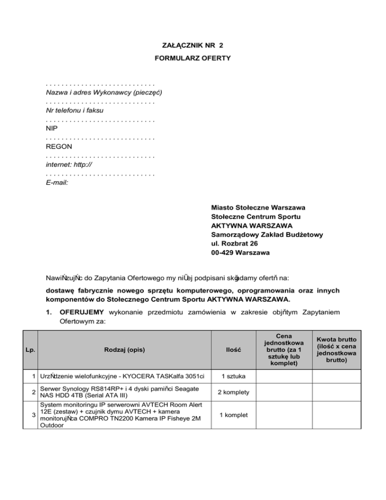 ZAŁĄCZNIK NR 2 FORMULARZ OFERTY ............................ Nazwa i adres Wykonawcy (pieczęć) ............................ Nr telefonu i faksu ............................ NIP ............................ REGON ............................ internet: http:// ............................ E-mail: Miasto Stołeczne Warszawa Stołeczne Centrum Sportu AKTYWNA WARSZAWA Samorządowy Zakład Budżetowy ul. Rozbrat 26 00-429 Warszawa Nawiązując do Zapytania Ofertowego my niżej podpisani składamy ofertę na: dostawę fabrycznie nowego sprzętu komputerowego, oprogramowania oraz innych komponentów do Stołecznego Centrum Sportu AKTYWNA WARSZAWA. 1. Lp. OFERUJEMY wykonanie przedmiotu zamówienia w zakresie objętym Zapytaniem Ofertowym za: Rodzaj (opis) Ilość 1 Urządzenie wielofunkcyjne - KYOCERA TASKalfa 3051ci 1 sztuka Serwer Synology RS814RP+ i 4 dyski pamięci Seagate NAS HDD 4TB (Serial ATA III) 2 komplety 2 System monitoringu IP serwerowni AVTECH Room Alert 12E (zestaw) + czujnik dymu AVTECH + kamera 3 monitorująca COMPRO TN2200 Kamera IP Fisheye 2M Outdoor 1 komplet Cena jednostkowa brutto (za 1 sztukę lub komplet) Kwota brutto (ilość x cena jednostkowa brutto) Stacja graficzna [procesor Intel® Core™ i7-4790K (8M Cache, up to 4.40 GHz), 4 rdzenie (8 wątków HT), ilość pamięci operacyjnej - 16GB, rodzaj pamięci DDR3-1600 (PC3-12800), dysk twardy SSD 120 GB oraz magnetyczny 2000GB, Serial ATA/600, z napędem optycznym DVD +/RW, zintegrowana karta dźwiękowa 7.1 HD Realtek, karta graficzna NVIDIA Quadro K2200 o pamięci 4000MB, złącza karty graficznej: 1 x DVI-I (Dual Link), 2 x Display 4 Port, 2 x USB 3.0, system operacyjny Windows 7 Professional 64bit]* + monitor Dell P2415Q + Microsoft Office 2013 Dla Użytkowników Domowych i Małych Firm PL + Adobe Photoshop&Premiere Elements 13 PL WIN BOX + WebSite X5 Evolution 11 PL BOX + Pinnacle Studio 19 Plus PL Box 1 komplet Urządzenie wielofunkcyjne - HP Color LaserJet Pro 500 M570dw MFP + rozszerzenie gwarancji do 3 lat 5 sztuki 5 *wskazane w stacji graficznej parametry są parametrami minimalnymi, Zamawiający dopuszcza możliwość zaoferowania urządzenia o wyższych parametrach, z zastrzeżeniem, że system operacyjny musi pozostać bez zmian. łączną cenę brutto …………………………………… …………………………………….zł (słownie: ………………………………………………………………….….. złotych), w tym ……%VAT. 1. OŚWIADCZAMY, że cena oferty (z podatkiem VAT) podana w ust. 1 zawiera wszystkie koszty wykonania zamówienia, jakie ponosi Zamawiający. 2. OŚWIADCZAMY, że zobowiązujemy się do wykonania przedmiotu zamówienia zgodnie z Opisem przedmiotu zamówienia, stanowiącym Załącznik nr 1 do Zapytania Ofertowego. 3. OŚWIADCZAMY, że zapoznaliśmy się z Zapytaniem Ofertowym i uznajemy się za związanych określonymi w nim postanowieniami i zasadami postępowania. 4. OŚWIADCZAMY, że akceptujemy warunek, iż w przypadku zamknięcia postępowania nie przysługują nam żadne roszczenia w stosunku do Zamawiającego. 5. UWAŻAMY się za związanych niniejszą ofertą na czas wskazany w Zapytaniu Ofertowym, czyli przez okres 30 dni od upływu terminu składania ofert. 6. OŚWIADCZAMY, że zapoznaliśmy się z Istotnymi postanowieniami umowy, które stanowią Załącznik nr 3 do Zapytania Ofertowego i zobowiązujemy się, w przypadku wyboru naszej oferty, do zawarcia umowy na określonych w tym załączniku warunkach, w miejscu i terminie wyznaczonym przez Zamawiającego. 7. Wszelką korespondencję w sprawie niniejszego postępowania należy kierować na nasz adres: ……………………………………………………………………………………………… nr tel.: ……………………………………. , faks.: ……………………………………… 8. OFERTĘ niniejszą składamy na ………….… kolejno ponumerowanych kartkach. 9. ZAŁĄCZNIKAMI do niniejszej oferty, stanowiącymi jej integralną część, są: 1. ……………………………………………………………………………………...…… 2. …………………………………………………………………………………………... ………………………………….. , dn. ....................... …………………………… podpis Wykonawcy lub upełnomocnionego przedstawiciela (przedstawicieli) Wykonawcy