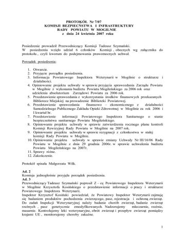 PROTOKÓŁ Nr 7/07 KOMISJI BEZPIECŃSTWA I INFRASTRUKTURY RADY POWIATU W MOGILNIE z dnia 24 kwietnia 2007 roku Posiedzenie prowadził Przewodniczący Komisji Tadeusz Szymański. W posiedzeniu wzięło udział 6 członków Komisji , obecnych wg załącznika do protokołu , czyli kworum do podejmowania prawomocnych uchwał. Porządek posiedzenia; 1. Otwarcie. 2. Przyjęcie porządku posiedzenia. 3. Informacja Powiatowego Inspektora Weterynarii w Mogilnie o strukturze i działalności. 4. Opiniowanie projektu uchwały w sprawie przyjęcia sprawozdania Zarządu Powiatu w Mogilnie z wykonania budżetu Powiatu Mogileńskiego za 2006 rok oraz udzielenia absolutorium Zarządowi Powiatu za 2006 rok. 5. Przedstawienie sprawozdania z wykorzystania środków finansowych przekazanych Bibliotece Miejskiej na prowadzenie Biblioteki Powiatowej. 6. Przedstawienie sprawozdania finansowo – ekonomicznego z działalności Samodzielnego Publicznego Zakładu Opieki Zdrowotnej w Mogilnie za rok 2006 i I kwartał br. 7. Przedstawienie informacji Powiatowego Inspektora Sanitarnego o stanie bezpieczeństwa sanitarnego Powiatu Mogileńskiego. 8. Opiniowanie projektu uchwały w sprawie zatwierdzenia rocznego planu kontroli Komisji Rewizyjnej Rady Powiatu w Mogilnie na 2007 rok. 9. Opiniowanie projektu uchwały w sprawie rezygnacji z członkostwa w stałej komisji Rady Powiatu w Mogilnie. 10. Opiniowanie projektu uchwały w sprawie zmiany Uchwały Nr III/16/06 Rady Powiatu w Mogilnie z dnia 29 grudnia 2006r. w sprawie uchwalenia budżetu Powiatu Mogileńskiego na 2007r. 11. Sprawy różne. 12. Zakończenie. Protokół spisała Małgorzata Wilk. Ad. 2 Komisja jednogłośnie przyjęła porządek posiedzenia. Ad. 3 Przewodniczący Tadeusz Szymański poprosił Z – cę Powiatowego Inspektora Weterynarii w Mogilnie Krzysztofa Kosińskiego o przedstawienie informacji o pracy i strukturze Powiatowego Inspektora Weterynarii. Inspektor Krzysztof Kosiński powiedział, że Powiatowy Inspektor Weterynarii zajmuję się badaniem produktów pochodzenia zwierzęcego, pasz, rejestracja i ochroną zwierząt. Do zadań Inspekcji Weterynaryjnej należy badanie chorób zwierząt, badanie zwierząt rzeźnych , pasz genetycznie zmodyfikowanych. Nadzorujemy mleczarnie, rzeźnie, masarnie. Kontrolujemy leki weterynaryjne, obrót zwierząt i przepływ zwierząt pomiędzy krajami UE , monitorujemy choroby zakaźne. 1 Przewodniczący zapytał, na jakiej bazie to wszystko wykonujecie? Inspektor Krzysztof Kosiński pracuje 3 inspektorów , referent i 5 lekarzy weterynarii , mieścimy się nad Powiatowym Urzędem Pracy, to jest 6 biur, 2 garaże i magazyn, nie mamy sali konferencyjnej, jeśli chodzi o majątek to mamy opryskiwacz , pompy, 2 samochody, kilkuletniego Poloneza i 3- letniego Reno, natomiast sprzętu jednorazowego użytku mamy pewien zapas. Przewodniczący pytał dalej, gdzie przeprowadzacie badania ? Inspektor Krzysztof Kosiński odpowiedział, że próbki przekazujemy do Zakładu Higieny Weterynaryjnej , za te badania płaci budżet Państwa., tzn. choroby zwalczane z urzędu budżet, natomiast badania handlowe - hodowca. Ad. 4 Przewodniczący zapytał członków Komisji czy są pytania dotyczące sprawozdania Zarządu Powiatu w Mogilnie z wykonania budżetu Powiatu Mogileńskiego za 2006 rok oraz udzielenia absolutorium Zarządowi Powiatu za 2006 rok, z braku pytań następnie poddał pod głosowanie. Za głosowało 6 członków Komisji, Ad. 5 Przewodniczący zapytał, czy są pytania do przedstawionego sprawozdania z wykorzystania środków finansowych przekazanych Bibliotece Miejskiej na prowadzenie Biblioteki Powiatowej. Komisja nie wniosła uwag, następnie Przewodniczący poddał pod głosowanie sprawozdanie. Za głosowało 6 członków Komisji. Ad. 6 Przewodniczący zapytał czy są pytania do sprawozdania finansowo – ekonomicznego z działalności Samodzielnego Publicznego Zakładu Opieki Zdrowotnej w Mogilnie za rok 2006 i I kwartał br.? - z braku pytań Przewodniczący sprawozdanie poddał pod głosowanie. Za głosowało 6 członków Komisji. Ad. 7 Komisja nie wniosła uwag do informacji Powiatowego Inspektora Sanitarnego o stanie bezpieczeństwa sanitarnego Powiatu Mogileńskiego. Ad. 8 Przewodniczący poddał pod głosowanie projekt uchwały w sprawie zatwierdzenia rocznego planu kontroli Komisji Rewizyjnej Rady Powiatu w Mogilnie na 2007 rok. Za głosowało 6 członków Komisji. Ad. 9 Komisja nad projektem uchwały w sprawie rezygnacji z członkostwa w stałej komisji Rady Powiatu w Mogilnie nie głosowała. Ad.10 Skarbnik Karina Kostyra przedstawiła projekt uchwały w sprawie zmiany Uchwały Nr III/16/06 Rady Powiatu w Mogilnie z dnia 29 grudnia 2006r. w sprawie uchwalenia budżetu Powiatu Mogileńskiego na 2007r. Następnie Przewodniczący poddał pod głosowanie. 2 Za głosowało 6 członków Komisji, Ad. 11 W sprawach różnych Z –ca przewodniczącego Radosław Trepiński zwrócił uwagę na brudne chodniki od psich odchodów w mieście , że jest to temat przyziemny ale należy się tym zająć. Ad. 12 Przewodniczący podziękował za spotkanie gościom i członkom zamknął obrady. Komisji, a następnie Przewodniczący Komisji Tadeusz Szymański Protokołowała: Małgorzata Wilk 3