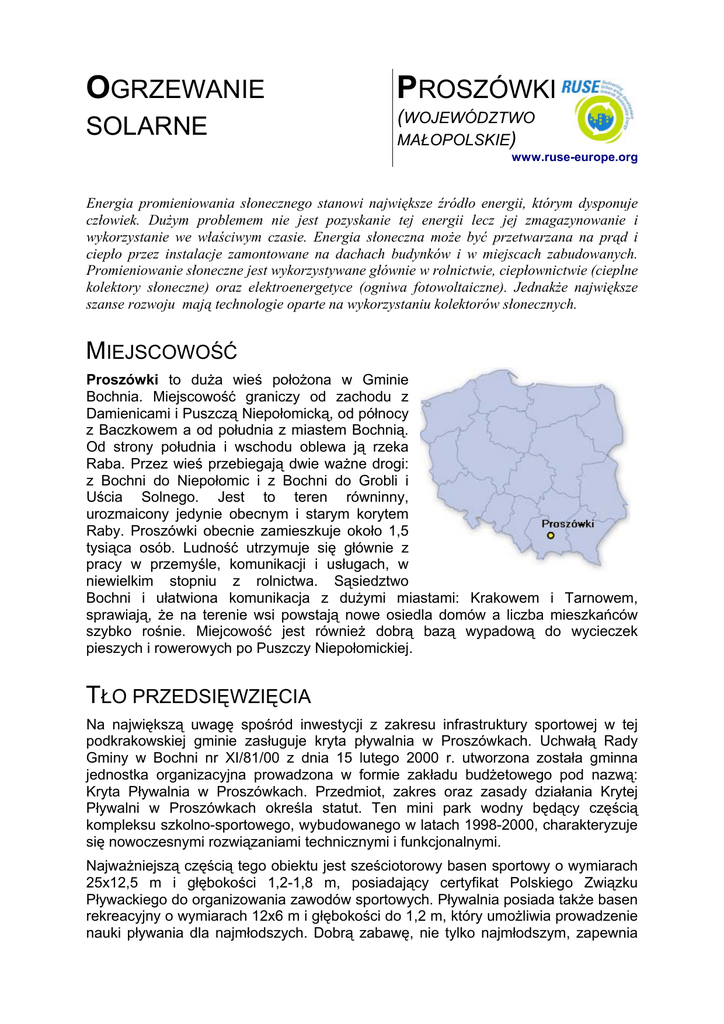 OGRZEWANIE PROSZÓWKI SOLARNE (WOJEWÓDZTWO MAŁOPOLSKIE) www.ruse-europe.org Energia promieniowania słonecznego stanowi największe źródło energii, którym dysponuje człowiek. Dużym problemem nie jest pozyskanie tej energii lecz jej zmagazynowanie i wykorzystanie we właściwym czasie. Energia słoneczna może być przetwarzana na prąd i ciepło przez instalacje zamontowane na dachach budynków i w miejscach zabudowanych. Promieniowanie słoneczne jest wykorzystywane głównie w rolnictwie, ciepłownictwie (cieplne kolektory słoneczne) oraz elektroenergetyce (ogniwa fotowoltaiczne). Jednakże największe szanse rozwoju mają technologie oparte na wykorzystaniu kolektorów słonecznych. MIEJSCOWOŚĆ Proszówki to duża wieś położona w Gminie Bochnia. Miejscowość graniczy od zachodu z Damienicami i Puszczą Niepołomicką, od północy z Baczkowem a od południa z miastem Bochnią. Od strony południa i wschodu oblewa ją rzeka Raba. Przez wieś przebiegają dwie ważne drogi: z Bochni do Niepołomic i z Bochni do Grobli i Uścia Solnego. Jest to teren równinny, urozmaicony jedynie obecnym i starym korytem Raby. Proszówki obecnie zamieszkuje około 1,5 tysiąca osób. Ludność utrzymuje się głównie z pracy w przemyśle, komunikacji i usługach, w niewielkim stopniu z rolnictwa. Sąsiedztwo Bochni i ułatwiona komunikacja z dużymi miastami: Krakowem i Tarnowem, sprawiają, że na terenie wsi powstają nowe osiedla domów a liczba mieszkańców szybko rośnie. Miejcowość jest również dobrą bazą wypadową do wycieczek pieszych i rowerowych po Puszczy Niepołomickiej. TŁO PRZEDSIĘWZIĘCIA Na największą uwagę spośród inwestycji z zakresu infrastruktury sportowej w tej podkrakowskiej gminie zasługuje kryta pływalnia w Proszówkach. Uchwałą Rady Gminy w Bochni nr XI/81/00 z dnia 15 lutego 2000 r. utworzona została gminna jednostka organizacyjna prowadzona w formie zakładu budżetowego pod nazwą: Kryta Pływalnia w Proszówkach. Przedmiot, zakres oraz zasady działania Krytej Pływalni w Proszówkach określa statut. Ten mini park wodny będący częścią kompleksu szkolno-sportowego, wybudowanego w latach 1998-2000, charakteryzuje się nowoczesnymi rozwiązaniami technicznymi i funkcjonalnymi. Najważniejszą częścią tego obiektu jest sześciotorowy basen sportowy o wymiarach 25x12,5 m i głębokości 1,2-1,8 m, posiadający certyfikat Polskiego Związku Pływackiego do organizowania zawodów sportowych. Pływalnia posiada także basen rekreacyjny o wymiarach 12x6 m i głębokości do 1,2 m, który umożliwia prowadzenie nauki pływania dla najmłodszych. Dobrą zabawę, nie tylko najmłodszym, zapewnia zjeżdżalnia rynnowa o długości 42 m oraz bicze wodne o różnym kształcie i natężeniu strumienia wodnego. Kolejną atrakcją jest jacuzzi, mogące pomieścić jednocześnie do 10 osób. Z kolei w najmniejszym basenie pływalni w Proszówkach można skorzystać z leczniczych kąpieli w roztworze sporządzonym na bazie bocheńskiej soli jodowo-bromowej, która jest naturalną solą krystaliczną otrzymywaną przez odparowanie wody z solanki jodkowo-bromkowej złoża Łapczyca, znajdującego się na terenie gminy Bochnia. Pomysł zrealizowania inwestycji był koncepcją wójta gminy. Nie było to jedyne w gminie działanie zmierzające do wykorzystania odnawialnych źródeł energii. Obecnie władze prowadzą zaawansowane badania oraz rozmowy dotyczące wykorzystania potwierdzonych złóż wód geotermalnych znajdujących się na terenie tej gminy, np. Cikowicach. OPIS PRZEDSIĘWZIĘCIA Układ solarny zainstalowany dla potrzeb pływalni w Proszówkach w połowie roku 2003 odpowiedzialny jest za ogrzewanie wody basenowej oraz użytkowej. W jego skład wchodzi 106 kolektorów słonecznych (Viessmann) każdy o powierzchni 2,5 m2 co daje łącznie 265 m2 powierzchni kolektorowej. Z każdego metra kwadratowego powierzchni kolektora rocznie otrzymuje się 600 kWh (szacunki minimalne) co łącznie daje wartość prawie 160 000 kWh w skali roku. Te teoretyczne założenia znalazły już swoje potwierdzenie w rzeczywistości po pierwszym roku eksploatacji układu. Oprócz kolektorów w skład układu wchodzi 6 zbiorników buforowych nisko temperaturowych oraz 2 wysoko temperaturowy każdy o pojemności 1300 l. Układ solarny włączony został w istniejący obieg grzewczy bazujący uprzednio tylko na jednym źródle ciepła jakim jest piec gazowy o mocy 460wkW. Dodatkowo jeszcze w całym grzewczym układzie pracują dwie pompy ciepła o łącznej mocy 60 kW. Jedna z nich współpracuje bezpośrednio z kolektorami druga natomiast pozyskuje ciepło ze ścieków opuszczających pływalnie. W najchłodniejszych miesiącach roku ścieki te posiadają temperaturę + 17ºC. Prawie połowa kosztów (42%) utrzymania Krytej Pływalni w Proszówkach związana była z wydatkami ponoszonymi na energię elektryczną oraz gaz. Pomysł zainstalowania układu solarnego wspomagającego istniejący układ grzewczy był więc naturalną konsekwencją eksploatacji tego obiektu. CHARAKTERYSTYKA KRYTEJ PŁYWALNI W PROSZÓWKACH - Całkowita kubatura pływalni 10230 m3; - Całkowita powierzchnia użytkowa pływalni 1550 m2; - Powierzchnia hali basenów 755 m2; - Powierzchnia lustra wody 385 m2; - Powierzchnia szatni i natrysków 123 m2; - Powierzchnia pomieszczeń technicznych (maszynownia, kotłowania, centrala wentylacyjna) 258 m2. ŹRÓDŁA FINANSOWANIA Koszt inwestycji wyniósł około 550 tys. zł, z czego 75% środków zostało pozyskane z programu SAPARD, 25% w formie dotacji z Wojewódzkiego Funduszu Ochrony Środowiska i Gospodarki Wodnej w Krakowie. OCENA I PERSPEKTYWY ROZWOJU Obok oszczędności finansowych uzyskanych dzięki zamontowaniu kolektorów, drugim istotnym czynnikiem jest fakt, iż naturalne paliwa kopalne (nieodnawialne źródła energii) zanieczyszczają środowisko naturalne, powoli się przy tym wyczerpując. Analizy geologiczne dotyczące czasu przez jaki