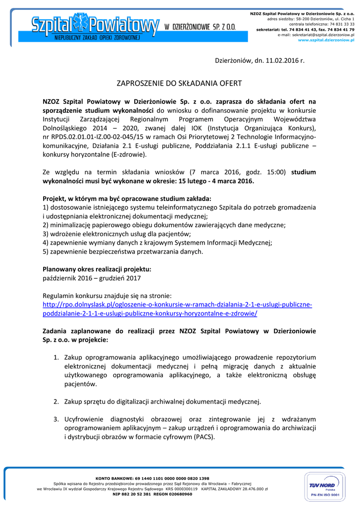 NZOZ Szpital Powiatowy w Dzierżoniowie Sp. z o.o. adres siedziby: 58-200 Dzierżoniów, ul. Cicha 1 centrala telefoniczna: 74 831 33 33 sekretariat: tel. 74 834 41 43, fax. 74 834 41 79 e-mail: [email protected] www.szpital.dzierzoniow.pl Dzierżoniów, dn. 11.02.2016 r. ZAPROSZENIE DO SKŁADANIA OFERT NZOZ Szpital Powiatowy w Dzierżoniowie Sp. z o.o. zaprasza do składania ofert na sporządzenie studium wykonalności do wniosku o dofinansowanie projektu w konkursie Instytucji Zarządzającej Regionalnym Programem Operacyjnym Województwa Dolnośląskiego 2014 – 2020, zwanej dalej IOK (Instytucja Organizująca Konkurs), nr RPDS.02.01.01-IZ.00-02-045/15 w ramach Osi Priorytetowej 2 Technologie Informacyjnokomunikacyjne, Działania 2.1 E-usługi publiczne, Poddziałania 2.1.1 E-usługi publiczne – konkursy horyzontalne (E-zdrowie). Ze względu na termin składania wniosków (7 marca 2016, godz. 15:00) studium wykonalności musi być wykonane w okresie: 15 lutego - 4 marca 2016. Projekt, w którym ma być opracowane studium zakłada: 1) dostosowanie istniejącego systemu teleinformatycznego Szpitala do potrzeb gromadzenia i udostępniania elektronicznej dokumentacji medycznej; 2) minimalizację papierowego obiegu dokumentów zawierających dane medyczne; 3) wdrożenie elektronicznych usług dla pacjentów; 4) zapewnienie wymiany danych z krajowym Systemem Informacji Medycznej; 5) zapewnienie bezpieczeństwa przetwarzania danych. Planowany okres realizacji projektu: październik 2016 – grudzień 2017 Regulamin konkursu znajduje się na stronie: http://rpo.dolnyslask.pl/ogloszenie-o-konkursie-w-ramach-dzialania-2-1-e-uslugi-publicznepoddzialanie-2-1-1-e-uslugi-publiczne-konkursy-horyzontalne-e-zdrowie/ Zadania zaplanowane do realizacji przez NZOZ Szpital Powiatowy w Dzierżoniowie Sp. z o.o. w projekcie: 1. Zakup oprogramowania aplikacyjnego umożliwiającego prowadzenie repozytorium elektronicznej dokumentacji medycznej i pełną migrację danych z aktualnie użytkowanego oprogramowania aplikacyjnego, a także elektroniczną obsługę pacjentów. 2. Zakup sprzętu do digitalizacji archiwalnej dokumentacji medycznej. 3. Ucyfrowienie diagnostyki obrazowej oraz zintegrowanie jej z wdrażanym oprogramowaniem aplikacyjnym – zakup urządzeń i oprogramowania do archiwizacji i dystrybucji obrazów w formacie cyfrowym (PACS). KONTO BANKOWE: 69 1440 1101 0000 0000 0820 1398 Spółka wpisana do Rejestru przedsiębiorców prowadzonego przez Sąd Rejonowy dla Wrocławia – Fabrycznej we Wrocławiu IX wydział Gospodarczy Krajowego Rejestru Sądowego KRS 0000300119 KAPITAŁ ZAKŁADOWY 28.476.000 zł NIP 882 20 52 381 REGON 020680960 NZOZ Szpital Powiatowy w Dzierżoniowie Sp. z o.o. adres siedziby: 58-200 Dzierżoniów, ul. Cicha 1 centrala telefoniczna: 74 831 33 33 sekretariat: tel. 74 834 41 43, fax. 74 834 41 79 e-mail: [email protected] www.szpital.dzierzoniow.pl 4. Zakup agregatu prądotwórczego teleinformatycznego. zapewniającego ciągłość pracy systemu 5. Modernizacja światłowodowej sieci szkieletowej (wykonanie wewnętrznych i zewnętrznych światłowodowych instalacji teletechnicznych, dodatkowe punkty logiczne, przełączniki). 6. Modernizacja serwerowni (zakup: dwóch serwerów na potrzeby tworzenia EDM i digitalizacji archiwalnej dokumentacji papierowej; dwóch serwerów na potrzeby udostępniania danych w ramach elektronicznej obsługi pacjentów; licencji oprogramowania obsługującego bazę danych oraz systemu monitoringu, ostrzegania i klimatyzowania pomieszczenia serwerowni). 7. Zakup 150 zestawów komputerowych PC dostosowanych do wymagań nowego oprogramowania aplikacyjnego wraz z licencjami systemu operacyjnego. 8. Zakup urządzenia UTM zapewniającego bezpieczeństwo monitorowanie ruchu na styku sieci komputerowej LAN i WAN. danych poprzez 9. Zakup dwóch infokiosków (terminali informacyjnych) dostosowanych do potrzeb osób niepełnosprawnych. 10. Utworzenie sieci bezprzewodowego internetu (WiFi) oraz zakup 16 tabletów medycznych dla lekarzy. Katalog zaplanowanych do wdrożenia elektronicznych usług publicznych dla pacjentów: W ramach elektronicznego konta pacjenci (po zalogowaniu na indywidualne konto) uzyskają dostęp do danych na temat przebiegu ich procesu diagnostyki i leczenia w Szpitalu. Poprzez konto możliwy będzie dostęp do następujących e-usług: 1) e-wyniki - odbieranie wyników badań laboratoryjnych oraz bakteriologicznych przez internet; 2) e-rejestracja - internetowa rezerwacja (anulowanie) terminu wizyty w przychodni/ poradni; 3) e-powiadomienia - na życzenie pacjenta przypomnienie poprzez SMS lub e-mail o zbliżającym się terminie wizyty lub zabiegu; 4) e-archiwum - dostęp do archiwalnej dokumentacji medycznej przez internet; 5) e-profilaktyka - informacja e-mail o programach profilaktycznych dla konkretnych grup pacjentów wraz z możliwością zapisania się na badanie; 6) e-deklaracja - internetowa deklaracja wyboru lekarza, pielęgniarki i położnej środowiskowej w ramach POZ. KONTO BANKOWE: 69 1440 1101 0000 0000 0820 1398 Spółka wpisana do Rejestru przedsiębiorców prowadzonego przez Sąd Rejonowy dla Wrocławia – Fabrycznej we Wrocławiu IX wydział Gospodarczy Krajowego Rejestru Sądowego KRS 0000300119 KAPITAŁ ZAKŁADOWY 28.476.000 zł NIP 882 20 52 381 REGON 020680960 NZOZ Szpital Powiatowy w Dzierżoniowie Sp. z o.o. adres siedziby: 58-200 Dzierżoniów, ul. Cicha 1 centrala telefoniczna: 74 831 33 33 sekretariat: tel. 74 834 41 43, fax. 74 834 41 79 e-mail: [email protected] www.szpital.dzierzoniow.pl Ponadto planowane jest umieszczenie w Szpitalu w Dzierżoniowie i w Bielawie tzw. infokiosków z dostępem do strony internetowej szpitala, możliwością zalogowania się na konto pacjenta oraz mapami obrazujących komunikację wewnątrz budynków szpitalnych (e-informacja, e-mapa). Oferty na opracowanie studium wykonalności należy składać w formie elektronicznej do dnia 15 lutego 2016, godz. 8:00. Oferta powinna