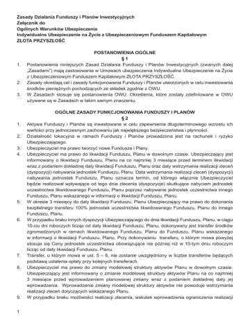 Zasady Działania Funduszy i Planów Inwestycyjnych Załącznik do Ogólnych Warunków Ubezpieczenia Indywidualne Ubezpieczenie na Życie z Ubezpieczeniowym Funduszem Kapitałowym ZŁOTA PRZYSZŁOŚĆ 1. 2. 3. 1. 2. 3. 4. 5. 6. 7. 8. 9. 1 POSTANOWIENIA OGÓLNE §1 Postanowienia niniejszych Zasad Działania Funduszy i Planów Inwestycyjnych (zwanych dalej „Zasadami”) mają zastosowanie w Umowach ubezpieczenia Indywidualne Ubezpieczenie na Życie z Ubezpieczeniowym Funduszem Kapitałowym ZŁOTA PRZYSZŁOŚĆ. Zasady określają cel i zasady funkcjonowania Funduszy i Planów utworzonych w celu inwestowania środków pieniężnych pochodzących ze składek zgodnie z OWU. W Zasadach stosuje się postanowienia OWU. Określenia, które zostały zdefiniowane w OWU używane są w Zasadach w takim samym znaczeniu. OGÓLNE ZASADY FUNKCJONOWANIA FUNDUSZY I PLANÓW §2 Aktywa Funduszy i Planów są inwestowane w celu zapewnienia długoterminowego wzrostu ich wartości przy jednoczesnym zachowaniu jak największego bezpieczeństwa i płynności. Działalność lokacyjna w ramach Funduszy i Planów prowadzona jest na rachunek i ryzyko Ubezpieczającego. Ubezpieczyciel ma prawo tworzyć nowe Fundusze i Plany. Ubezpieczyciel ma prawo do likwidacji Funduszu, Planu w dowolnym czasie. Ubezpieczający jest informowany o likwidacji Funduszu, Planu na co najmniej 3 miesiące przed terminem likwidacji wraz z podaniem dokładnej daty likwidacji Funduszu, Planu oraz daty wstrzymania realizacji zleceń (dyspozycji) nabywania jednostek Funduszu, Planu. Data wstrzymania realizacji zleceń (dyspozycji) nabywania jednostek Funduszu, Planu oznacza termin, od którego włącznie Ubezpieczyciel będzie realizował wpływające od tego dnia zlecenia (dyspozycje) skutkujące nabyciem jednostek uczestnictwa likwidowanego Funduszu, Planu poprzez nabywanie jednostek uczestnictwa innego Funduszu, Planu wskazanego w informacji o likwidacji Funduszu, Planu. W okresie 3 miesięcy do daty likwidacji Funduszu, Planu Ubezpieczający ma prawo do dokonania bezpłatnego transferu 100% jednostek uczestnictwa likwidowanego Funduszu, Planu do innego Funduszu, Planu. W przypadku braku innych dyspozycji Ubezpieczającego do dnia likwidacji Funduszu, Planu, w ciągu 10-ciu dni roboczych licząc od daty likwidacji Funduszu, Planu, dokonywany jest transfer środków zgromadzonych w ramach likwidowanego Funduszu, Planu do Funduszu, Planu wskazanego w informacji o likwidacji Funduszu, Planu. Przy dokonywaniu transferu, o którym mowa powyżej stosuje się Ceny jednostek uczestnictwa obowiązujące nie później niż w 10-tym dniu roboczym licząc od daty likwidacji Funduszu, Planu. Transfer, o którym mowa w ust. 5 – 6, nie zostanie uwzględniony w liczbie transferów będących podstawą ustalenia opłaty przy kolejnych transferach. Ubezpieczyciel ma prawo do zmiany modelowej struktury aktywów Planu w dowolnym czasie. Ubezpieczający jest informowany o zmianie modelowej struktury aktywów Planu na co najmniej 3 miesiące przed wprowadzeniem planowanej zmiany wraz z podaniem dokładnej daty jej wprowadzenia. Wprowadzenie zmiany modelowej struktury aktywów nie powoduje wstrzymania realizacji zleceń dotyczących wskazanego Planu. W przypadku braku możliwości realizacji zlecenia, wskutek wprowadzenia ograniczenia realizacji 10. 11. 12. 13. 14. 15. 1. 2. 3. 4. zleceń przez którykolwiek z funduszy inwestycyjnych, w który lokowane są środki Funduszu, Planu objętego zleceniem Ubezpieczającego, Ubezpieczyciel może zawiesić możliwość dokonywania nabycia jednostek Funduszu, Planu oraz transferu środków do Funduszu, Planu w przypadku zawieszenia zbywania jednostek uczestnictwa funduszu inwestycyjnego, w którego jednostki lokowane są aktywa tego Funduszu, Planu. W przypadku braku możliwości realizacji zlecenia, wskutek wprowadzenia ograniczenia realizacji zleceń przez którykolwiek z funduszy inwestycyjnych, w który lokowane są środki Funduszu, Planu objętego zleceniem Ubezpieczającego, Ubezpieczyciel może zawiesić możliwość dokonywania wykupów częściowych i wykupów całkowitych bądź transferu środków z danego Funduszu, Planu w przypadku zawieszenia odkupywania jednostek uczestnictwa funduszu inwestycyjnego, w którego jednostki lokowane są aktywa tego Funduszu, Planu. Zlecenia, o których mowa w ust. 9 - 10 zostaną zrealizowane po przywróceniu możliwości ich realizacji zgodnie z trybem, w jakim fundusz inwestycyjny, w którym są lokowane środki Funduszu, Planu realizował będzie nabycia oraz umorzenia jednostek uczestnictwa. Ubezpieczyciel poinformuje na stronie internetowej www.warta.pl o podjęciu decyzji o których mowa w ust. 9 i 10 oraz zasadach zawieszenia i realizacji zleceń. Z zastrzeżeniem postanowień ust. 14 oraz § 3 - 6 aktywa Funduszu są inwestowane w całości w jednostki uczestnictwa funduszu inwestycyjnego otwartego lub w całości w inne tytuły uczestnictwa, umarzane na żądanie, emitowane przez instytucję wspólnego inwestowania, mającą siedzibę na terytorium państwa członkowskiego Unii Europejskiej. Aktywa Funduszu mogą być lokowane poza granicami państw członkowskich Unii Europejskiej zgodnie z zasadami określonymi w zezwoleniu ogólnym, udzielonym przez ministra właściwego do spraw instytucji finansowych w drodze rozporządzenia, na uznawanie za środki stanowiące pokrycie rezerw techniczno-ubezpieczeniowych aktywów znajdujących się poza granicami państw członkowskich Unii Europejskiej. Charakterystykę aktywów otwartego funduszu inwestycyjnego, kryteria doboru jego aktywów oraz zasady ich dywersyfikacji i inne ograniczenia inwestycyjne określa statut funduszu inwestycyjnego otwartego, w którego jednostki uczestnictwa są lokowane aktywa Funduszu, a w przypadku innych tytułów uczestnictwa umarzanych na żądanie, emitowanych przez instytucję wspólnego inwestowania mającą siedzibę poza terytorium Polski – właściwe dokumenty regulujące organi