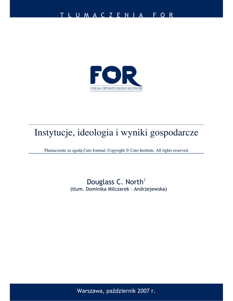 Instytucje, ideologia i wyniki gospodarcze Tłumaczenie za zgodą Cato Journal. Copyright Cato Institute. All rights reserved. Douglass C. North1 (tłum. Dominika Milczarek – Andrzejewska) Warszawa, październik 2007 r. Douglass C. North1 Główna teza tego tekstu brzmi następująco: instytucje wspólnie z ideologią kształtują wyniki gospodarcze. Instytucje wpływają na sytuację gospodarczą determinując (wraz z wykorzystywaną technologią) koszty transakcji i produkcji. Instytucje składają się z zasad formalnych, nieformalnych ograniczeń i cech pozwalających na egzekwowanie tych ograniczeń. Podczas gdy zasady formalne mogą być zmienione przez administrację państwową w ciągu jednej nocy, ograniczenia nieformalne zmieniają się bardzo powoli. Zarówno zasady formalne jak i ograniczenia nieformalne są ostatecznie kształtowane przez subiektywne postrzeganie otaczającego świata przez ludzi. Z kolei percepcja świata determinuje bezpośrednie wybory pomiędzy zasadami formalnymi a ewoluującymi ograniczeniami nieformalnymi. W dalszych częściach tekstu przedstawię ramy analityczne wykorzystywane przeze mnie do zdiagnozowania odmiennych wyników gospodarczych zachodnich gospodarek rynkowych, krajów Trzeciego Świata i gospodarek socjalistycznych. INSTYTUCJE I KOSZTY TRANSAKCYJNE Instytucje są to zasady gry w społeczeństwie, a bardziej formalnie, to stworzone przez ludzi ograniczenia, które kształtują ludzkie interakcje. Tworzą więc one strukturę bodźców w procesie wymiany czy to politycznym, społecznym czy gospodarczym. Zmiana instytucjonalna kształtuje sposób w jaki społeczeństwa ewoluują na przestrzeni czasu, i w związku z tym, jest kluczem do zrozumienia zmiany historycznej. Fakt, że instytucje wpływają na wyniki gospodarcze nie budzi raczej kontrowersji. Nie jest także kontrowersyjne stwierdzenie, że zróżnicowane wyniki gospodarcze krajów na przestrzeni lat wynikają przede wszystkim ze sposobu w jaki ewoluują instytucje. Jednak zachodnia, neoklasyczna teoria ekonomiczna jest wciąż pozbawiona instytucji, a przez to jest w niewielkim stopniu przydatna do analizowania podstawowych źródeł rozwoju gospodarczego. 1 North. D.C., Institutions, Ideology and Economic Performance, “Cato Journal”, vol. 11, nr 3 (Winter 1992). Tekst pochodzi częściowo z pracy Northa (1990b). Nie będzie wielką przesadą stwierdzenie, że podczas gdy teoria neoklasyczna koncentruje się na działaniu efektywnych rynków, niewielu zachodnich ekonomistów rozumie jakie wymogi instytucjonalne są niezbędne do stworzenia takich rynków. Traktują je po prostu jako dane. A efektywne rynki czynników produkcji i produktów finalnych, na których opiera się wzrost gospodarczy, wymagają zestawu instytucji politycznych i ekonomicznych odpowiedzialnych za niskie koszty transakcyjne oraz wiarygodne zobowiązania. Koszty transakcyjne w procesie wymiany są determinowane przez cztery główne zmienne. Pierwsza z nich to koszt pomiaru wartościowych cech towarów i usług lub działalności ludzi podczas procesu wymiany. Prawa własności składają się z wiązki uprawnień. I jeśli nie jesteśmy w stanie precyzyjnie zmierzyć wartościowych cech poszczególnych uprawnień, wówczas koszty transakcyjne i niepewność związana z transakcją dramatycznie rosną. Pomiar obejmuje zdefiniowanie wymiarów fizycznych uprawnień będących przedmiotem wymiany (koloru, wielkości, wagi, liczby, itd.) oraz wymiarów praw własności (uprawnień definiujących użycie, uzyskiwany dochód i przeniesienie własności). W świecie, w którym koszty pomiaru równałyby się zeru, społeczeństwa nie musiałyby przeznaczać ogromnych zasobów na organizacje i egzekwowanie umów. Ale ponieważ koszty te są niezwykle wysokie, a w konsekwencji tego, prawa nie są doskonale określone, inne zmienne odgrywają ważną rolę w kosztach procesu wymiany. Drugą zmienną związaną z kosztami transakcji jest wielkość rynku, która określa czy przeprowadzana wymiana ma charakter interpersonalny czy bezosobowy. Podczas wymiany interpersonalnej to więzy rodzinne, przyjaźń, osobista lojalność i powtarzające się kontakty handlowe ograniczają zachowanie uczestników oraz zmniejszają potrzebę kosztownej specyfikacji i egzekwowania zobowiązań. W przeciwnym przypadku - podczas wymiany bezosobowej - nic nie powstrzymuje przed wykorzystaniem drugiej strony. W konsekwencji, koszt umowy rośnie wraz z potrzebą opracowania bardziej szczegółowego opisu wymienianych praw. Gdy strony transakcji angażują się w powtarzające się kontakty handlowe na bezosobowych rynkach, rolę podstawowego ograniczenia pełni wówczas efektywna konkurencja. Trzecią zmienną jest egzekwowanie umów. W sytuacji idealnej - w świecie doskonałego egzekwowania umów - osoby trzecie mogłyby bezstronnie (i bez kosztów) rozstrzygać spory i wyznaczać odszkodowanie dla pokrzywdzonej strony w przypadku naruszenia warunków umowy. Oportunizm, unikanie obowiązków i oszukiwanie nigdy nie opłacałby się w takim świecie. Ale taki świat nie istnieje. W rzeczywistości stworzenie względnie bezstronnego systemu sądowniczego egzekwującego warunki umów stanowiło krytyczną trudność na ścieżce rozwoju gospodarczego. Ewolucja sądów, systemu prawnego i relatywnie niezależnych organów prawnej egzekucji odegrała główną rolę w rozwoju skomplikowanego systemu umów w świecie zachodnim. Umowy te, posiadające zdolność rozwijania się w czasie i przestrzeni, są kluczowym wymogiem świata specjalizacji. Jeśli utrzymamy neoklasyczne behawioralne założenie o maksymalizacji bogactwa, jedynie te trzy zmienne będą determinować koszty wymiany. Wówczas, jednostki maksymalizować będą bogactwo w każdej sytuacji (jeśli oszukiwanie opłaca się, jednostka będzie oszukiwać, jeśli próżnowanie w pracy jest możliwe, jednostka będzie próżnować, a jeśli jednostka może bezkarnie zniszczy