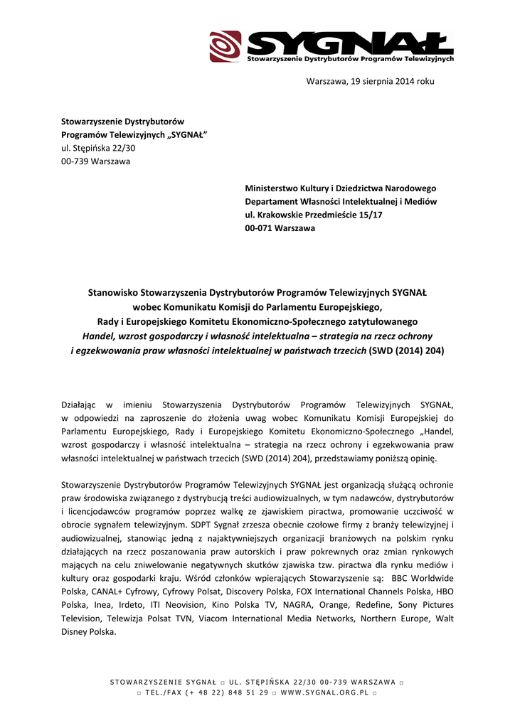 Warszawa, 19 sierpnia 2014 roku Stowarzyszenie Dystrybutorów Programów Telewizyjnych „SYGNAŁ” ul. Stępińska 22/30 00-739 Warszawa Ministerstwo Kultury i Dziedzictwa Narodowego Departament Własności Intelektualnej i Mediów ul. Krakowskie Przedmieście 15/17 00-071 Warszawa Stanowisko Stowarzyszenia Dystrybutorów Programów Telewizyjnych SYGNAŁ wobec Komunikatu Komisji do Parlamentu Europejskiego, Rady i Europejskiego Komitetu Ekonomiczno-Społecznego Ekonomiczno Społecznego zatytułowanego Handel, wzrost gospodarczy i własność intelektualna – strategia na rzecz ochrony i egzekwowania praw własności intelektualnej w państwach trzecich (SWD (2014) 204) Działając w imieniu Stowarzyszenia Dystrybutorów Programów Telewizyjnych SYGNAŁ, w odpowiedzi na zaproszenie zenie do złożenia uwag wobec Komunikatu Komisji Europejskiej do Parlamentu Europejskiego, Rady i Europejskiego Komitetu Ekonomiczno-Społecznego Ekonomiczno Społecznego „Handel, wzrost gospodarczy i własność intelektualna – strategia na rzecz ochrony i egzekwowania praw własności intelektualnej w państwach trzecich (SWD (2014) 204), przedstawiamy poniższą opinię. Stowarzyszenie Dystrybutorów Programów Telewizyjnych SYGNAŁ jest organizacją służącą ochronie praw środowiska związanego z dystrybucją treści audiowizualnych, w tym nadawców, dystrybutorów i licencjodawców programów poprzez walkę ze zjawiskiem piractwa, promowanie uczciwość w obrocie sygnałem telewizyjnym. SDPT Sygnał zrzesza obecnie obecnie czołowe firmy z branży telewizyjnej i audiowizualnej, stanowiąc jedną z najaktywniejszych organizacji branżowych na polskim rynku działających na rzecz poszanowania praw autorskich i praw pokrewnych oraz zmian rynkowych mających na celu zniwelowanie negatywnych negatywnych skutków zjawiska tzw. piractwa dla rynku mediów i kultury oraz gospodarki kraju. Wśród członków wpierających Stowarzyszenie są: BBC Worldwide Polska, CANAL+ Cyfrowy, Cyfrowy Polsat, Discovery Polska, FOX International Channels Polska, HBO Polska,, Inea, Irdeto, ITI Neovision, Kino Polska TV, NAGRA, Orange, Redefine, Sony Pictures Television, Telewizja Polsat TVN, Viacom International Media Networks, Northern Europe, Walt Disney Polska. STOWARZYSZENIE SYGNAŁ □ UL. STĘPIŃSKA 22/30 00-739 WARSZAWA □ □ TEL./FAX (+ 48 22) 848 51 29 □ WWW.SYGNAL.ORG.PL □ Na wstępnie pragniemy wyrazić poparcie dla inicjatyw na rzecz lepszej ochrony i egzekwowania praw własności intelektualnej dostrzegając potrzebę usprawnienia stosowanych mechanizmów pozwalających skuteczniej działać w dobie dystrybucji internetowej. W Komunikacie Komisji słusznie zwrócono uwagę na coraz większe lekceważenie praw własności intelektualnej pomimo kluczowej roli dla gospodarki europejskich sektorów opartych na własności intelektualnej. W uzupełnieniu danych wskazujących na straty liczone w PKB UE z powodu podrabiania i piractwa pragniemy zwrócić uwagę na szczególną sytuację w Polsce. Według danych PwC samo piractwo medialne tylko treści audiowizualnych bez zdecydowanych działań na rzecz ochrony własności intelektualnej może w 2018 roku powodować straty dla gospodarki przekraczające 6 mld zł, co stanowi w przybliżeniu budżet całego Ministerstwa Kultury i Dziedzictwa Narodowego. Polska jest w czołówce państw europejskich pod względem kradzieży własności intelektualnej w Internecie, co wynika poza kwestiami społeczno-ekonomicznymi m.in. z braku wprowadzenia regulacji czy programów rządowych mających na celu przeciwdziałanie naruszeniom praw własności intelektualnej. Podzielając większość zgłoszonych opinii pragniemy podkreślić rolę odpowiedzialności pośredników internetowych. W przypadku kradzieży własności intelektualnej w Internecie mamy do czynienia z sytuacją istotnie odmienną od np. problemu wytwarzania i sprzedaży towarów podrabianych, a rola pośredników ma kluczową rolę w nielegalnej dystrybucji internetowej treści autorskich. Fakt prowadzenia działalności przestępczych polegających na czerpaniu korzyści finansowych z nielegalnej dystrybucji treści prawno-autorskich w oparciu o strukturę rozproszoną po kilku krajach w zestawieniu z faktem, że treści te są przeważnie kierowane do odbiorców określonego kraju, o czym świadczy np. język, w którym oferowane są treści audiowizualne, wskazuje na celowość rozproszenia działalności w celu utrudnienia identyfikacji naruszyciela praw oraz prowadzenia postępowań prawnych. Zatem w przypadku kradzieży własności intelektualnej w Internecie rola współpracy międzynarodowej w ramach UE oraz w relacji z krajami trzecimi ma kluczową rolę w skutecznej ochronie i egzekwowaniu praw własności intelektualnej. Problem współpracy z państwami trzecimi pojawia się również w sprawach, gdzie pomoc prawna niezbędna jest do uzyskania z państw mających rozbudowany system ochrony własności intelektualnej – m. in. z USA. Stowarzyszenie wielokrotnie spotkało się z umorzeniami spraw dotyczących naruszeń własności intelektualnej w Internecie z powodu braku możliwości uzyskania informacji od organów amerykańskich. Należy również dodać, że każdorazowa próba uzyskania informacji przez polskie organy ścigania trwała znaczny okres czasu, co jeszcze bardziej utrudnia doprowadzenie do efektywnego przeciwdziałania naruszeniom, poprzez doprowadzenie do zamknięcia serwisu łamiącego prawo. Pragniemy zauważyć, że poprawie ulec musi nie tylko relacja z krajami trzecimi, lecz także w ramach Unii Europejskiej. W Polsce funkcjonuje szereg serwisów internetowej udostępniających treści audiowizualnej bez stosownych praw licencyjnych, które w celu unikania odpowiedzialności prowadzą rozproszoną działalność poprzez lokowanie serwerów poza Polską (np. Francja, Niemcy, Holandia) oraz rejestrując działalność w jeszcze innym kraju (np. Cypr, Rumunia). Brak sprawn