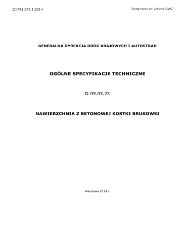 Załącznik nr 2a do SIWZ CKPSS.272.1.2014 GENERALNA DYREKCJA DRÓG KRAJOWYCH I AUTOSTRAD OGÓLNE SPECYFIKACJE TECHNICZNE D-05.03.23 NAWIERZCHNIA Z BETONOWEJ KOSTKI BRUKOWEJ Warszawa 2013 r. Nawierzchnia z betonowej kostki brukowej D-05.03.23 Spis treści: 1. Wstęp. 1.1. Przedmiot OST. 1.2. Zakres stosowania OST. 1.3. Zakres robót objętych OST. 1.4. Określenia podstawowe. 1.5. Ogólne wymagania robót. 2. Materiały. 2.1. Ogólne wymagania dotyczące materiałów. 2.2. Betonowa kostka brukowa. 2.2.1. Klasyfikacja betonowych kostek brukowych. 2.2.2. Wymagania techniczne stawiane betonowym kostkom brukowym. 2.2.3. Składowanie kostek. 2.3. Materiały na podsypkę i do wypełnienia spoin. 2.4. Materiały na podbudowę pod nawierzchnię z betonowej kostki brukowej. 3. Sprzęt. 3.1. Ogólne wymagania dotyczące sprzętu. 3.2. Sprzęt do wykonania nawierzchni z kostki brukowej. 4. Transport. 4.1. Ogólne wymagania dotyczące transportu. 4.2. Transport betonowych kostek brukowych. 5. Wykonanie robót. 5.1. Ogólne zasady wykonania robót. 5.2. Podłoże i koryto. 5.3. Podbudowa. 5.4. Obramowanie nawierzchni. 5.5. Podsypka 5.6. Układanie nawierzchni z betonowych kostek brukowych. 5.6.1. Ustalenie kształtu, wymiaru i koloru kostek oraz desenia ich układania. 5.6.2. Warunki atmosferyczne. 5.6.3. Ułożenie nawierzchni z kostek. 5.6.4. Ubicie nawierzchni z kostek. 5.6.5. Wypełnienie spoin. 5.6.6. Pielęgnacja nawierzchni i oddanie jej do ruchu. 6. Kontrola jakości robót. 6.1. Ogólne zasady kontroli jakości robót. 6.2. Badania przed przystąpieniem do robót. 6.3. Badania odbiorcze betonowej kostki brukowej 6.4. Badania w czasie robót. 6.4.1. Sprawdzenie podłoża w korycie i podbudowy. 6.4.2. Sprawdzenie podsypki. 6.4.3. Sprawdzenie wykonania nawierzchni. 6.5. Sprawdzenie cech geometrycznych nawierzchni. 6.5.1. Równość podłużna. 6.5.2. Równość w przekroju poprzecznym. 6.5.3. Spadki poprzeczne. Strona 2 z 15 Nawierzchnia z betonowej kostki brukowej D-05.03.23 6.5.4. Niweleta nawierzchni. 6.5.5. Szerokość nawierzchni. 6.5.6. Grubość podsypki. 6.6. Częstotliwość pomiarów. 7. Obmiar robót. 7.1. Ogólne zasady obmiaru robót. 7.2. Jednostka obmiarowa. 8. Odbiór robót. 8.1. Ogólne zasady odbioru robót. 8.2. Odbiór robót zanikających i ulegających zakryciu. 9. Podstawa płatności. 9.1. Ogólne ustalenia dotyczące podstawy płatności. 10. Przepisy związane. Strona 3 z 15 Nawierzchnia z betonowej kostki brukowej D-05.03.23 1. W s t ę p . 1.1. Przedmiot OST. Przedmiotem niniejszej Ogólnej Specyfikacji Technicznej (OST) są wymagania dotyczące wykonania i odbioru robót budowlanych związanych z wykonaniem nawierzchni z betonowej kostki brukowej. 1.2. Zakres stosowania OST. Ogólna Specyfikacja Techniczna (OST) jest materiałem pomocniczym do opracowania specyfikacji technicznej wykonania i odbioru robót budowlanych (STWiORB) stosowanej jako dokument przetargowy i kontraktowy przy zlecaniu i realizacji robót na drogach krajowych. Zaleca się wykorzystanie OST przy zlecaniu robót na drogach wojewódzkich, powiatowych i gminnych. 1.3. Zakres robót objętych OST. Ustalenia zawarte w niniejszej specyfikacji dotyczą zasad prowadzenia robót związanych z wykonaniem i odbiorem nawierzchni z betonowej kostki brukowej. 1.4. Określenia podstawowe. Betonowa kostka brukowa - prefabrykat betonowy wykonany z betonu niezbrojonego na spoiwie cementowym, stosowany jako materiał nawierzchni, który spełnia następujące warunki: - w odległości 50 mm od każdej krawędzi, żaden przekrój poprzeczny nie powinien wykazywać wymiaru poziomego mniejszego niż 50mm; - całkowita długość kostki podzielona przez jej grubość powinna być mniejsza lub równa cztery. UWAGA Tych dwóch wymagań nie stosuje się do elementów uzupełniających, czyli całych elementów, lub ich części, które są stosowane do uzupełnienia i które umożliwiają uzyskanie obszaru całkowicie wybrukowanego. Spoina – odstęp pomiędzy przylegającymi elementami (kostkami) wypełniony określonymi materiałami wypełniającymi. Pozostałe określenia podstawowe są zgodne z odpowiednimi polskimi normami i definicjami podanymi w OST D-M-00.00.00. "Wymagania ogólne" pkt 1.4. 1.5. Ogólne wymagania dotyczące robót. Wykonawca robót jest odpowiedzialny za jakość ich wykonania oraz za zgodność z Dokumentacją Projektową, OST i poleceniami Inżyniera. Ogólne wymagania dotyczące robót podano w OST D-M-00.00.00. „Wymagania ogólne” pkt 1.5. 2. M a t e r i a ł y . 2.1. Ogólne wymagania dotyczące materiałów. Ogólne wymagania dotyczące materiałów, ich pozyskiwania i składowania, podano w OST D-M-00.00.00. „Wymagania ogólne” pkt. 2. Strona 4 z 15 Nawierzchnia z betonowej kostki brukowej D-05.03.23 2.2. Betonowa kostka brukowa. 2.2.1. Klasyfikacja betonowych kostek brukowych. Betonowa kostka brukowa może mieć następujące cechy charakterystyczne, określone w katalogu producenta: 1) odmianę: a) kostka jednowarstwowa (z jednego rodzaju betonu), b) kostka dwuwarstwowa z betonu warstwy spodniej konstrukcyjnej i warstwy ścieralnej (górnej) zwykle barwionej grubości min. 5 mm, 2) barwę: a) kostka z betonu niebarwionego, b) kostka kolorowa, z betonu barwionego; 3) wzór (kształt) kostki: zgodny z kształtami określonymi przez producenta, 4) wymiary, zgodne z wymiarami określonymi przez producenta; zalecane grubości: a) dla nawietrzni przeznaczonej do ruchu pojazdów - 80 mm, 100 mm, b) dla ciągów pieszych – 60 mm, 80 mm, c) w indywidualnych rozwiązaniach dopuszcza się inne grubości kostek niż podano powyżej. Pożądane jest, aby wymiary kostek były dostosowane do sposobu układania i siatki spoin oraz umożliwiały wykonanie warstwy o szerokości 1,0 m lub 1,5 m bez konieczności przecinania elementów w trakcie ich wbudowywania w nawierzchnię. Kostki mogą być produkowane z występami dystansowymi na powierzchniach bocznych oraz z fazą lub bez fazy (w tym z