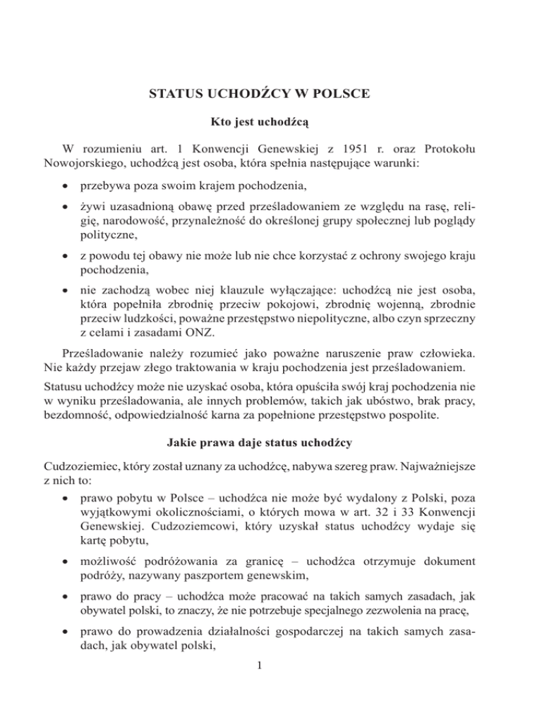 STATUS UCHODŹCY W POLSCE Kto jest uchodźcą W rozumieniu art. 1 Konwencji Genewskiej z 1951 r. oraz Protokołu Nowojorskiego, uchodźcą jest osoba, która spełnia następujące warunki: • przebywa poza swoim krajem pochodzenia, • żywi uzasadnioną obawę przed prześladowaniem ze względu na rasę, religię, narodowość, przynależność do określonej grupy społecznej lub poglądy polityczne, • z powodu tej obawy nie może lub nie chce korzystać z ochrony swojego kraju pochodzenia, • nie zachodzą wobec niej klauzule wyłączające: uchodźcą nie jest osoba, która popełniła zbrodnię przeciw pokojowi, zbrodnię wojenną, zbrodnie przeciw ludzkości, poważne przestępstwo niepolityczne, albo czyn sprzeczny z celami i zasadami ONZ. Prześladowanie należy rozumieć jako poważne naruszenie praw człowieka. Nie każdy przejaw złego traktowania w kraju pochodzenia jest prześladowaniem. Statusu uchodźcy może nie uzyskać osoba, która opuściła swój kraj pochodzenia nie w wyniku prześladowania, ale innych problemów, takich jak ubóstwo, brak pracy, bezdomność, odpowiedzialność karna za popełnione przestępstwo pospolite. Jakie prawa daje status uchodźcy Cudzoziemiec, który został uznany za uchodźcę, nabywa szereg praw. Najważniejsze z nich to: • prawo pobytu w Polsce – uchodźca nie może być wydalony z Polski, poza wyjątkowymi okolicznościami, o których mowa w art. 32 i 33 Konwencji Genewskiej. Cudzoziemcowi, który uzyskał status uchodźcy wydaje się kartę pobytu, • możliwość podróżowania za granicę – uchodźca otrzymuje dokument podróży, nazywany paszportem genewskim, • prawo do pracy – uchodźca może pracować na takich samych zasadach, jak obywatel polski, to znaczy, że nie potrzebuje specjalnego zezwolenia na pracę, • prawo do prowadzenia działalności gospodarczej na takich samych zasadach, jak obywatel polski, 1 • prawo do świadczeń pomocy społecznej, otrzymywania zasiłków rodzinnego, pielęgnacyjnego i wychowawczego, • prawo do nauki w szkołach podstawowych, gimnazjalnych i ponadgimnazjalnych (licea, technika), oraz w szkołach wyższych, • prawo do ubezpieczenia zdrowotnego: uchodźca może ubezpieczyć się dobrowolnie w Narodowym Funduszu Zdrowia lub podlega obowiązkowi ubezpieczenia zdrowotnego, wynikającego z umowy o pracę, • prawo do pomocy integracyjnej, • możliwość ubiegania się o obywatelstwo polskie na korzystniejszych warunkach, niż inni cudzoziemcy. Postępowanie w sprawie o status uchodźcy Status uchodźcy nadawany jest na wniosek cudzoziemca, składany za pośrednictwem Straży Granicznej. Postępowanie w pierwszej instancji prowadzi Prezes Urzędu do Spraw Repatriacji i cudzoziemców i on wydaje decyzje o nadaniu bądź odmowie nadania statusu uchodźcy. Od decyzji Prezesa o odmowie nadania statusu uchodźcy cudzoziemiec może odwołać się w terminie 14 dni od dnia doręczenia decyzji do Rady do Spraw Uchodźców. Na negatywną decyzję Rady przysługuje skarga do Naczelnego Sądu Administracyjnego w terminie 30 dni od dnia doręczenia decyzji. Skargę wnosi się bezpośrednio do Sądu. Należy złożyć oryginał oraz kopię skargi, obie podpisane oraz wpłacić opłatę sądową w wysokości 10 zł (znaczki opłaty sądowej można wykupić w dowolnym sądzie). Skarga powinna wskazywać naruszenia przepisów prawa, do których doszło przy wydawaniu decyzji. (od dnia 1 stycznia 2004 r. na podstawie ustawy z dnia 30 sierpnia 2002 r. Prawo o postępowaniu przed sądami administracyjnymi, przysługuje skarga do wojewódzkiego sądu administracyjnego, właściwego dla Województwa Mazowieckiego). Przepisy postępowania regulują przede wszystkim: ustawa o udzielaniu cudzoziemcom ochrony na terytorium Rzeczpospolitej Polskiej, kodeks postępowania administracyjnego oraz ustawa o Naczelnym Sądzie Administracyjnym (od dnia 1 stycznia 2004 r. ustawa Prawo o postępowaniu przed sądami administracyjnymi). 2 Wniosek o nadanie statusu uchodźcy Wniosek o status uchodźcy cudzoziemiec składa do Prezesa Urzędu do Spraw Repatriacji i Cudzoziemców, za pośrednictwem: • komendanta oddziału Straży Granicznej, obejmującego swoim terytorialnym zasięgiem działania m.st. Warszawę lub komendanta granicznej placówki kontrolnej Straży Granicznej, albo • komendanta granicznej placówki kontrolnej Straży Granicznej – jeżeli cudzoziemiec nie posiada prawa wjazdu na terytorium Polski. Wniosek należy wówczas złożyć w czasie kontroli granicznej przy wjeździe na terytorium Polski. Wniosek obejmuje małoletnie dzieci cudzoziemca. Wniosek może też objąć małżonka, o ile wyrazi on pisemnie swoją zgodę. Małżonek może też wystąpić z własnym wnioskiem i wtedy postępowanie toczy się odrębnie. Takie rozwiązanie może być korzystniejsze w sytuacji, gdy małżonkowie obawiają się prześladowania z różnych powodów. Wniosek o status uchodźcy składa się osobiście - nie można złożyć wniosku przez pełnomocnika. We wniosku należy podać kraj pochodzenia oraz powody uzasadnionej obawy przed prześladowaniem z powodu rasy, religii, narodowości, przynależności do określonej grupy społecznej lub poglądów politycznych. Tymczasowe zaświadczenie tożsamości cudzoziemca Przy złożeniu wniosku, cudzoziemiec, który posiada dokument podróży (paszport), składa go do depozytu. Jeżeli cudzoziemiec występuje o status uchodźcy mając w Polsce zezwolenie na zamieszkanie na czas oznaczony lub na osiedlenie się, dokument jest składany w chwili upływu ważności zezwolenia. Cudzoziemcowi wydaje się tymczasowe zaświadczenie tożsamości cudzoziemca (TZTC), które uprawnia do pobytu w Polsce. TZTC jest ważne 30 dni, następnie jego ważność przedłuża się, o ile nie została wydana decyzja ostateczna. Cudzoziemiec ma obowiązek zwrócić TZTC po wydaniu decyzji ostatecznej w sprawie o nadanie statusu uchodźcy. Pozostawienie wniosku bez rozpoznania Wn