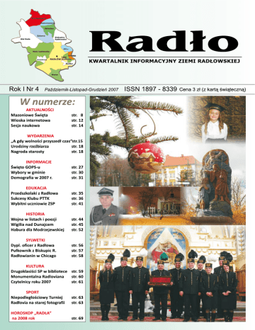 Szanowni Czytelnicy! Z wielką radością i satysfakcją zamykamy rok świątecznym „Radłem”. Dołożyliśmy wszelkich starań, abyście Państwo mogli jeszcze piękniej napawać się świąteczno-noworoczną atmosferą. Wiele w nim wydarzeń znaczących dla poprawy, rozwoju Radłowa i gminy. Najważniejsze, roczne wydarzenia zostały ujęte w poszczególnych wydaniach Kwartalnika 2007, które stworzą pierwszy archiwalny, dokumentacyjny rocznik. Zawartość jego zostanie elektronicznie skatalogowana, przez co, dostęp do poszczególnych informacji będzie błyskawiczny. Ale cóż wspominać, jeśli przed nami najwspanialsza, cudowna magia świąt. Z tej niezwykłej okazji dołączamy kartę świąteczno-noworoczną, oryginalną z uwagi na elementy radłowszczyzny, aby sprawić namacalną radość, wzruszyć tych wszystkich mieszkańców Ziemi Radłowskiej, których los życia skierował w odległe części Polski, Europy czy Świata. Niechaj ufają nam, że myślimy o nich i chcemy budować coraz to szersze mosty kontaktu. W tym klimacie prezentujemy unikalne listy, poezje radłowianina z Zakościela, którego wichry wojny rzuciły, aż do Rumunii. Prawie siedemdziesiąt lat przechowywane w rodzinnej komodzie, dziś po raz pierwszy opublikowane. W tej melancholijnej atmosferze, przedstawiamy wspomnienie dr. Franciszka Gawełka ukazujące Wigilię w Radłowie w 1914 roku. Sięgnęliśmy też po arcyciekawe sylwetki radłowian, oficerów Wojska Polskiego. Z czterech odkrytych, a mało znanych pułkowników, dwóch prezentujemy. Ukazujemy przebieg uroczystości niepodległościowych, wspaniały Przegląd „A gdy wolności przyszedł czas”. Donosimy o uratowanej figurze z XIX w., o wykładach prof., Franciszka Ziejki. Przedstawiamy nieznaną, pełnej urody twórczą działalność Franciszka Habury z Woli Radłowskiej na cześć Heleny Modrzejewskiej przybyłej do Tarnowa w 1882 r. Dołączyliśmy też kolorową wkładkę z historycznymi, zabytkowymi nagrobkami radłowskiego cmentarza z przełomu XIX i XX w., by ukazać ich zagrożenie spowodowane upływającym czasem. Ułożyliśmy dla Państwa noworoczny horoskop „Radła” i przewidzieliśmy wiele nagród dla dorosłych Czytelników i dla najmłodszych, a wszystko po to, by sprawić Wam, Szanowni Czytelnicy, jeszcze więcej świątecznej radości. Pragniemy najserdeczniej podziękować wszystkim współpracownikom, autorom ciekawych tekstów, znakomitych fotografii oraz rzeszy życzliwych nam ludzi, a także radłowianom zamieszkałych poza granicami gminy i kraju. Wzruszeni jesteśmy miłymi sygnałami Polonii. Dziękujemy sponsorom, dzięki którym nasze „Radło” nabiera coraz ładniejszej formy. Wszystkim Państwu życzymy cudownych Świąt Bożego Narodzenia oraz prosimy o dalszą, tak wspaniałą i miłą współpracę. Zbigniew Marcinkowski, red. nacz. Wszystkim naszym Czytelnikom, Mieszkańcom gminy, Rodakom rozsianym po Świecie, Przyjaciołom i Sympatykom składamy serdeczne życzenia świąteczne i noworoczne. Niechaj w Święta Bożego Narodzenia zagości w Państwa domach radość, a Nowy Rok niech przyniesie spełnienie wszystkich planów i marzeń. Redakcja Kwartalnika „Radło” RADŁO Nr 4/2007 Głos czytelników + LISTY DO REDAKCJI + LISTY DO REDAKCJI + LISTY DO REDAKCJI + LISTY DO REDAKCJI + LISTY DO REDAKCJI + List z USA Szanowni moi Rodacy Chciałem wam pogratulować udanego kwartalnika, który ukazuje bogatą historię naszych okolic. Po otrzymaniu od mojej siostry, przeczytałem go od początku do końca bez odrywania się. Bardzo miło wspomina się o ludziach których znałem za młodych lat, no i miło patrzy się, że piękne tradycje dożynek są podtrzymywane i tak uroczyście obchodzone. Z niecierpliwością oczekuję następnego wydania. Opuściłem rodzinne strony 30 lat temu i po ostatnim pobycie w rodzinnych stronach widzę duże zmiany, to wszystko cieszy, że tak pięknie rodzinne strony się rozwijają. Pismo wasze jest potrzebne zwłaszcza dla młodego pokolenia, aby poznało bogactwo swoich rodzinnych miejscowości i wybitnych postaci, bo za każdym nazwiskiem kryje się niezwyczajna jakaś historia. Zabrałem z kraju książkę, którą napisał Władysław Myśliński pseud. „Młot” z Przybysławic zatytułowaną: A jednak tak było. W tej książce jest ukazanych wiele spraw, o których warto byłoby nadmienić w waszym kwartalniku. Z szacunkiem dla całej redakcji i serdecznym pozdrowieniem dla mieszkańców gminy Janusz Czosnyka zamieszkały w USA syn Ignacego Czosnyki z Przybysławic Od red. Szanowny Panie Januszu, sprawił nam Pan niezwykle miłą niespodziankę, nawiązując kontakt z nami - z rodzinnymi stronami. W imieniu mieszkańców ziemi radłowskiej dziękuję za miłe słowa i uznanie. My też dostrzegamy pozytywne zmiany w naszej gminie, choć zapewne Pan doskonale rozumie, że przez dziesięciolecia (po wojnie) inna zupełnie, bardzo trudna była rzeczywistość, którą teraz mieszkańcy próbują naprawiać. To ciężka praca dla wszystkich, ale zapał i jak Pan sam powiada, widoczne jej efekty, dają nadzieję na poprawę, może dość szybką, tej niezwykłej pięknej naszej krainy. Uprzejmie prosimy utrzymać ten sympatyczny dla nas kontakt. Pozdrawiamy pięknem i zapachem radłowskiej ziemi. List z Lublina Szanowni Państwo Pragnę bardzo serdecznie pogratulować pisma, które wydajecie. Dwa pierwsze numery przeczytałam w całości. Ogromnie żałuję, że nie mogę już nabyć trzeciego. Do tej pory czytałam wszystko, co udało mi się zdobyć na temat Radłowa, ale te dwa numery dały mi bardzo dużo wiedzy i satysfakcji o ludziach, którzy swoje korzenie mieli w mojej rodzinnej miejscowości i wnieśli tak wielki wkład w rozwój kultury, nauki narodowej i innych dziedzin życia. Przesyłam gratulacje i pozdrowienia Janina Urbanek-Marszałek Od red. Ponadto Pani Janina wyraziła chęć przekazania nam fotografii gen. Kazimierza Tumidajskiego oraz publi
