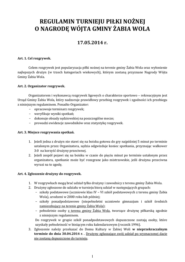 REGULAMIN TURNIEJU PIŁKI NOŻNEJ O NAGRODĘ WÓJTA GMINY ŻABIA WOLA 17.05.2014 r. Art. 1. Cel rozgrywek. Celem rozgrywek jest popularyzacja piłki nożnej na terenie gminy Żabia Wola oraz wyłonienie najlepszych drużyn (w trzech kategoriach wiekowych), którym zostaną przyznane Nagrody Wójta Gminy Żabia Wola. Art. 2. Organizator rozgrywek. Organizatorem i wykonawcą rozgrywek ligowych o charakterze sportowo – rekreacyjnym jest Urząd Gminy Żabia Wola, który nadzoruje prawidłowy przebieg rozgrywek i zgodności ich przebiegu z niniejszym regulaminem. Ponadto Organizator: opracowuje terminarz rozgrywek; weryfikuje wyniki spotkań; dokonuje obsady sędziowskiej na poszczególne mecze; prowadzi ewidencje zawodników oraz statystykę rozgrywek. Art. 3. Miejsce rozgrywania spotkań. 1. Jeżeli jedna z drużyn nie stawi się na boisku gotowa do gry najpóźniej 5 minut po terminie ustalonym przez Organizatora, sędzia odgwizduje koniec spotkania, przyznając walkower 3:0 na korzyść drużyny przeciwnej. 2. Jeżeli zespół pojawi się na boisku w czasie do pięciu minut po terminie ustalonym przez organizatora, spotkanie może być rozegrane jako mistrzowskie, jeśli drużyna przeciwna wyrazi na to zgodę. Art. 4. Zgłoszenie drużyny do rozgrywek. 1. W rozgrywkach mogą brać udział tylko drużyny i zawodnicy z terenu gminy Żabia Wola. 2. Drużyny zgłoszone do udziału w turnieju biorą udział w następujących grupach: szkoły podstawowe (uczniowie klas IV – VI szkół podstawowych z terenu gminy Żabia Wola), urodzeni w 2000 roku lub później; szkoły ponadpodstawowe (niepełnoletni uczniowie gimnazjum i szkół średnich zamieszkujący na terenie gminy Żabia Wola); pełnoletnie osoby z terenu gminy Żabia Wola, tworzące drużynę piłkarską zgodnie z niniejszym regulaminem. Do rozgrywek w grupie szkół ponadpodstawowych dopuszczone zostają osoby, które uzyskały pełnoletność w bieżącym roku kalendarzowym (rocznik 1996). 3. Zgłoszenie należy przekazać do Domu Kultury w Żabiej Woli w nieprzekraczalnym terminie do dnia 30.04.2014 r. . Drużyny zgłaszające swój udział po wyznaczonej dacie nie zostaną dopuszczone do turnieju. 1 4. Zgłoszenie drużyny powinno zawierać: dokładną nazwę drużyny; imię i nazwisko, adres korespondencyjny i numer telefonu kontaktowego opiekuna drużyny (osoby pełnoletniej); przedłożenie listy zawodników uprawnionych do gry. Art. 5. Zgłoszenie zawodników do gry. 1. Drużyna zgłoszona do zawodów może liczyć maksymalnie 12 zawodników. 2. W przypadku piłkarzy, którzy nie ukończyli 16 roku życia, do dnia rozpoczęcia rozgrywek 3. 4. 5. 6. 7. 8. 9. muszą oni przedłożyć pisemną zgodę obojga rodziców lub opiekunów prawnych na uczestnictwo w rozgrywkach. Pisemne zgłoszenie (wyłącznie na specjalnym druku dostępnym w formie załącznika) zawodników powinno zawierać ich dokładne dane, tzn. imię i nazwisko, datę urodzenia, adres zamieszkania, numer legitymacji szkolnej lub dowodu osobistego oraz własnoręczny podpis zawodnika. W przypadku zgłoszeń mailowych kapitan drużyny ma obowiązek weryfikacji składu drużyny u Organizatora przed rozpoczęciem rozgrywek, zaś każdy z zawodników musi złożyć własnoręczny podpis na karcie zgłoszeniowej. Zawodnika uznaje się za uprawnionego do gry w danym zespole, jeżeli jego nazwisko i imię figuruje na zbiorczej liście drużyny zgłoszonej do organu prowadzącego rozgrywki i złożonej u organizatora do dnia 30.04.2014 r. włącznie. Nie przewiduje się zmiany barw klubowych zawodników w trakcie rozgrywek. W przypadku ewentualnej zmiany drużyny przez zawodnika kapitan drużyny przejmującej ma obowiązek zgłosić taki fakt Organizatorowi oraz w obecności Reprezentanta Organizatora uzyskać zgodę kapitanów pozostałych drużyn, biorących udział w Turnieju w danej grupie wiekowej. Opiekunowie drużyn mają prawo wnieść protest dotyczący tożsamości zawodników innych zespołów. W razie jakichkolwiek wątpliwości odnośnie tożsamości zawodnika i jego uprawnień do gry w danym zespole, opiekun drużyny przeciwnej ma prawo zażądać dowodu tożsamości, który pozwoli stwierdzić obecność zawodnika w składzie danej drużyny oraz jego tożsamość. W przypadku nieokazania dowodu tożsamości zawodnik nie może brać udziału w danym spotkaniu. Protesty opiekunów odnośnie tożsamości zawodnika oraz niezgłoszenia go do gry w danej drużynie mogą być składane najpóźniej do końca spotkania lub do 15 minut po jego zakończeniu u sędziego prowadzącego zawody. W przypadku niewniesienia protestu w wyznaczonym czasie nie będzie on uwzględniony przez Organizatora. W przypadku stwierdzenia udziału w spotkaniu zawodnika niezgłoszonego do gry w danej drużynie zostaje orzeczony walkower na korzyść drużyny przeciwnej. Natomiast wszystkie poprzednie mecze z udziałem tego zawodnika (wpis w protokole) zostaną zweryfikowane jako walkowery na korzyść drużyn przeciwnych. Zgłoszenie zawodnika do udziału w Turnieju o Puchar Wójta Gminy Żabia Wola jest równoznaczne z wyrażeniem (przez niego lub – w przypadku osoby niepełnoletniej – przez opiekuna prawnego dziecka biorącego udział w rozgrywkach) zgody na publikację jego wizerunku oraz danych osobowych przez Dom Kultury w Żabiej Woli w dowolnym formacie i wszystkich mediach w czasie nieokreślonym. 2 Art. 6. Przepisy i zasady gry. W rozgrywkach gminnych o Nagrody Wójta gminy Żabia Wola obowiązują wybrane przepisy gry w piłkę nożną zespołów pięcioosobowych obowiązujące w Komisji ds. piłki nożnej pięcioosobowej przy Polskim Związku Piłki Nożnej oraz przepisy PZPN. 1. Mecze trwają 2x10 minut z 2-minutową przerwą pomiędzy połowami. 2. Zawodnik musi być upomniany żółtą kartką, jeśli popełni jedno z następujących 3. 4. 5. 6. 7. 8. 9. przewinień: jest winny niesportowego zachowania; słownie lub czynnie demonstruje swoje niezadowolenie; uporczywie n