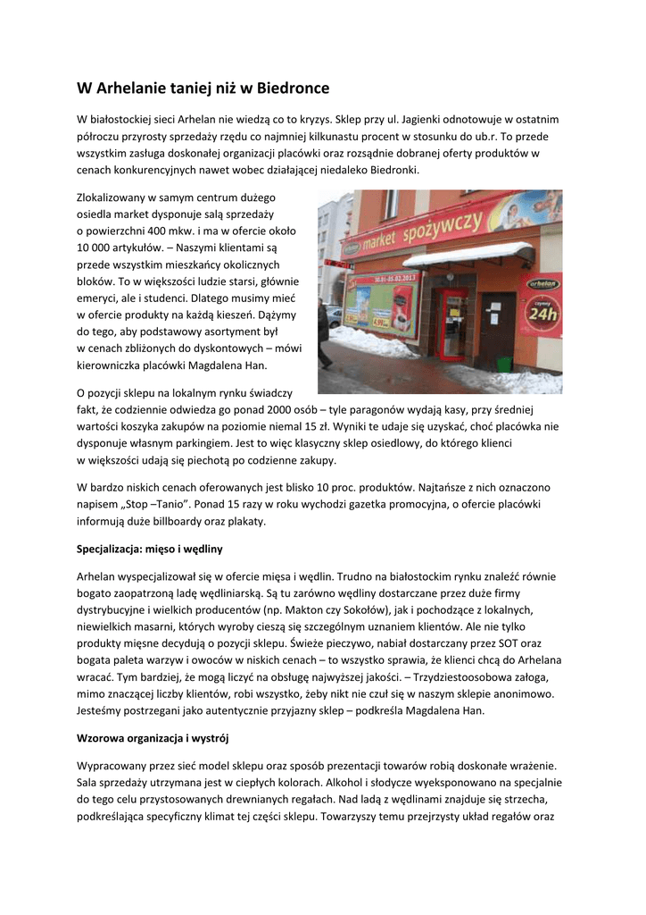 W Arhelanie taniej niż w Biedronce W białostockiej sieci Arhelan nie wiedzą co to kryzys. Sklep przy ul. Jagienki odnotowuje w ostatnim półroczu przyrosty sprzedaży rzędu co najmniej kilkunastu procent w stosunku do ub.r. To przede wszystkim zasługa doskonałej organizacji placówki oraz rozsądnie dobranej oferty produktów w cenach konkurencyjnych nawet wobec działającej niedaleko Biedronki. Zlokalizowany w samym centrum dużego osiedla market dysponuje salą sprzedaży o powierzchni 400 mkw. i ma w ofercie około 10 000 artykułów. – Naszymi klientami są przede wszystkim mieszkańcy okolicznych bloków. To w większości ludzie starsi, głównie emeryci, ale i studenci. Dlatego musimy mieć w ofercie produkty na każdą kieszeń. Dążymy do tego, aby podstawowy asortyment był w cenach zbliżonych do dyskontowych – mówi kierowniczka placówki Magdalena Han. O pozycji sklepu na lokalnym rynku świadczy fakt, że codziennie odwiedza go ponad 2000 osób – tyle paragonów wydają kasy, przy średniej wartości koszyka zakupów na poziomie niemal 15 zł. Wyniki te udaje się uzyskać, choć placówka nie dysponuje własnym parkingiem. Jest to więc klasyczny sklep osiedlowy, do którego klienci w większości udają się piechotą po codzienne zakupy. W bardzo niskich cenach oferowanych jest blisko 10 proc. produktów. Najtańsze z nich oznaczono napisem „Stop –Tanio”. Ponad 15 razy w roku wychodzi gazetka promocyjna, o ofercie placówki informują duże billboardy oraz plakaty. Specjalizacja: mięso i wędliny Arhelan wyspecjalizował się w ofercie mięsa i wędlin. Trudno na białostockim rynku znaleźć równie bogato zaopatrzoną ladę wędliniarską. Są tu zarówno wędliny dostarczane przez duże firmy dystrybucyjne i wielkich producentów (np. Makton czy Sokołów), jak i pochodzące z lokalnych, niewielkich masarni, których wyroby cieszą się szczególnym uznaniem klientów. Ale nie tylko produkty mięsne decydują o pozycji sklepu. Świeże pieczywo, nabiał dostarczany przez SOT oraz bogata paleta warzyw i owoców w niskich cenach – to wszystko sprawia, że klienci chcą do Arhelana wracać. Tym bardziej, że mogą liczyć na obsługę najwyższej jakości. – Trzydziestoosobowa załoga, mimo znaczącej liczby klientów, robi wszystko, żeby nikt nie czuł się w naszym sklepie anonimowo. Jesteśmy postrzegani jako autentycznie przyjazny sklep – podkreśla Magdalena Han. Wzorowa organizacja i wystrój Wypracowany przez sieć model sklepu oraz sposób prezentacji towarów robią doskonałe wrażenie. Sala sprzedaży utrzymana jest w ciepłych kolorach. Alkohol i słodycze wyeksponowano na specjalnie do tego celu przystosowanych drewnianych regałach. Nad ladą z wędlinami znajduje się strzecha, podkreślająca specyficzny klimat tej części sklepu. Towarzyszy temu przejrzysty układ regałów oraz półki budowane z planogramem w ręku. Magdalena Han podkreśla, że doskonały efekt końcowy jest rezultatem świetnej współpracy kierownika regionalnego sieci z osobami zarządzającymi placówką. Arhelan w Białymstoku jest sklepem całodobowym. Nie oznacza to jednak, że nocą główny produkt poszukiwany przez klientów to alkohol. W późnych godzinach wieczornych zwykłe zakupy spożywcze robią tu ludzie, którzy pracują w systemie zmianowym – nie brakuje np. załóg karetek pogotowia czy policjantów. – Trzydziestoosobowa załoga, mimo znaczącej liczby klientów, robi wszystko, żeby nikt nie czuł się u nas anonimowo – podkreśla Magdalena Han, kierowniczka sklepu Arhelan w Białymstoku Doskonale doświetlona lada z mięsem i wędlinami W białostockim Arhelanie nawet nocą ruch nie ustaje Jabłka można tu kupić najtaniej w mieście – po 1,49 zł za kilogram Przyjazny wystrój i oświetlenie przyciągają klientów Witold Nartowski