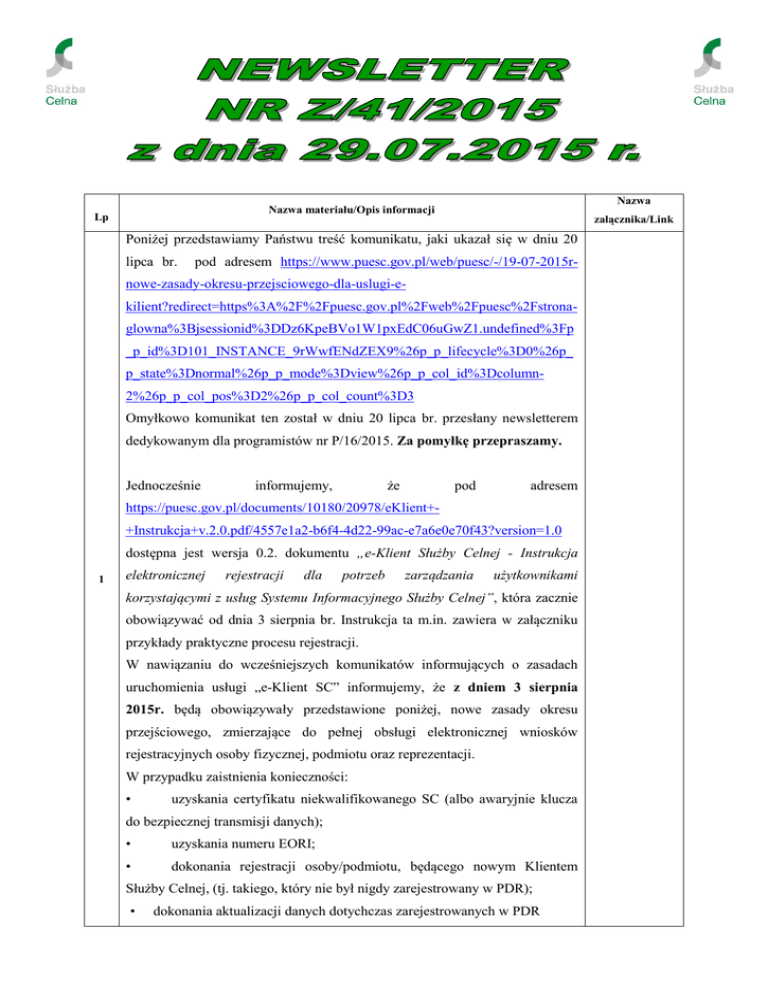 Nazwa Nazwa materiału/Opis informacji Lp załącznika/Link Poniżej przedstawiamy Państwu treść komunikatu, jaki ukazał się w dniu 20 lipca br. pod adresem https://www.puesc.gov.pl/web/puesc/-/19-07-2015r- nowe-zasady-okresu-przejsciowego-dla-uslugi-ekilient?redirect=https%3A%2F%2Fpuesc.gov.pl%2Fweb%2Fpuesc%2Fstronaglowna%3Bjsessionid%3DDz6KpeBVo1W1pxEdC06uGwZ1.undefined%3Fp _p_id%3D101_INSTANCE_9rWwfENdZEX9%26p_p_lifecycle%3D0%26p_ p_state%3Dnormal%26p_p_mode%3Dview%26p_p_col_id%3Dcolumn2%26p_p_col_pos%3D2%26p_p_col_count%3D3 Omyłkowo komunikat ten został w dniu 20 lipca br. przesłany newsletterem dedykowanym dla programistów nr P/16/2015. Za pomyłkę przepraszamy. Jednocześnie informujemy, że pod adresem https://puesc.gov.pl/documents/10180/20978/eKlient++Instrukcja+v.2.0.pdf/4557e1a2-b6f4-4d22-99ac-e7a6e0e70f43?version=1.0 dostępna jest wersja 0.2. dokumentu „e-Klient Służby Celnej - Instrukcja 1 elektronicznej rejestracji dla potrzeb zarządzania użytkownikami korzystającymi z usług Systemu Informacyjnego Służby Celnej”, która zacznie obowiązywać od dnia 3 sierpnia br. Instrukcja ta m.in. zawiera w załączniku przykłady praktyczne procesu rejestracji. W nawiązaniu do wcześniejszych komunikatów informujących o zasadach uruchomienia usługi „e-Klient SC” informujemy, że z dniem 3 sierpnia 2015r. będą obowiązywały przedstawione poniżej, nowe zasady okresu przejściowego, zmierzające do pełnej obsługi elektronicznej wniosków rejestracyjnych osoby fizycznej, podmiotu oraz reprezentacji. W przypadku zaistnienia konieczności: • uzyskania certyfikatu niekwalifikowanego SC (albo awaryjnie klucza do bezpiecznej transmisji danych); • uzyskania numeru EORI; • dokonania rejestracji osoby/podmiotu, będącego nowym Klientem Służby Celnej, (tj. takiego, który nie był nigdy zarejestrowany w PDR); • dokonania aktualizacji danych dotychczas zarejestrowanych w PDR od dnia 3 sierpnia 2015r. należy postępować zgodnie z zasadami określonymi w dokumencie „e-Klient Służby Celnej - Instrukcja elektronicznej rejestracji dla potrzeb zarządzania użytkownikami korzystającymi z usług Systemu Informacyjnego Służby Celnej” (Instrukcji eKlient SC). Jedynie osoby zobowiązane do dokonywania zgłoszeń INTRASTAT, posiadające siedzibę poza terytorium Polski, które nie korzystają z usług polskich przedstawicieli oraz ich reprezentanci mogą dokonywać rejestracji na zasadach określonych w dotychczasowej Instrukcji PDR (Instrukcji nadania kodu identyfikacyjnego (loginu), uzyskania klucza do bezpiecznej transmisji danych oraz rejestracji osób i podmiotów gospodarczych w Podsystemie Danych Referencyjnych (PDR) dla celów przesyłania elektronicznych zgłoszeń i pozostałych dokumentów do Systemów Celnych: CELINA, ECS, ICS oraz INTRASTAT). UWAGA! Od dnia 3 sierpnia 2015r. zaprzestaje się dokonywania aktualizacji danych na zasadach określonych w Instrukcji PDR obowiązującej przed dniem uruchomienia usługi e-Klient SC. W ramach usługi e-Klient SC możliwe jest uzyskanie certyfikatu niekwalifikowanego SC (niekwalifikowany podpis elektroniczny, który zastępuje dotychczas wydawane klucze do bezpiecznej transmisji danych). W przypadku konieczności uzyskania niekwalifikowanego podpisu elektronicznego dla potrzeb uwierzytelniania w ramach usług świadczonych przez Służbę Celną bądź w sytuacji upływu ważności klucza do bezpiecznej transmisji danych należy: • założyć konto na PUESC, • dokonać rejestracji w Systemie Informacyjnym Służby Celnej (postępując zgodnie z Instrukcją e-Klient SC) bądź powiązania danych (dotyczy klientów dotychczas zarejestrowanych w systemach celnych), • pobrać certyfikat niekwalifikowany SC (postępując zgodnie z Instrukcją postępowania w celu uzyskania certyfikatu niekwalifikowanego SC, dostępną na PUESC w zakładce „Systemy Służby Celnej” > „PKI”. UWAGA! W przypadku niedostępności usługi wydawania certyfikatu niekwalifikowanego SC za pośrednictwem PUESC (awaria) w okresie przejściowym możliwe jest, ze względu na konieczność zapewnienia prawidłowej obsługi w obecnie działających systemach informatycznych Służby Celnej, wnioskowanie o wydanie klucza do bezpiecznej transmisji danych. W tym celu należy: • założyć konto na PUESC, • dokonać rejestracji w SISC (postępując zgodnie z Instrukcją e-Klient SC) bądź powiązania danych (dotyczy klientów dotychczas zarejestrowanych w systemach celnych), • złożyć elektroniczny wniosek o wydanie klucza do bezpiecznej transmisji danych na stronach CBTD www.e-clo.pl >CBT, • po otrzymaniu wiadomości elektronicznej z CBTD przesłanej na adres email podany we wniosku należy zainstalować klucz w magazynie certyfikatów. Osoby, które od dnia 3 sierpnia 2015 r. uzyskały certyfikat niekwalifikowany SC (lub, w przypadku niedostępności usługi, uzyskały klucz do bezpiecznej transmisji danych), którym zamierzają się posługiwać przy sporządzaniu elektronicznych dokumentów przesyłanych do Systemów Celnych, wypełniają „Oświadczenie bezpieczeństwa – certyfikat” będące załącznikiem do niniejszego komunikatu. Dokument ten należy: • wydrukować, wypełnić (lub wydrukować wypełniony), podpisać, zeskanować i wysłać elektronicznie na adres poczty elektronicznej Wydziału Centralnej Rejestracji Izby Celnej w Poznaniu: [email protected], lub • wydrukować, wypełnić (lub wydrukować wypełniony), podpisać i złożyć w najbliższej jednostce Służby Celnej, gdzie po zeskanowaniu zostanie on przesłany do Wydziału Centralnej Rejestracji Izby Celnej w Poznaniu, lub • w przypadku, gdy z innych przyczyn składany jest wniosek o rejestrację, aktualizację lub dezaktywację danych osoby fizycznej w SISC, wypełnione „Oświadczenie bezpieczeństwa – certyfikat” można dołączyć do wniosku jako załącznik i podpisać podpisem elektronicznym. UWAGA! Korzystanie z System