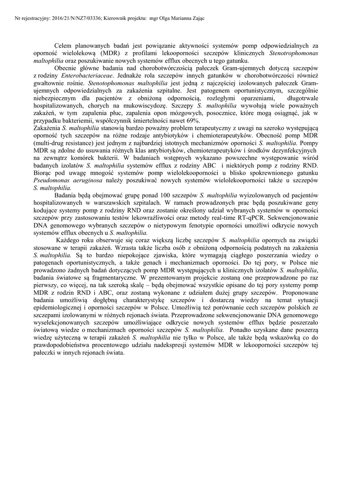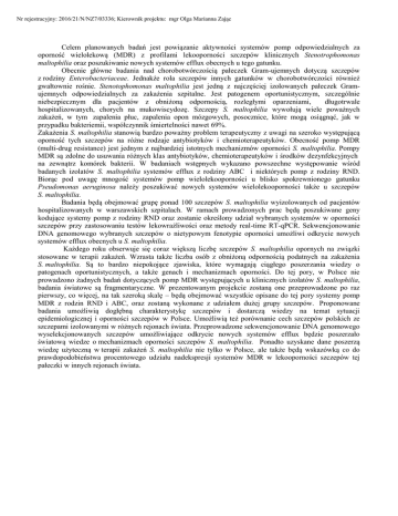 Nr rejestracyjny: 2016/21/N/NZ7/03336; Kierownik projektu: mgr Olga Marianna Zając Celem planowanych badań jest powiązanie aktywności systemów pomp odpowiedzialnych za oporność wielolekową (MDR) z profilami lekooporności szczepów klinicznych Stenotrophomonas maltophilia oraz poszukiwanie nowych systemów efflux obecnych u tego gatunku. Obecnie główne badania nad chorobotwórczością pałeczek Gram-ujemnych dotyczą szczepów z rodziny Enterobacteriaceae. Jednakże rola szczepów innych gatunków w chorobotwórczości również gwałtownie rośnie. Stenotophomonas maltophilia jest jedną z najczęściej izolowanych pałeczek Gramujemnych odpowiedzialnych za zakażenia szpitalne. Jest patogenem oportunistycznym, szczególnie niebezpiecznym dla pacjentów z obniżoną odpornością, rozległymi oparzeniami, długotrwale hospitalizowanych, chorych na mukowiscydozę. Szczepy S. maltophilia wywołują wiele poważnych zakażeń, w tym zapalenia płuc, zapalenia opon mózgowych, posocznice, które mogą osiągnąć, jak w przypadku bakteriemii, współczynnik śmiertelności nawet 69%. Zakażenia S. maltophilia stanowią bardzo poważny problem terapeutyczny z uwagi na szeroko występującą oporność tych szczepów na różne rodzaje antybiotyków i chemioterapeutyków. Obecność pomp MDR (multi-drug resistance) jest jednym z najbardziej istotnych mechanizmów oporności S. maltophilia. Pompy MDR są zdolne do usuwania różnych klas antybiotyków, chemioterapeutyków i środków dezynfekcyjnych na zewnątrz komórek bakterii. W badaniach wstępnych wykazano powszechne występowanie wśród badanych izolatów S. maltophilia systemów efflux z rodziny ABC i niektórych pomp z rodziny RND. Biorąc pod uwagę mnogość systemów pomp wielolekooporności u blisko spokrewnionego gatunku Pseudomonas aeruginosa należy poszukiwać nowych systemów wielolekooporności także u szczepów S. maltophilia. Badania będą obejmować grupę ponad 100 szczepów S. maltophilia wyizolowanych od pacjentów hospitalizowanych w warszawskich szpitalach. W ramach prowadzonych prac będą poszukiwane geny kodujące systemy pomp z rodziny RND oraz zostanie określony udział wybranych systemów w oporności szczepów przy zastosowaniu testów lekowrażliwości oraz metody real-time RT-qPCR. Sekwencjonowanie DNA genomowego wybranych szczepów o nietypowym fenotypie oporności umożliwi odkrycie nowych systemów efflux obecnych u S. maltophilia. Każdego roku obserwuje się coraz większą liczbę szczepów S. maltophilia opornych na związki stosowane w terapii zakażeń. Wzrasta także liczba osób z obniżoną odpornością podatnych na zakażenia S. maltophilia. Są to bardzo niepokojące zjawiska, które wymagają ciągłego poszerzania wiedzy o patogenach oportunistycznych, a także genach i mechanizmach oporności. Do tej pory, w Polsce nie prowadzono żadnych badań dotyczących pomp MDR występujących u klinicznych izolatów S. maltophilia, badania światowe są fragmentaryczne. W prezentowanym projekcie zostaną one przeprowadzone po raz pierwszy, co więcej, na tak szeroką skalę – będą obejmować wszystkie opisane do tej pory systemy pomp MDR z rodzin RND i ABC, oraz zostaną wykonane z udziałem dużej grupy szczepów. Proponowane badania umożliwią dogłębną charakterystykę szczepów i dostarczą wiedzy na temat sytuacji epidemiologicznej i oporności szczepów w Polsce. Umożliwią też porównanie cech szczepów polskich ze szczepami izolowanymi w różnych rejonach świata. Przeprowadzone sekwencjonowanie DNA genomowego wyselekcjonowanych szczepów umożliwiające odkrycie nowych systemów efflux będzie poszerzało światową wiedze o mechanizmach oporności szczepów S. maltophilia. Ponadto uzyskane dane poszerzą wiedzę użyteczną w terapii zakażeń S. maltophilia nie tylko w Polsce, ale także będą wskazówką co do prawdopodobieństwa procentowego udziału nadekspresji systemów MDR w lekooporności szczepów tej pałeczki w innych rejonach świata.