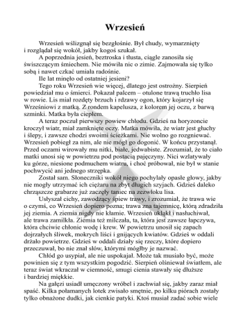 Wrzesień Wrzesień wślizgnął się bezgłośnie. Był chudy, wymarznięty i rozglądał się wokół, jakby kogoś szukał. A poprzednia jesień, beztroska i tłusta, ciągle zanosiła się świszczącym śmiechem. Nie mówiła nic o zimie. Zajmowała się tylko sobą i nawet czkać umiała radośnie. Ile lat minęło od ostatniej jesieni? Tego roku Wrzesień wie więcej, dlatego jest ostrożny. Sierpień powiedział mu o śmierci. Pokazał palcem – otulone trawą truchło lisa w rowie. Lis miał rozdęty brzuch i rdzawy ogon, który kojarzył się Wrześniowi z matką. Z rondem kapelusza, z kolorem jej oczu, z barwą szminki. Matka była ciepłem. A teraz poczuł pierwszy powiew chłodu. Gdzieś na horyzoncie kroczył wiatr, miał zamknięte oczy. Matka mówiła, że wiatr jest głuchy i ślepy, i zawsze chodzi swoimi ścieżkami. Nie wolno go rozgniewać. Wrzesień pobiegł za nim, ale nie mógł go dogonić. W końcu przystanął. Przed oczami wirowały mu nitki, białe, jedwabiste. Zrozumiał, że to ciało matki unosi się w powietrzu pod postacią pajęczyny. Nici wzlatywały ku górze, niesione podmuchem wiatru, i choć próbował, nie był w stanie pochwycić ani jednego strzępka. Został sam. Słoneczniki wokół niego pochylały opasłe głowy, jakby nie mogły utrzymać ich ciężaru na zbyt długich szyjach. Gdzieś daleko chrząszcze grabarze już zaczęły taniec na zezwłoku lisa. Usłyszał cichy, zawodzący śpiew trawy, i zrozumiał, że trawa wie o czymś, co Wrzesień dopiero pozna; trawa zna tajemnicę, którą zdradziła jej ziemia. A ziemia nigdy nie kłamie. Wrzesień ukląkł i nasłuchiwał, ale trawa zamilkła. Ziemia też milczała, ta, która jest zawsze łapczywa, która chciwie chłonie wodę i krew. W powietrzu unosił się zapach dojrzałych śliwek, mokrych liści i gnijących kwiatów. Gdzieś w oddali drżało powietrze. Gdzieś w oddali działy się rzeczy, które dopiero przeczuwał, bo nie znał słów, którymi mógłby je nazwać. Chłód go usypiał, ale nie uspokajał. Może tak musiało być, może powinien się z tym wszystkim pogodzić. Sierpień olśniewał światłem, ale teraz świat wkraczał w ciemność, smugi cienia stawały się dłuższe i bardziej miękkie. Na gałęzi usiadł umęczony wróbel i zachwiał się, jakby zaraz miał spaść. Kilka połamanych lotek zwisało smętnie, po kilku piórach zostały tylko obnażone dudki, jak cienkie patyki. Ktoś musiał zadać sobie wiele trudu, próbując złapać wróbla. Potem wyrywał pióra jedno po drugim, a małe życie nie przestawało się szamotać. Jak głośno bije takie drobne serce? Katem mógł być każdy odrobinę większy od wróbla. Katem mógł być każdy, kto się nudził i chciał wypełnić nudę cudzym cierpieniem. Wtem usłyszał dźwięk i przez chwilę nie wiedział, czy to gdzieś nieopodal biją dzwony, czy z oddali niesie się huk wybuchających bomb. Trawa zaszumiała i znów zaczęła śpiewać: o spękanej ziemi, która wkrótce nasyci się krwią. O suchej ziemi, która wkrótce nasyci się czerwienią i pozostanie wilgotna przez lata. O ludziach, których otuli ziemia. Chciał policzyć, ile dni mu zostało. Ale niestety, jak to z miesiącami bywa – nie miał palców.