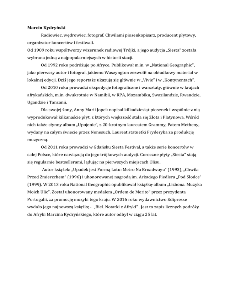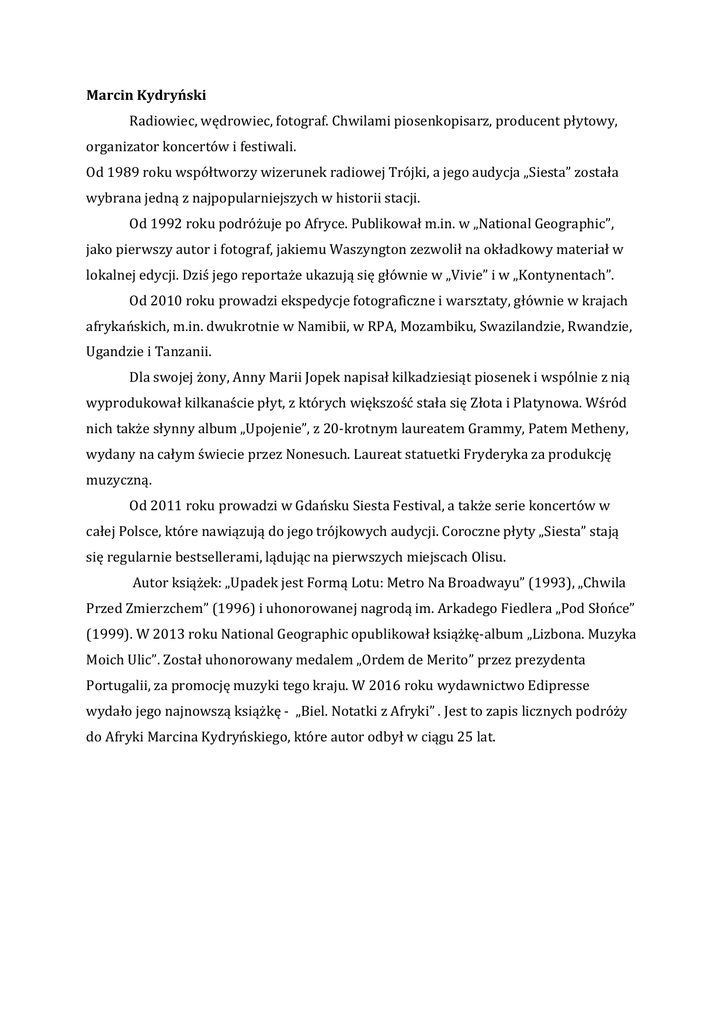 MarcinKydryński Radiowiec,wędrowiec,fotograf.Chwilamipiosenkopisarz,producentpłytowy, organizatorkoncertówifestiwali. Od1989rokuwspółtworzywizerunekradiowejTrójki,ajegoaudycja„Siesta”została wybranajednąznajpopularniejszychwhistoriistacji. Od1992rokupodróżujepoAfryce.Publikowałm.in.w„NationalGeographic”, jakopierwszyautorifotograf,jakiemuWaszyngtonzezwoliłnaokładkowymateriałw lokalnejedycji.Dziśjegoreportażeukazująsięgłówniew„Vivie”iw„Kontynentach”. Od2010rokuprowadziekspedycjefotograficzneiwarsztaty,główniewkrajach afrykańskich,m.in.dwukrotniewNamibii,wRPA,Mozambiku,Swazilandzie,Rwandzie, UgandzieiTanzanii. Dlaswojejżony,AnnyMariiJopeknapisałkilkadziesiątpiosenekiwspólnieznią wyprodukowałkilkanaściepłyt,zktórychwiększośćstałasięZłotaiPlatynowa.Wśród nichtakżesłynnyalbum„Upojenie”,z20-krotnymlaureatemGrammy,PatemMetheny, wydanynacałymświecieprzezNonesuch.LaureatstatuetkiFryderykazaprodukcję muzyczną. Od2011rokuprowadziwGdańskuSiestaFestival,atakżeseriekoncertóww całejPolsce,którenawiązujądojegotrójkowychaudycji.Corocznepłyty„Siesta”stają sięregularniebestsellerami,lądującnapierwszychmiejscachOlisu. Autorksiążek:„UpadekjestFormąLotu:MetroNaBroadwayu”(1993),„Chwila PrzedZmierzchem”(1996)iuhonorowanejnagrodąim.ArkadegoFiedlera„PodSłońce” (1999).W2013rokuNationalGeographicopublikowałksiążkę-album„Lizbona.Muzyka MoichUlic”.Zostałuhonorowanymedalem„OrdemdeMerito”przezprezydenta Portugalii,zapromocjęmuzykitegokraju.W2016rokuwydawnictwoEdipresse wydałojegonajnowsząksiążkę-„Biel.NotatkizAfryki”.Jesttozapislicznychpodróży doAfrykiMarcinaKydryńskiego,któreautorodbyłwciągu25lat.