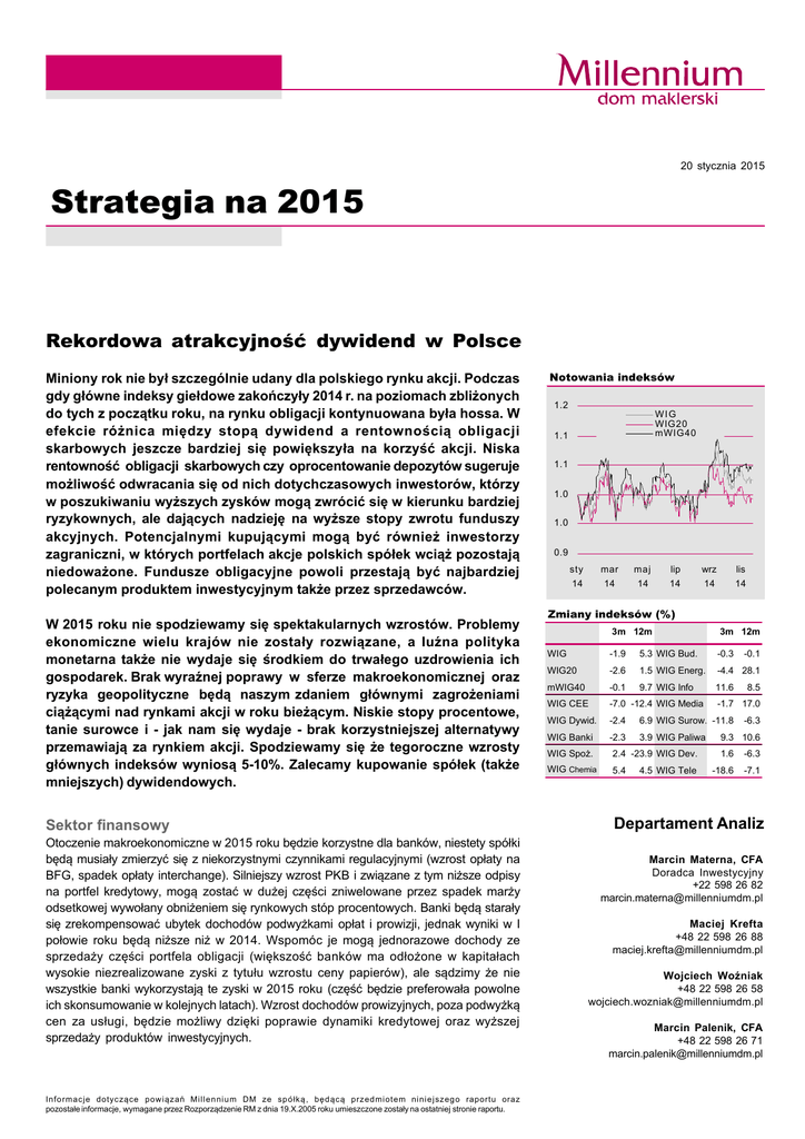 20 stycznia 2015 Strategia na 2015 Rekordowa atrakcyjność dywidend w Polsce Miniony rok nie był szczeg•lnie udany dla polskiego rynku akcji. Podczas gdy gł•wne indeksy giełdowe zakończyły 2014 r. na poziomach zbliżonych do tych z początku roku, na rynku obligacji kontynuowana była hossa. W efekcie r•żnica między stopą dywidend a rentownością obligacji skarbowych jeszcze bardziej się powiększyła na korzyść akcji. Niska rentowność obligacji skarbowych czy oprocentowanie depozyt•w sugeruje możliwość odwracania się od nich dotychczasowych inwestor•w, kt•rzy w poszukiwaniu wyższych zysk•w mogą zwr•cić się w kierunku bardziej ryzykownych, ale dających nadzieję na wyższe stopy zwrotu funduszy akcyjnych. Potencjalnymi kupującymi mogą być r•wnież inwestorzy zagraniczni, w kt•rych portfelach akcje polskich sp•łek wciąż pozostają niedoważone. Fundusze obligacyjne powoli przestają być najbardziej polecanym produktem inwestycyjnym także przez sprzedawc•w. W 2015 roku nie spodziewamy się spektakularnych wzrost•w. Problemy ekonomiczne wielu kraj•w nie zostały rozwiązane, a luźna polityka monetarna także nie wydaje się środkiem do trwałego uzdrowienia ich gospodarek. Brak wyraźnej poprawy w sferze makroekonomicznej oraz ryzyka geopolityczne będą naszym zdaniem gł•wnymi zagrożeniami ciążącymi nad rynkami akcji w roku bieżącym. Niskie stopy procentowe, tanie surowce i - jak nam się wydaje - brak korzystniejszej alternatywy przemawiają za rynkiem akcji. Spodziewamy się że tegoroczne wzrosty gł•wnych indeks•w wyniosą 5-10%. Zalecamy kupowanie sp•łek (także mniejszych) dywidendowych. Sektor finansowy Otoczenie makroekonomiczne w 2015 roku będzie korzystne dla bank‚w, niestety sp‚łki będą musiały zmierzyć się z niekorzystnymi czynnikami regulacyjnymi (wzrost opłaty na BFG, spadek opłaty interchange). Silniejszy wzrost PKB i związane z tym niższe odpisy na portfel kredytowy, mogą zostać w dużej części zniwelowane przez spadek marży odsetkowej wywołany obniżeniem się rynkowych st‚p procentowych. Banki będą starały się zrekompensować ubytek dochod‚w podwyżkami opłat i prowizji, jednak wyniki w I połowie roku będą niższe niż w 2014. Wspom‚c je mogą jednorazowe dochody ze sprzedaży części portfela obligacji (większość bank‚w ma odłożone w kapitałach wysokie niezrealizowane zyski z tytułu wzrostu ceny papier‚w), ale sądzimy że nie wszystkie banki wykorzystają te zyski w 2015 roku (część będzie preferowała powolne ich skonsumowanie w kolejnych latach). Wzrost dochod‚w prowizyjnych, poza podwyżką cen za usługi, będzie możliwy dzięki poprawie dynamiki kredytowej oraz wyższej sprzedaży produkt‚w inwestycyjnych. Informacje dotyczące powiązań Millennium DM ze sp‚łką, będącą przedmiotem niniejszego raportu oraz pozostałe informacje, wymagane przez Rozporządzenie RM z dnia 19.X.2005 roku umieszczone zostały na ostatniej stronie raportu. Notowania indeks‚w 1.2 WIG WIG20 mWIG40 1.1 1.1 1.0 1.0 0.9 sty mar maj lip wrz lis 14 14 14 14 14 14 Zmiany indeks‚w (%) 3m 12m 3m 12m WIG -1.9 5.3 WIG Bud. -0.3 WIG20 -2.6 1.5 WIG Energ. -4.4 28.1 mWIG40 -0.1 9.7 WIG Info 11.6 WIG CEE -7.0 -12.4 WIG Media WIG Dywid. -2.4 6.9 WIG Surow. -11.8 WIG Banki -2.3 3.9 WIG Paliwa WIG Spoż. 2.4 -23.9 WIG Dev. WIG Chemia 5.4 4.5 WIG Tele -0.1 8.5 -1.7 17.0 -6.3 9.3 10.6 1.6 -6.3 -18.6 -7.1 Departament Analiz Marcin Materna, CFA Doradca Inwestycyjny +22 598 26 82 [email protected] Maciej Krefta +48 22 598 26 88 [email protected] Wojciech Woźniak +48 22 598 26 58 [email protected] Marcin Palenik, CFA +48 22 598 26 71 [email protected] Obecnie sp‚łki są notowane przy średnim wskaźniku P/E wysokości 15.0 czyli stosunkowo wysoko na tle notowań bank‚w zagranicznych. Naszym zdaniem poprawa koniunktury może zwiększyć zainteresowanie bardziej ryzykownymi bankami, charakteryzującymi się wyższymi dynamikami wolumen‚w, ale jednocześnie niższą dywidendą, jednak ta pozostaje ważnym czynnikiem dla potencjalnego zwrotu z inwestycji w walory sp‚łek. Naszym zdaniem najlepszą ekspozycją na wzrost wolumen‚w w sektorze będzie mBank i Alior Bank (w przypadku tego podmiotu niewykluczona jest gra pod przejęcia). Większego zainteresowania dużymi bankami spodziewamy się w okresie przyznawania prawa do dywidend. Stąd nasze pozytywne rekomendacje Pekao, Bank Handlowy i PZU. Handel detaliczny i dystrybucja Bieżący rok nie powinien być zbyt udany dla akcji najważniejszych sp‚łek detalicznych - LPP oraz CCC. Obie sp‚łki będą poprawiać zyski wolniej niż można było wcześniej oczekiwać, co w por‚wnaniu z wysokimi wskaźnikami C/Z nie daje potencjału wzrostu kurs‚w. Wolimy akcje CCC, choć nowa powierzchnia powinna przyrastać istotnie wolniej niż sp‚łka zapowiada (tak jak to było w zeszłym roku). Uważamy, że wpływ wydarzeń w Rosji i na Ukrainie odbije się na wynikach LPP tego roku w większym stopniu niż w roku ubiegłym i czynnik ten nadal jest niedoceniany. Konsument w Rosji jeszcze p‚ł roku temu był pełen optymizmu, teraz prawdopodobnie kraj wchodzi w silną recesję (co musi wpłynąć na konsumpcję). Częściowo wymuszony wzrost w innych krajach nie będzie aż tak dochodowy jak to było w Rosji. Zdecydowanie wolimy sektor dystrybutor‚w IT, kt‚ry r‚wnież korzysta ze wzrostu popytu konsumpcyjnego w Polsce. Sp‚łki z tego sektora powinny kontynuować poprawę wynik‚w, a ryzyko negatywnych niespodzianek nie jest naszym zdaniem duże (opr‚cz sp‚łki ABC Data, kt‚rej podwyższone ryzyko jest odzwierciedlone w niższych wskaźnikach). Sektor spożywczy W branży spożywczej oczekujemy niewielkiej zmiany zysk‚w r/r wśr‚d pokrywanych sp‚łek. Największą potencjalnie pozytywną niespodzianką mogą się okazać akcje Tarczyńskiego, kt‚ry w tym roku będzie zwiększać produkcję dzi