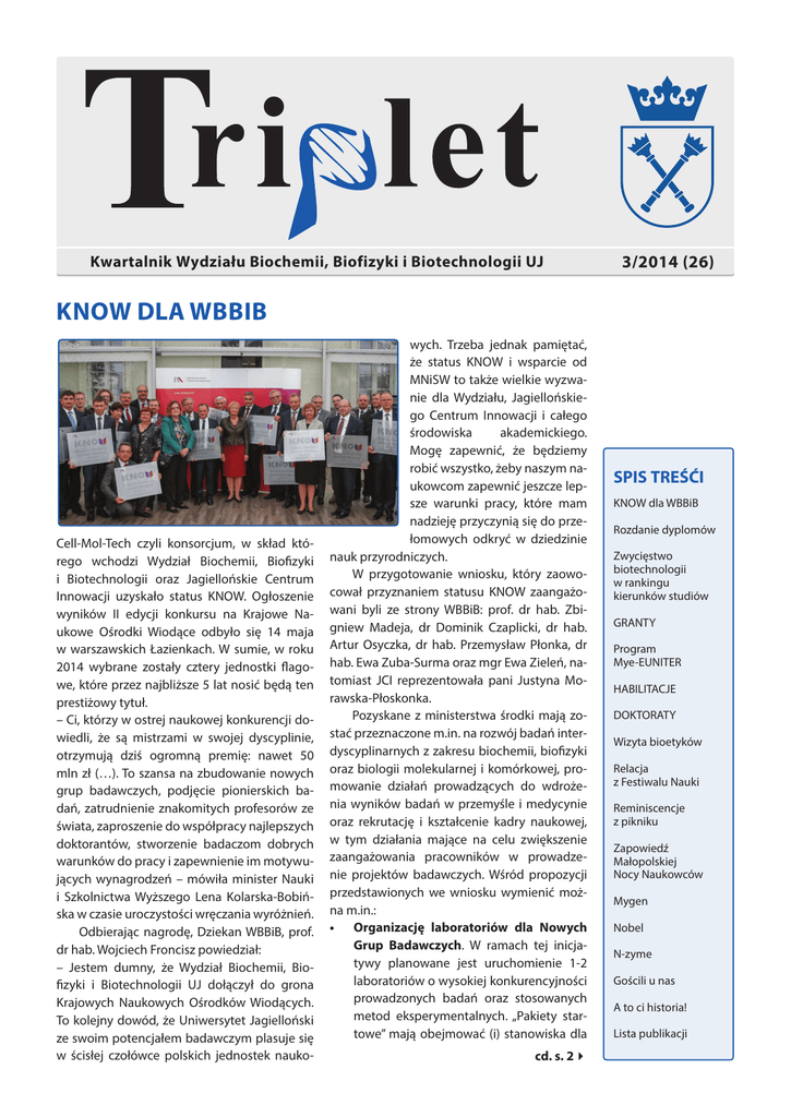Kwartalnik Wydziału Biochemii, Biofizyki i Biotechnologii UJ 3/2014 (26) KNOW dla WBBiB Cell-Mol-Tech czyli konsorcjum, w skład którego wchodzi Wydział Biochemii, Biofizyki i Biotechnologii oraz Jagiellońskie Centrum Innowacji uzyskało status KNOW. Ogłoszenie wyników II edycji konkursu na Krajowe Naukowe Ośrodki Wiodące odbyło się 14 maja w warszawskich Łazienkach. W sumie, w roku 2014 wybrane zostały cztery jednostki flagowe, które przez najbliższe 5 lat nosić będą ten prestiżowy tytuł. – Ci, którzy w ostrej naukowej konkurencji dowiedli, że są mistrzami w swojej dyscyplinie, otrzymują dziś ogromną premię: nawet 50 mln zł (…). To szansa na zbudowanie nowych grup badawczych, podjęcie pionierskich badań, zatrudnienie znakomitych profesorów ze świata, zaproszenie do współpracy najlepszych doktorantów, stworzenie badaczom dobrych warunków do pracy i zapewnienie im motywujących wynagrodzeń – mówiła minister Nauki i Szkolnictwa Wyższego Lena Kolarska-Bobińska w czasie uroczystości wręczania wyróżnień. Odbierając nagrodę, Dziekan WBBiB, prof. dr hab. Wojciech Froncisz powiedział: – Jestem dumny, że Wydział Biochemii, Biofizyki i Biotechnologii UJ dołączył do grona Krajowych Naukowych Ośrodków Wiodących. To kolejny dowód, że Uniwersytet Jagielloński ze swoim potencjałem badawczym plasuje się w ścisłej czołówce polskich jednostek nauko- wych. Trzeba jednak pamiętać, że status KNOW i wsparcie od MNiSW to także wielkie wyzwanie dla Wydziału, Jagiellońskiego Centrum Innowacji i całego środowiska akademickiego. Mogę zapewnić, że będziemy robić wszystko, żeby naszym naukowcom zapewnić jeszcze lepsze warunki pracy, które mam nadzieję przyczynią się do przełomowych odkryć w dziedzinie nauk przyrodniczych. W przygotowanie wniosku, który zaowocował przyznaniem statusu KNOW zaangażowani byli ze strony WBBiB: prof. dr hab. Zbigniew Madeja, dr Dominik Czaplicki, dr hab. Artur Osyczka, dr hab. Przemysław Płonka, dr hab. Ewa Zuba-Surma oraz mgr Ewa Zieleń, natomiast JCI reprezentowała pani Justyna Morawska-Płoskonka. Pozyskane z ministerstwa środki mają zostać przeznaczone m.in. na rozwój badań interdyscyplinarnych z zakresu biochemii, biofizyki oraz biologii molekularnej i komórkowej, promowanie działań prowadzących do wdrożenia wyników badań w przemyśle i medycynie oraz rekrutację i kształcenie kadry naukowej, w tym działania mające na celu zwiększenie zaangażowania pracowników w prowadzenie projektów badawczych. Wśród propozycji przedstawionych we wniosku wymienić można m.in.: • Organizację laboratoriów dla Nowych Grup Badawczych. W ramach tej inicjatywy planowane jest uruchomienie 1-2 laboratoriów o wysokiej konkurencyjności prowadzonych badań oraz stosowanych metod eksperymentalnych. „Pakiety startowe” mają obejmować (i) stanowiska dla cd. s. 24 SPIS TREŚĆI KNOW dla WBBiB Rozdanie dyplomów Zwycięstwo biotechnologii w rankingu kierunków studiów GRANTY Program Mye-EUNITER HABILITACJE DOKTORATY Wizyta bioetyków Relacja z Festiwalu Nauki Reminiscencje z pikniku Zapowiedź Małopolskiej Nocy Naukowców Mygen Nobel N-zyme Gościli u nas A to ci historia! Lista publikacji 4 KNOW dla WBBiB cd. ze s. 2 • liderów grup, (ii) stanowiska dla 1-2 badaczy w ramach każdej tworzonej NGB oraz (iii) nową przestrzeń laboratoryjną (na terenie JCI). Działania promujące zaangażowanie naukowców w projekty badawcze, w szczególności wysokiego ryzyka i aplikacyjne. W planach jest m.in. stworzenie (i) „subsydiów projakościowych” w postaci dodatków motywacyjnych dla pracowników o najwyższych parametrycznych osiągnięciach naukowych; (ii) wprowadzenie „ulgi dydaktycznej”, czyli obniżenie obligatoryjnego pensum dydaktycznego dla pracowników zaangażowanych w projekty badawcze; (iii) przyznawanie „Grantów dla młodych badaczy im. profesora Jana Zurzyckiego” w celu motywowania oraz wspierania młodych naukowców rozpoczynających własne badania; (iv) wdroże- • nie „Programu 35+” służącego wspierania kadry naukowej będącej na etapie przejściowym kariery zawodowej. Inicjatywy dla młodych. W tym punkcie planowane jest: (i) uruchomienie Programu „Mentor” umożliwiającego studentom i doktorantom regularne kontakty z wybranym pracownikiem naukowym niebędącym formalnym opiekunem pracy magisterskiej lub doktorskiej; (ii) wsparcie organizacji praktyk i staży dla studentów i doktorantów w czołowych krajowych i zagranicznych instytucjach oraz przedsiębiorstwach, (iv) pomoc w pozyskiwaniu partnerów naukowych i biznesowych do realizacji prac magisterskich i doktorskich we współpracy z działami B+R firm, (v) finansowanie wstępnych projektów badawczych realizowanych we współpracy z przedsiębiorstwami. ROZDANIE DYPLOMÓW 27 czerwca absolwenci kolejnego rocznika biotechnologii, biofizyki oraz biochemii odebrali pamiątkowe dyplomy i opuścili mury Wydziału. W ceremonii zakończenia studiów jak zwykle wzięli udział nie tylko sami absolwenci, lecz także ich rodziny i przyjaciele. O godzinie piątej popołudniu orszak ubranych w togi absolwentów, promotorów oraz władz Wydziału wkroczył do auli. Chwilę później w sali rozbrzmiały słowa hymnu Gaude Mater Polonia dając znak do rozpoczęcia uro- czystości. Na pierwszą część wydarzenia złożyły się wystąpienia p.o. Dziekana WBBiB, dr hab. Ryszarda Gurbiela oraz Prodziekan WBBiB ds. dydaktyki, prof. Marty Dziedzickiej-Wasylewskiej, w drugiej opiekunowie naukowi wręczyli dyplomy swoim wychowankom. Oficjalną stronę uroczystości zakończyło przemówienie przedstawicielki absolwentów – Magdaleny Szczygieł, która w imieniu kole żanek i kolegów złożyła serdeczne podziękowania i wdzięczność tym wszystkim, którzy przyczynili się do sukcesu nowo mianowanych magistrów – nauczycielom akademickim, paniom z sekretariatu ds. studenckich oraz Rodzicom. Po odśpiew