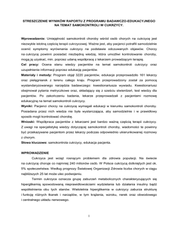 STRESZCZENIE WYNIKÓW RAPORTU Z PROGRAMU BADAWCZO-EDUKACYJNEGO NA TEMAT SAMOKONTROLI W CUKRZYCY. Wprowadzenie: Umiejętność samokontroli choroby wśród osób chorych na cukrzycę jest niezwykle istotną częścią terapii cukrzycowej. WaŜne jest, aby pacjenci potrafili samodzielnie ocenić symptomy wyrównania cukrzycy na podstawie odczuwanych objawów. Chorzy na cukrzycę powinni posiadać niezbędną wiedzę, która umoŜliwi kontrolowanie choroby, mogą ją uzyskać, min. poprzez udaną współpracę z lekarzem prowadzącym terapię. Cel pracy: Ocena stanu wiedzy pacjentów na temat samokontroli cukrzycy oraz uzupełnienie informacji poprzez edukację pacjentów. Materiały i metody: Program objął 3220 pacjentów, edukacje przeprowadziło 161 lekarzy oraz pielęgniarek z terenu całego kraju. Program przeprowadzony został za pomocą wystandaryzowanego narzędzia badawczego: kwestionariusza wywiadu. Kwestionariusz obejmował pytania metryczkowe oraz, składający się z sześciu stwierdzeń, test wiedzy dla pacjentów. Po zakończeniu badania, lekarze przeprowadzali z pacjentami rozmowę edukacyjną na temat samokontroli cukrzycy. Wyniki: Pacjenci chorzy na cukrzycę wymagali edukacji w kierunku samokontroli choroby. Posiadana przez nich wiedza nie była wystarczająca, aby samodzielnie i w prawidłowy sposób mogli kontrolować chorobę. Wnioski: Współpraca pacjentów z lekarzami jest bardzo waŜną częścią terapii cukrzycy. Z uwagi na specjalistykę wiedzy dotyczącej samokontroli choroby, wiadomości te powinny być przekazywane pacjentom przez lekarzy podczas odpowiednio ukierunkowanej rozmowy z chorym. Słowa kluczowe: samokontrola cukrzycy, edukacja pacjenta. WPROWADZENIE Cukrzyca jest wciąŜ rosnącym problemem dla zdrowia populacji. Na świecie na cukrzycę choruje co najmniej 240 milionów osób. W Polsce cukrzycą dotkniętych jest ok. 5% społeczeństwa. Według prognozy Światowej Organizacji Zdrowia liczba chorych w ciągu najbliŜszych 25 lat moŜe ulec podwojeniu. Termin cukrzyca oznacza grupę zaburzeń metabolicznych charakteryzujących się hiperglikemią spowodowaną nieprawidłowościami wydzielania lub działania insuliny bądź współistnienia obu tych stanów. Wieloletnia hiperglikemia w cukrzycy zaburza strukturę i funkcję róŜnych tkanek i narządów, w tym krąŜenia, wzroku, nerek oraz obwodowego i centralnego układu nerwowego. 1 Pomimo ciągłego postępu badań nad cukrzycą jest ona wciąŜ chorobą przewlekłą, wymagającą codziennych zabiegów leczniczych, a przede wszystkim nieuleczalną. Przyczyny zachorowań na cukrzycę nie są do końca znane, duŜą rolę odgrywa dziedziczność, zaburzenia autoimmunologiczne, niezdrowy tryb Ŝycia oraz dieta. W przebiegu choroby często dochodzi do powaŜnych powikłań znacznie wpływających na obniŜenie jakości Ŝycia chorych. Celem leczenia choroby jest dąŜenie do uzyskania prawidłowych lub zbliŜonych do prawidłowych wartości poziomu cukru we krwi. Oprócz mierzenia poziomu cukru we krwi, do oceny stopnia wyrównania cukrzycy słuŜy dodatkowy wskaźnik- hemoglobina glikowana. Jej zwiększona ilość wskazuje na podwyŜszony poziom cukru we krwi. Powszechnie stosowany obecnie schemat podawania insuliny polega na wielokrotnych wstrzyknięciach w ciągu doby, jest to tzw. intensywna insulinoterapia, w której krótkodziałającą insulinę podaje się przed śniadaniem, obiadem, kolacją. Insulinę o pośrednim czasie działania podaje się przed snem oraz zwykle rano. Oprócz wielokrotnych wstrzyknięć insuliny w ciągu doby, drugim sposobem realizacji intensywnej terapii w cukrzycy typu I, jest ciągła, podskórna infuzja insuliny za pomocą pompy insulinowej. Z powyŜszych przyczyn bardzo istotną częścią terapii cukrzycowej jest umiejętność samokontroli cukrzycy. Do zadań pacjenta naleŜy przestrzeganie odpowiedniej diety cukrzycowej oraz utrzymywanie aktywności fizycznej. Najbardziej skomplikowaną częścią samokontroli jest dokonywanie systematycznych pomiarów ciśnienia tętniczego krwi oraz kontrola poziomu cukru we krwi na czczo oraz po spoŜytym posiłku, a takŜe utrzymywanie prawidłowej masy ciała. Dla właściwej samokontroli cukrzycy niezbędne jest notowanie wyników pomiaru oraz czasu pomiaru wobec posiłku. Kolejnymi istotnymi informacjami, które pacjent powinien zanotować są epizody hipoglikemii. WaŜnym parametrem samokontroli jest takŜe oznaczenie poziomu stęŜenia glukozy w moczu. Podczas wizyty lekarza chory powinien zostać poinformowany do jakich celów leczenia powinien dąŜyć, a takŜe otrzymać materiały informacyjne omawiające zasady samokontroli i leczenia choroby. MATERIAŁY I METODY W programie edukacyjno-badawczym wykorzystano kwestionariusz wywiadu, który prócz części sprawdzającej dane społeczno-demograficzne pacjentów, takie jak płeć, wiek, miejsce zamieszkania, czas trwania cukrzycy oraz rodzaj wykonywanej pracy, zawierał sześć stwierdzeń składających się na test wiedzy kierowany do pacjentów. Ponad to zapytano pacjentów o źródła wiedzy na temat choroby oraz ich preferencje dotyczące form edukacji na temat cukrzycy. 2 Test wiedzy polegał na odczytywaniu pacjentowi stwierdzeń dotyczących choroby z prośbą o określenie czy są one prawdziwe, czy fałszywe. Pacjent miał równieŜ moŜliwość wyboru odpowiedzi „nie wiem”. Na podstawie oceny odpowiedzi udzielonych przez pacjenta, lekarz przeprowadzał rozmowę edukacyjną, uzupełniając brakujące informacje. WYNIKI W ogólnopolskim programie badawczo-edukacyjnym na temat samokontroli w cukrzycy przewaŜały kobiety, które stanowiły 52% całej badanej grupy. Ponad 30% chorych stanowili pacjenci w wieku od 61 do 70 lat, najmniejszy odsetek badanych był w wieku poniŜej 25 lat oraz powyŜej 81 lat. Największą grupę tworzyli pacjenci z duŜych oraz średnich miast będący na emeryturze, recie lub niepracujący. Jedna czwarta pacjentów uczestn