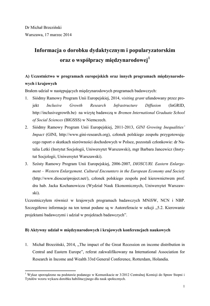Dr Michał Brzeziński Warszawa, 17 marzec 2014 Informacja o dorobku dydaktycznym i popularyzatorskim oraz o współpracy międzynarodowej1 A) Uczestnictwo w programach europejskich oraz innych programach międzynarodowych i krajowych Brałem udział w następujących międzynarodowych programach badawczych: 1. Siódmy Ramowy Program Unii Europejskiej, 2014, visiting grant ufundowany przez projekt Inclusive Growth Research Infrastructure Diffusion (InGRID, http://inclusivegrowth.be) na wizytę badawczą w Bremen International Graduate School of Social Sciences (BIGSSS) w Niemczech. 2. Siódmy Ramowy Program Unii Europejskiej, 2011-2013, GINI Growing Inequalities’ Impact (GINI, http://www.gini-research.org), członek polskiego zespołu przygotowującego raport o skutkach nierówności dochodowych w Polsce, pozostali członkowie: dr Natalia Letki (Instytut Socjologii, Uniwersytet Warszawski), mgr Barbara Jancewicz (Instytut Socjologii, Uniwersytet Warszawski). 3. Szósty Ramowy Program Unii Europejskiej, 2006-2007, DIOSCURI. Eastern Enlargement – Western Enlargement. Cultural Encounters in the European Economy and Society (http://www.dioscuriproject.net/), członek polskiego zespołu pod kierownictwem prof. dra hab. Jacka Kochanowicza (Wydział Nauk Ekonomicznych, Uniwersytet Warszawski). Uczestniczyłem również w krajowych programach badawczych MNiSW, NCN i NBP. Szczegółowe informacje na ten temat podane są w Autoreferacie w sekcji „5.2. Kierowanie projektami badawczymi i udział w projektach badawczych”. B) Aktywny udział w międzynarodowych i krajowych konferencjach naukowych 1. Michał Brzeziński, 2014, „The impact of the Great Recession on income distribution in Central and Eastern Europe”, referat zakwalifikowany na International Association for Research in Income and Wealth 33rd General Conference, Rotterdam, Holandia. 1 Wykaz sporządzono na podstawie podanego w Komunikacie nr 3/2012 Centralnej Komisji do Spraw Stopni i Tytułów wzoru wykazu dorobku habilitacyjnego dla nauk społecznych. 1 2. Michał Brzeziński, 2013, „Nierówności w Polsce na tle krajów Unii Europejskiej”, IX Kongres Ekonomistów Polskich, Warszawa. 3. Michał Brzeziński, 2013, „Do wealth distributions follow power laws? Evidence from the ‘rich lists’”, 5th Meeting of the Society for the Study of Economic Inequality, Bari, Włochy. 4. Michał Brzeziński, 2013, “Modelling income distribution in Central and Eastern Europe”, Modelowanie i prognozowanie gospodarki narodowej, Sopot. 5. Michał Brzeziński, 2013, “Rising inequalities and their impact in Poland and the Baltic states”, GINI Growing Inequalities’ Impact Final Conference, Amsterdam, Holandia. 6. Michał Brzeziński, 2012, “Assessing goodness of fit of income distribution models”, 3rd Polish Stata Users Group Meeting, Warszawa. 7. Michał Brzeziński, 2012, “Do wealth distributions follow power laws? Evidence from the `rich lists’”, International Association for Research in Income and Wealth 32nd General Conference, Boston, USA. 8. Michał Brzeziński, 2012, “Inequalities in Poland – data availability and research limitations”, GINI Growing Inequalities’ Impact Mid-term Conference, Budapeszt, Węgry. 9. Michał Brzeziński, 2011, “Pro-poor growth in Poland: contrasting cross-sectional and longitudinal perspectives”, Statystyka i jej zastosowania w badaniach społecznoekonomicznych, Łódź. 10. Michał Brzeziński, 2011, „Has recent economic growth in Poland been pro-poor?”, 4th Meeting of the Society for the Study of Economic Inequality, Catania, Włochy. 11. Michał Brzeziński, 2011, “Doświadczenia z publikacji w czasopismach zagranicznych”, Konferencja Wydziałowa WNE UW, Kazimierz Dolny. 12. Michał Brzeziński, 2008, „Nierówność, polaryzacja i wielkość klasy średniej w Polsce w latach 1994-2006”, Konferencja Wydziałowa WNE UW, Cedzyna. 13. Michał Brzeziński, Marian Gorynia, Zbigniew Hockuba, 2007, „Między imperializmem a kooperacją. Ekonomia a inne nauki społeczne na początku XXI wieku”, VIII Kongres Ekonomistów Polskich, Warszawa. 14. Zbigniew Hockuba, Michał Brzeziński, 2006, „Czas w procesie transformacji gospodarczej”, Wkład transformacji do teorii ekonomii, Warszawa. 15. Zbigniew Hockuba, Michał Brzeziński, 2004, „Oskara Langego syntezy teorii ekonomicznych”, Współczesne modele gospodarki a myśl Oskara Langego – w stulecie urodzin wielkiego polskiego uczonego, Warszawa. 16. Zbigniew Hockuba, Michał Brzeziński, 2004, „”Ekonomia polityczna” Oskara Langego”, Czym jest ekonomia polityczna dzisiaj?, Warszawa. 2 17. Michał Brzeziński, 2002, „Wpływ nierówności dochodowej na dobrobyt społeczny w Polsce w latach 1989-1997”, Konferencja Wydziałowa WNE UW, Kazimierz Dolny. 18. Michał Brzeziński, 2001, „Czy egalitaryzm jest wykonalny?”, Dokonania współczesnej myśli ekonomicznej. Teorie ekonomiczne a polityka gospodarcza państwa, Wisła. 19. Michał Brzeziński, 2000, „Koncepcja sprawiedliwości Johna Rawlsa a teoria ekonomii”, Konferencja Wydziałowa WNE UW, Kazimierz Dolny. Chciałbym również poinformować, że wygłosiłem również następujące referaty na seminariach naukowych: 1. Michał Brzeziński, 2013, „Income polarization and economic growth”, Research Seminar in Economics, Free University of Berlin, Berlin, Niemcy. 2. Michał Brzeziński, 2012, „Income polarization and economic growth”, seminarium Narodowego Banku Polskiego, Warszawa. 3. Michał Brzeziński, 2012, „Inequalities and their impact in Poland”, GINI Growing Inequalities’ Impact Country Reports Workshop, Amsterdam, Holandia. C) Udział w komitetach organizacyjnych międzynarodowych i krajowych konferencji naukowych Brak. D) Otrzymane nagrody i wyróżnienia 1. Nagroda trzeciego stopnia Rektora Uniwersytetu Warszawskiego, 2011. 2. Nagroda Prezesa Narodowego Banku Polskiego za najlepszy artykuł opublikowany w “Banku i K