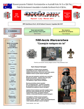 Rok 2011 Nr. 400 Brisbane Qld Wydanie 01/11 Styczeń - Luty - Marzec 2011 SPK Sub-Branch No 8, 44-54 Holland Crescent, Capalaba Qld 4157 W NUMERZE *** Serwis informacyjny co się dzieje w Brisbane i w Kole SPK Nr 8 Nasze życie jest takim, jakim uczyniły je nasze myśli. Bez cierpienia, nie rozumie się szczęścia. Marek Aureliusz Fiodor Dostojewski 100-lecie Harcerstwa “Czuwajcie następne sto lat” *** ********* Harcerze w podziemiu ******** Kącik Kulinarny ********* *** Pomnik ku czci harcerek i harcerzy poległych podczas II Wojny Światowej w Łodzi. Wojsko na wesoło ********* Two Pilots ********* ***** Jak powstawała nasza website Hymn Szarych Szeregów I iść będziemy w Polskę szarymi szeregami, I będzie Bóg nad nami, i będzie Naród z nami... I będziem szli, jak hymny, skroś wsi, skroś miast, polami, I będziem równać w prawo szarymi szeregami... ***** ********* Gdy rzucą nam wyzwanie z zachodu czy ze wschodu, Ruszymy do pochodu – Zawisza miecz nam poda, Zatętni ziemia twardo gąsienic kopytami I iść będziemy w ogień szarymi szeregami. ********* **** Rozniosą się fanfary echami wysokimi Hen, po piastowej ziemi – szumami husarskimi. Za nami pójdzie Naród z Orłem, ze sztandarami, Powiedziem go szpalerem szarymi szeregami. Opłatek Capalaba 2010 Sylwester 2010 w Kole SPK Nr 8 ***** ********* Wiadomości – Ciekawostki ********* ***** I będziem Gmach budować rycerskim zwykłym bojem, Otworzym wszerz podwoje dla trudu, dla Pokoju I będzie Polska młodą, my będziem Polakami I staniem w straż przed Gmachem szarymi szeregami. I iść będziemy z Polską szarymi szeregami, I będzie Bóg nad nami, i będzie Naród z nami, I będziem trwać – kamienie – wzdłuż dróg drogowskazami, I wieść będziemy Młodych szarymi szeregami. Tomek Jaźwiński – phm “Julek”. Pomnik Małego Powstańca w Warszawie. Styczeń – Luty – Marzec 2011 Str 2 Zarząd Koła SPK Nr 8 Prezes Wice-Prezes Sekretarz Skarbnik Z-ca Skarbnika Gospodarz Zdzisław Koch Jan Tkaczyk Maria Lorenc Maria Kołodko Grażyna Kuczyńska Stanisław Lorenc 3821 0372 3260 6399 3349 2340 Reprezentant Koła Nr 8 Townsville Gold Coa st Br. J.Miller-Patajewicz Janusz Porębski Czesław Rudnik-Rogers Beata Mroczek Adam Kuczyński 4724 1161 5578 7382 Renata Dźwig Przewodnicząca Ula Daniels hm 0413 942 907 Hufiec Żeński Ola Karwaj pwd 0421 334 504 Hufiec Męski Tomek Karbanowicz pwd 0413 333 430 Inne Organizacje Polskie Czesław Rudnik-Rogers 3273 4565 Jan Tkaczyk Andrzej Dźwig Alfred Choroszyński Eugeniusz Kwiatkowski Walter Olszewski Wiktor Wołodźko Witold Kuczyński 3369 2747 Prezes 3389 0000 3823 1738 Major General Michael Jeffery, AC, AO (Mil), CV O, MC (Retd) PO Box 3162, Manuka ACT 2603 Honorowy Konsul R.P. w Brisbane 3221 9564 3398 1018 Kapelan Koła Nr 8 Ksiądz Proboszcz Przemysław Karasiuk SChr Plebania: (07) 3252 2200 Mobile: 0404 085 041 Ksiądz Wiesław Pawłowski: Mobile: 0419 615 472 Wydaje: Zarząd Koła SPK Nr 8 Redaktor Naczelny: Krystyna Tkaczyk Nasz adres: PO Box 1211 Capalaba Qld 4157 Tel: 07 3390 1640 02 6241 4501 Polonia – Milton Patron SPK Koła Nr 8 A/h Andrzej Alwast 3395 1955 3219 0341 3351 6578 3260 6399 3261 8854 3207 1821 Zarząd Krajowy SPK Brian Kilmartin Rada Naczelna Polonii Australijskiej Prezes Poczet Sztandarowy Prezes 07 3219 0341 Harcerstwo ZHP Obwód “Pomorze” Łącznik Koła Nr 8 Chorąży Za stępca Asystenci 3273 4565 33904037 0407 596 547 Polska Szkoła Sobotnia Bowen Hills Komisja Rewizyjna Koła Nr 8 Przewodniczący: Janina Kłoda Członkowie: Eugeniusz Kwiatkowski Andrzej Olszanowski Członkowie Zarządu 3824 5108 3395 1955 3390 1705 3245 4389 3823 1738 3390 1705 Leszek Wikariusz Stow. im. T. Kościuszki - Darra 3288 5031 Radio 4EB Centrala Ula Nadstazik 3240 8600 3311 6450 Koło Polek Barbara Andruczyk 3822 4263 Polska Parafia Bowen Hills 3252 2200 Siostry Mi sjonarki Chrystusa Króla 3855 3772 “DIVERSICARE” Rządowa Pomoc dla Osób Starszych Wiesława Dróżdż 3846 1099 Polski Klub Seniorów Przewodnicząca Helena Podbereźny 3300 5130 “OZPOL” Community Care Assoc. Irena Biedak 3211 3833 Ogłoszenia drobne - $10 Większe - cena do uzgodnienia. Redakcja zastrzega sobie prawo do korekty i skrótów nadsyłanych tekstów. Styczeń – Luty – Marzec 2011 Str 3 Harcerze w podziemiu. Trzydzieści tysięcy młodych ludzi działało w Szarych Szeregach. Listonoszki Harcerskiej Poczty Polowej. Harcerze Szarych Szeregów. W czasie II wojny światowej ZHP działał w konspiracji pod pseudonimem Szare Szeregi, organizując m.in. mały sabotaż, walcząc w powstaniu warszawskim (1944). Działalność harcerzy biorących udział w walce zbrojnej upamiętnia pomnik Małego Powstańca na warszawskim Starym Mieście. Szare Szeregi powstały 27 września 1939 roku. Była to konspiracyjna struktura harcerska, działająca na ziemiach polskich w okresie okupacji niemieckiej. Pierwszym naczelnikiem Szarych Szeregów został Florian Marciniak. Harcerze działali w powiązaniu z Delegaturą Rządu na Kraj i Komendą Główną Armii Krajowej. Młodsi harcerze brali udział w akcjach małego sabotażu i roznosili pocztę, starsi uczestniczyli w działalności dywersyjnej i w akcjach zbrojnych. Do najważniejszych akcji Szarych Szeregów należało odbicie w 1943 roku transportu więźniów do Auschwitz i zamach na komendanta warszawskiej policji i SS Franza Kutscherę w 1944 roku. W 70. rocznicę powstania Szarych Szeregów, druh Janusz Badura, który w czasie wojny służył w mokotowskim bloku "Radiostacja", wspominał, że w Warszawie harcerze prowadzili pracę wywiadowczą. Anna Mizikowska pseudonim "Grażka" była łączniczką batalionu "Parasol", między innymi brała udział w walkach o pałacyk Michla. Wspominając czas konspiracji, podkreśliła, że dla harcerzy najważniejszym zadaniem zawsze była nauka, zarówno podczas wojny, jak i obecnie - w czasie pokoju. W okresie najpełniejszego rozwoju Szarych Szeregów, Główna Kwa