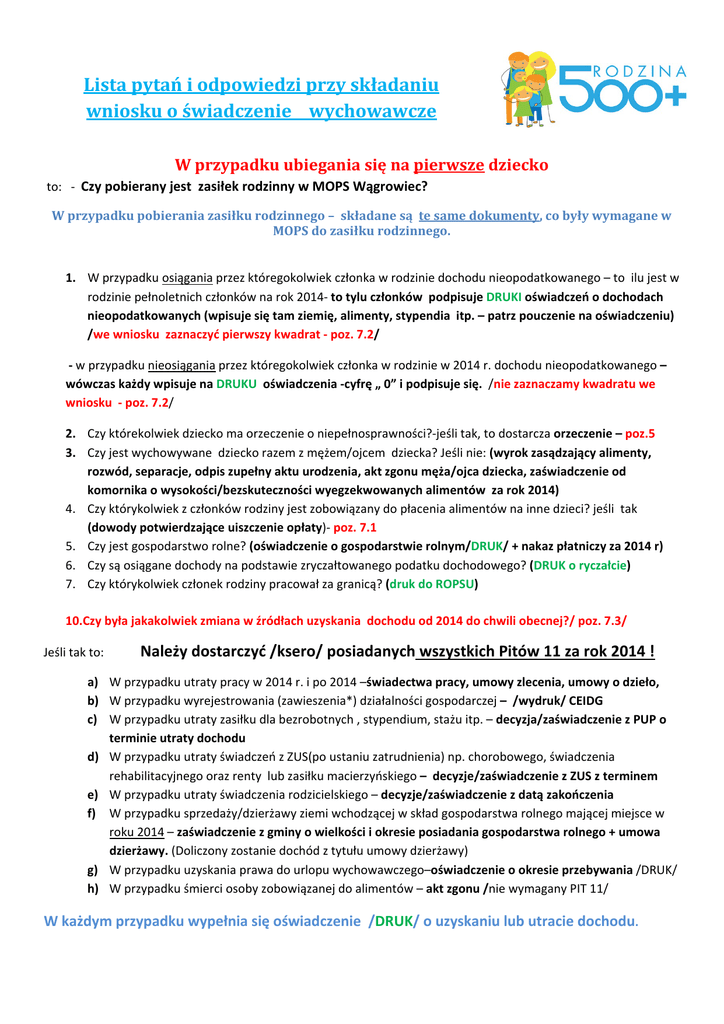 Listapytańiodpowiedziprzyskładaniu wnioskuoświadczeniewychowawcze Wprzypadkuubieganiasięnapierwszedziecko to: ‐ Czy pobierany jest zasiłek rodzinny w MOPS Wągrowiec? Wprzypadkupobieraniazasiłkurodzinnego–składanesątesamedokumenty,cobyływymaganew MOPSdozasiłkurodzinnego. 1. W przypadku osiągania przez któregokolwiek członka w rodzinie dochodu nieopodatkowanego – to ilu jest w rodzinie pełnoletnich członków na rok 2014‐ to tylu członków podpisuje DRUKI oświadczeń o dochodach nieopodatkowanych (wpisuje się tam ziemię, alimenty, stypendia itp. – patrz pouczenie na oświadczeniu) /we wniosku zaznaczyć pierwszy kwadrat ‐ poz. 7.2/ ‐ w przypadku nieosiągania przez któregokolwiek członka w rodzinie w 2014 r. dochodu nieopodatkowanego – wówczas każdy wpisuje na DRUKU oświadczenia ‐cyfrę „ 0” i podpisuje się. /nie zaznaczamy kwadratu we wniosku ‐ poz. 7.2/ 2. Czy którekolwiek dziecko ma orzeczenie o niepełnosprawności?‐jeśli tak, to dostarcza orzeczenie – poz.5 3. Czy jest wychowywane dziecko razem z mężem/ojcem dziecka? Jeśli nie: (wyrok zasądzający alimenty, rozwód, separacje, odpis zupełny aktu urodzenia, akt zgonu męża/ojca dziecka, zaświadczenie od komornika o wysokości/bezskuteczności wyegzekwowanych alimentów za rok 2014) 4. Czy którykolwiek z członków rodziny jest zobowiązany do płacenia alimentów na inne dzieci? jeśli tak (dowody potwierdzające uiszczenie opłaty)‐ poz. 7.1 5. Czy jest gospodarstwo rolne? (oświadczenie o gospodarstwie rolnym/DRUK/ + nakaz płatniczy za 2014 r) 6. Czy są osiągane dochody na podstawie zryczałtowanego podatku dochodowego? (DRUK o ryczałcie) 7. Czy którykolwiek członek rodziny pracował za granicą? (druk do ROPSU) 10.Czy była jakakolwiek zmiana w źródłach uzyskania dochodu od 2014 do chwili obecnej?/ poz. 7.3/ Jeśli tak to: Należy dostarczyć /ksero/ posiadanych wszystkich Pitów 11 za rok 2014 ! a) W przypadku utraty pracy w 2014 r. i po 2014 –świadectwa pracy, umowy zlecenia, umowy o dzieło, b) W przypadku wyrejestrowania (zawieszenia*) działalności gospodarczej – /wydruk/ CEIDG c) W przypadku utraty zasiłku dla bezrobotnych , stypendium, stażu itp. – decyzja/zaświadczenie z PUP o terminie utraty dochodu d) W przypadku utraty świadczeń z ZUS(po ustaniu zatrudnienia) np. chorobowego, świadczenia rehabilitacyjnego oraz renty lub zasiłku macierzyńskiego – decyzje/zaświadczenie z ZUS z terminem e) W przypadku utraty świadczenia rodzicielskiego – decyzje/zaświadczenie z datą zakończenia f) W przypadku sprzedaży/dzierżawy ziemi wchodzącej w skład gospodarstwa rolnego mającej miejsce w roku 2014 – zaświadczenie z gminy o wielkości i okresie posiadania gospodarstwa rolnego + umowa dzierżawy. (Doliczony zostanie dochód z tytułu umowy dzierżawy) g) W przypadku uzyskania prawa do urlopu wychowawczego–oświadczenie o okresie przebywania /DRUK/ h) W przypadku śmierci osoby zobowiązanej do alimentów – akt zgonu /nie wymagany PIT 11/ W każdym przypadku wypełnia się oświadczenie /DRUK/ o uzyskaniu lub utracie dochodu. 11. Czy było uzyskanie dochodu począwszy od 2014 r. (gdy nastąpiło po 01.01.2014r.) do chwili obecnej? Jeśli tak to: Należy dostarczyć /ksero/posiadanych wszystkich Pitów 11 za rok 2014! a) W przypadku podjęcia nowej pracy(w 2015 r. i 2016 r.) –/ DRUK/ – Zaświadczenie od pracodawcy o dochodzie za miesiąc następny od miesiąca zatrudnienia, b) W przypadku zmian w zatrudnieniu jeszcze w 2014 r. – umowy o pracę, zlecenia, o dzieło c) W przypadku uzyskania zasiłku dla bezrobotnych, stażu itp. w 2014 r.– decyzja/zaświadczenie z PUP o okresie pobierania tego zasiłku. d) W przypadku uzyskania zasiłku dla bezrobotnych, stażu itp. po 2014 r. – zaświadczenie z PUP o wysokości tego zasiłku netto za miesiąc następny, po miesiącu uzyskania prawa do tego zasiłku e) W przypadku uzyskania zasiłku chorobowego, świadczenia rehabilitacyjnego, zasiłku macierzyńskiego z ZUS ‐ po ustaniu zatrudnienia (w 2015 i 2016 r.) ‐ zaświadczenie z ZUS o wysokości tego świadczenia netto za następny miesiąc po miesiącu uzyskania go, wraz z okresem od kiedy nabył prawo. f) W przypadku uzyskania prawa do renty z ZUS – zaświadczenie z ZUS o wysokości renty za następny miesiąc po miesiącu uzyskania prawa do niej. g) W przypadku uzyskania prawa do świadczenia rodzicielskiego z MOPS – decyzję o terminie i wysokości świadczenia za następny miesiąc po miesiącu uzyskania prawa do niego. h) W przypadku rozpoczęcia działalności gospodarczej w roku 2014 – druk CEIDG i) W przypadku rozpoczęcia działalności gospodarczej po roku 2014 – druk CEIDG oraz / DRUK/ ‐ oświadczenia o dochodzie uzyskanym za miesiąc następny po miesiącu rozpoczęcia działalności j) W przypadku nabycia/dzierżawy gospodarstwa rolnego w roku 2014 –zaświadczenie z gminy o okresie posiadania gospodarstwa i ha przeliczeniowych w poszczególnych miesiącach roku. k) W przypadku zakończenia urlopu wychowawczego po roku 2014 ‐ /DRUK/ ‐ zaświadczenie od pracodawcy o dochodzie za miesiąc następny po miesiącu powrotu do pracy l) W przypadku uzyskania przez rolnika zasiłku macierzyńskiego ‐ zaświadczenie z KRUS o wysokości zasiłku za miesiąc następny, po miesiącu uzyskania oraz okresie pobierania do. W przypadku wystąpienia zmian w dochodzie w trakcie pobierania świadczenia wychowawczego – należy NIEZWŁOCZNIE powiadomić organ prowadzący (pok. nr 1 w Urzędzie Miejskim w Wągrowcu). Dotyczy to również zmian dotyczących liczby członków, miejsca zamieszkania czy śmierci osoby wnioskującej. DOCHODY NIEUWZGLĘDNIANE PRZY OBLICZANIU W USTALANIU PRAWA DO ŚWIADCZENIA WYCHOWAWCZEGO Alimenty zasądzone po roku bazowym /2014/ Uzyskanie prawa do funduszu alimentacyjnego po roku bazowym /2014/ Ziemia nabyta, wydzierżawiona ‐ po roku bazowym / 2014/ Świadczenia rodzinne z dodatkami /