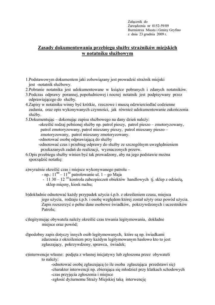 Załącznik do Zarządzenia nr 0152-59/09 Burmistrza Miasta i Gminy Gryfino z dnia 23 grudnia 2009 r. Zasady dokumentowania przebiegu służby strażników miejskich w notatniku służbowym 1.Podstawowym dokumentem jaki zobowiązany jest prowadzić strażnik miejski jest -notatnik służbowy. 2.Pobranie notatnika jest udokumentowane w książce pobranych i zdanych notatników. 3.Podczas odprawy porannej, popołudniowej i nocnej notatnik jest podpisywany przez odprawiającego do służby. 4.Zapisy w notatniku winny być krótkie, rzeczowe i muszą odzwierciedlać codzienne zadania, oraz opis wykonywanych czynności, jak również udokumentowanie zakończenia służby. 5.Dokumentując – dokonując zapisu służbowego na dany dzień należy: -określić rodzaj pełnionej służby np. patrol pieszy, patrol pieszo – zmotoryzowany, patrol zmotoryzowany, patrol mieszany pieszy, patrol mieszany pieszo – zmotoryzowany, patrol mieszany zmotoryzowany. -odnotować osobę odprawiającą do służby -odnotować czas i przebieg odprawy do służby ze szczególnym uwzględnieniem przekazanych zadań do realizacji, wyznaczonych przerw. 6.Opis przebiegu służby winien być tak prowadzony, aby na jego podstawie można sporządzić notatkę: a)wyraźnie określić czas i miejsce wykonywanego patrolu – - np.: 1100 – 1130 patrolowanie ul. 1 – go Maja - 11 30 – 12 10 kontrola zabezpieczeń obiektów handlowych tj. sklep z odzieżą, sklep mięsny, kiosk ruchu; b)dokładnie odnotować każdy przypadek użycia ś.p.b. z określeniem czasu, miejsca jego użycia, rodzaju ś.p.b. i osobę względem której został użyty oraz powód użycia. Zapis rozszerzyć o pełne dane osobowe świadków, pokrzywdzonych i uczestników Patrolu; c)legitymując obywatela należy określić czas trwania legitymowania, dokładne miejsce oraz powód; d)podobny zapis dotyczy innych osób legitymowanych, które są np. świadkami zdarzenia z określeniem przy każdym legitymowanym hasłowo kto to jest: zgłaszający, pokrzywdzony, sprawca, świadek; e)interwencje własne: podjęta z własnej inicjatywy lub zgłoszona przez obywateli to należy: -odnotować osobę zgłaszającą (o ile osoba zgłaszająca przedstawi się) -charakter interwencji np. zbierająca się młodzież przy klatkach schodowych -czas przyjęcia zgłoszenia i miejsce -zgłosić dyżurnemu Straży Miejskiej taką interwencję -po zakończeniu interwencji lub w trakcie jej trwania na bieżąco opisywać wykonywane czynności -formę zakończenia interwencji ( pouczono, nałożono mandat karny, skierowano sprawę do Sadu Grodzkiego) -podać osobę i z jakiego powodu -sporządzić notatkę z godz. zakończenia interwencji i z zapisem o dalszym wykorzystaniu f)interwencje zlecone z KPP -wszystko jw. z dopiskiem, który dyżurny np. Dyżurny KPP asp. Kowalski g)kontrolując obiekty handlowe, gastronomiczne, szkoły, przedszkola oraz inne obiekty a także parkingi itp. Należy uwzględnić mankamenty występujące bezpośrednio w rejonie kontrolowanych obiektów np. awaria oświetlenia h)nakładając mandat karny, pouczenie lub skierowanie sprawy do Sądu Grodzkiego należy: -odnotować powód jego nałożenia, pouczenia lub skierowania do Sądu Grodzkiego -godz. nałożenia mandatu lub pouczenia -artykuł kodeksu wykroczeń z którego nałożono mandat, pouczono lub skierowano wniosek o ukaranie do Sądu Grodzkiego -odnotować formę mandatu np. kredytowany, gotówkowy, zaoczny i)wykonując inne czynności np. udzielenie pomocy komornikowi należy odnotować w notatniku komu jej udzielono, na czyje polecenie, w jakim czasie i miejscu oraz jej przebieg j)przerwa własna w służbie, odnotować przerwę w notatniku służbowym i zapisać czas trwania przerwy od 11.00 – 11.30 i miejsce odbywania przerwy. Fakt przerwy zgłosić dyżurnemu. k)wpisywać do notatnika każde auto, które jest zaparkowane w miejscu do tego niedozwolonym, a którego kierowca został poproszony o złożenie wyjaśnień w siedzibie Straży Miejskiej. 7.Kończąc służbę należy: a) wpisać godzinę zejścia lub zjazdu z rejonu służbowego i zgłosić ten fakt dyżurnemu b) podsumować uzyskane wyniki – efekty służby np. -legitymowano osób -pouczono osób -z art. 117 -z art. 10.2 -z art. 97 ogółem osób pouczono -6 -nałożono MKK -z art. 92 §1 -z art. 145 ogółem 2 mandaty na kwotę 200 zł -przeprowadzono kontroli porządkowych -usunięto pojazdów -8 -2 -3 -1 -1 – 100 zł -1 - 100 zł -3 -2 -notatek służbowych -3 -sporządzono kart Mrd 5/2 -1 c)notatnik służbowy z opisanym rozliczeniem i notatkami z dnia pracy przedłożyć osobie rozliczającej służbę, która potwierdza podpisem zakończenie służby d)zapis kończący służbę: np. 22.00 – koniec służby. 8.Po zakończeniu służby notatnik jest zamykany w kasetce. Wzór do służby Data i godzina Zdarzenia i opis służby Dokumentacja własna – stan aktualny 1.bloczek mandatu karnego od nr ............. do nr ............ liczba odcinków............ 7.00: 8.00 Wyjście w rejon szkół Odprawa u Komendanta Straży Miejskiej lub odprawa w KPP Gryfino rejon służby ( podać ulice) 8.00: 8.20 zadania w rejonie potwierdzenie o odprawie – podpis odprawiającego i pieczątka Wyjście w rejon objęty ulicami: ( ) 8.20 patrolowanie z uwzględnieniem czystości i ładu Interwencja własna 8.35: 9.00 Wykroczenie porządkowe ; chodnik zaśmiecony papierami przy ul. Lechickiej 88 Ustaliłem osobę odpowiedzialną za utrzymanie porządku, osobą tą okazała się Wioletta Bryn c. Stanisława ur. 12. 11. 1961 w Gliwicach zam. Gryfino ul. Lechicka 88/1 w/w pouczyłem lub nałożyłem mandat karny z art. .......... w kwocie ................... Interwencje zakończyłem o godz. 9.00 9.00: 9.10 Kontrola czystości przy sklepie spożywczym „Margo” przy ul. Przytulnej – bez uwag Interwencja zlecona przez dyżurnego Straży Miejskiej – Jarosława Ignatowicza o godz. 9.10 w Gryfinie przy ul. Energetyków 3 bloku
